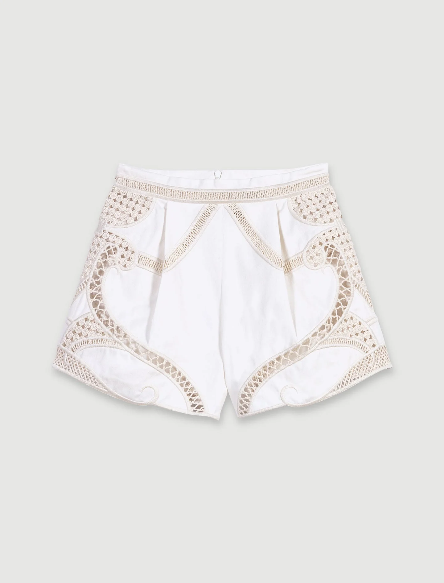 La nueva colección da la bienvenida a materiales naturales que se mezclan con tonos suaves para crear prendas cotidianas. Una brisa ligera inspira este short de sarga de algodón que seduce con su corte tulipán y sus cuidados detalles. Con cierre de cremallera en el espalda y pliegues planos, este short presenta motivos de ganchillo que dejan entrever delicadamente la piel.Elegante y ligero, se combina perfectamente con un cárdigan y sandalias de plataforma para un look chic e informal.Ref.: MFPSH00551