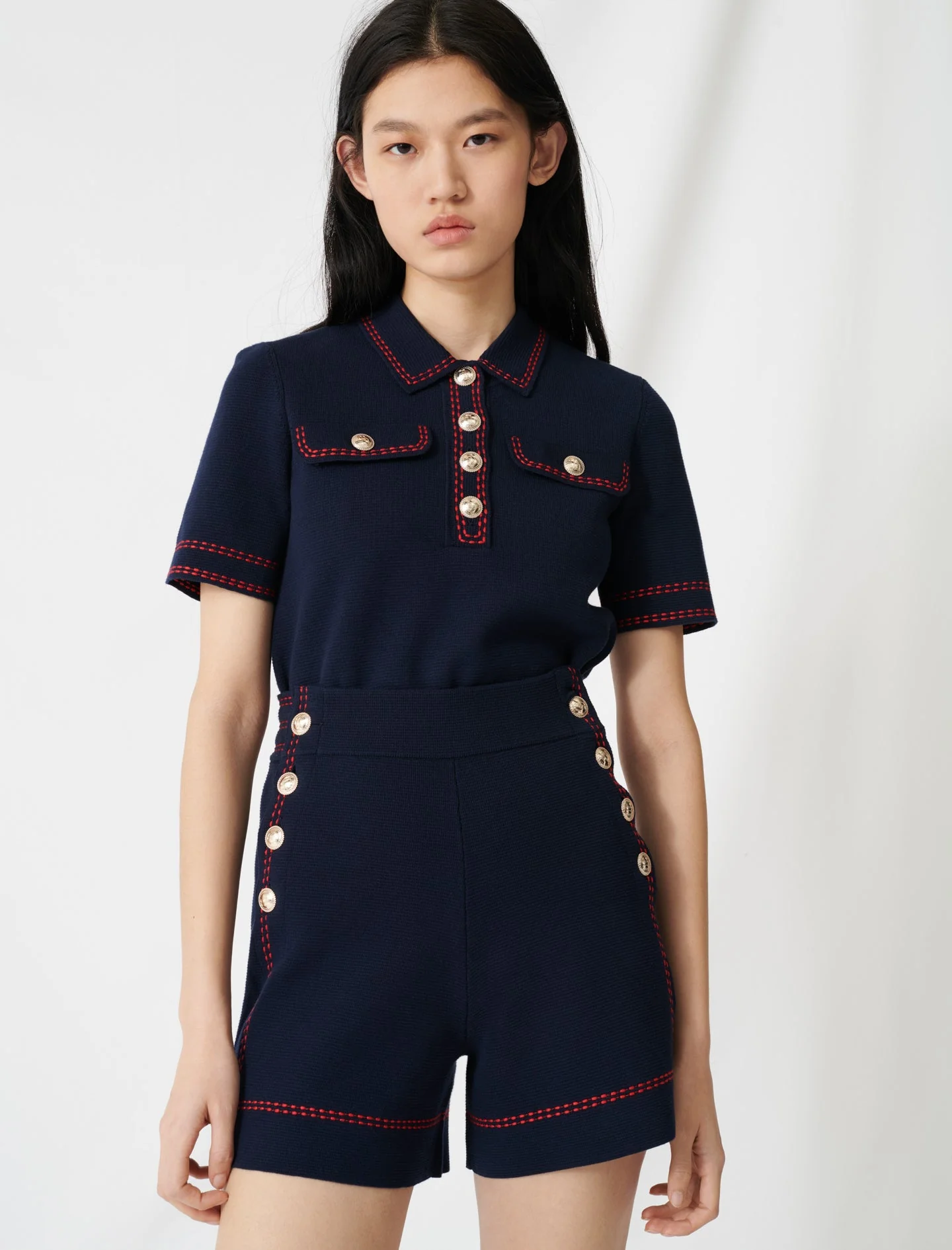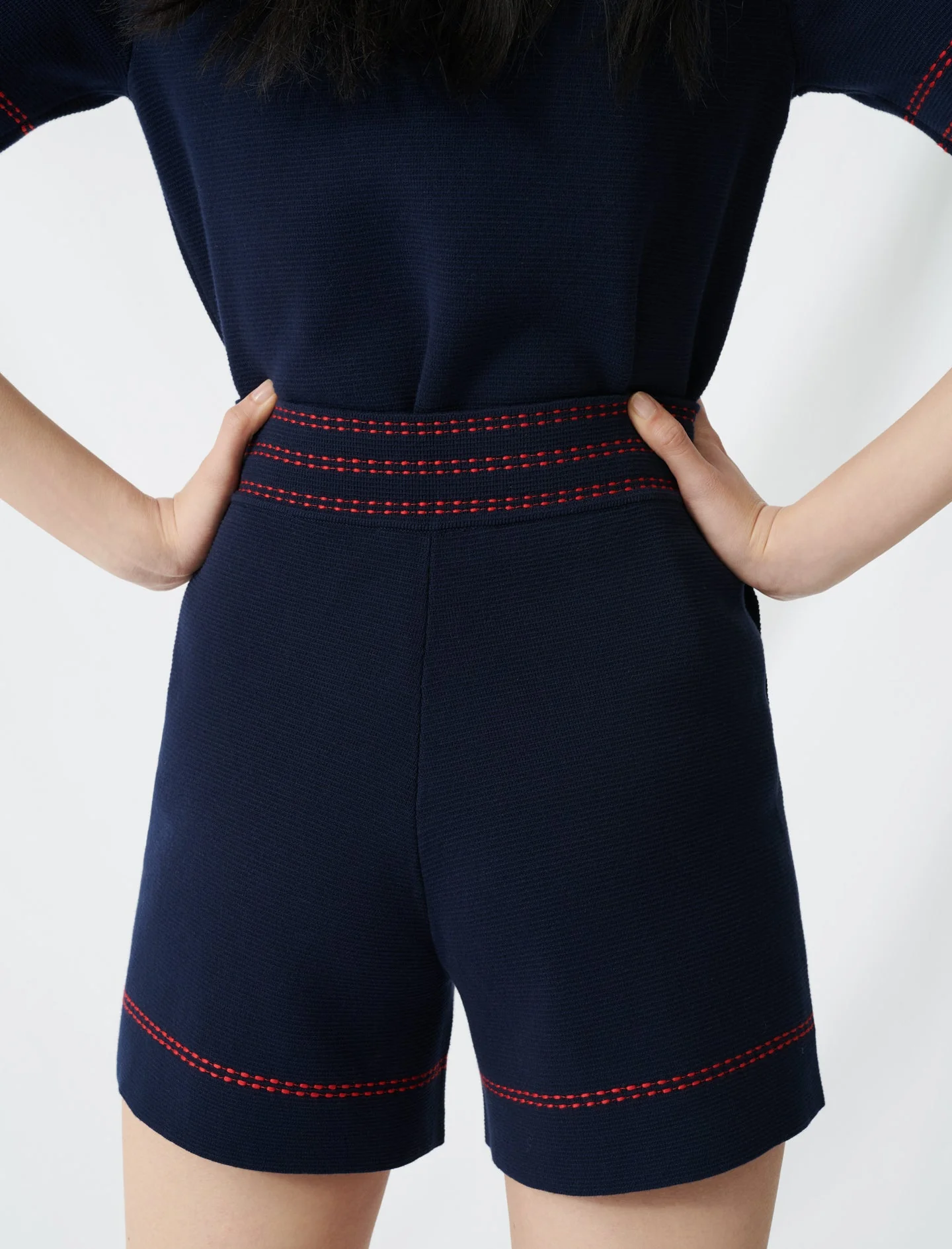 Shorts de punto azul marino de tiro alto con pespuntes rojos. Cuatro botones plateados se colocan en cada cadera. Para un estilo náutico bien pensado, úselo con el polo a juego.