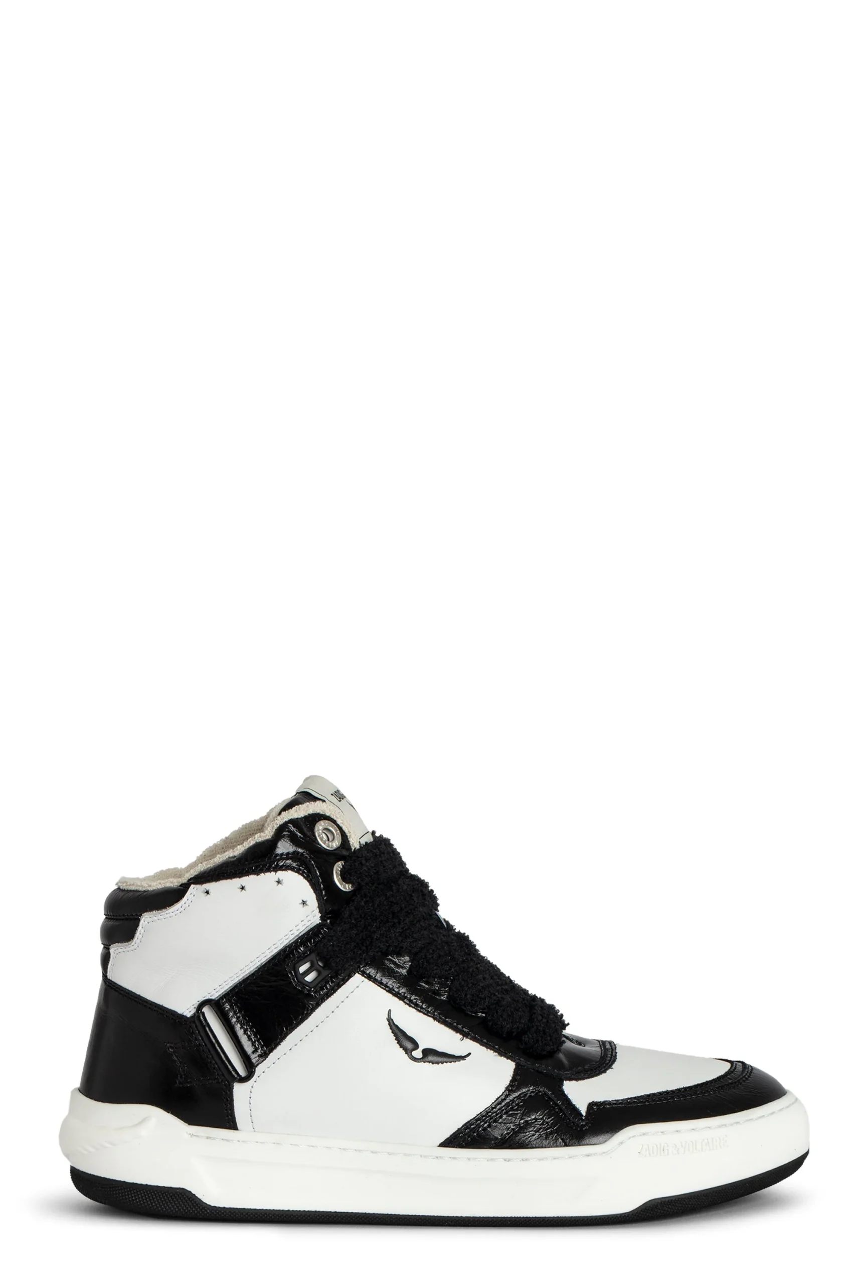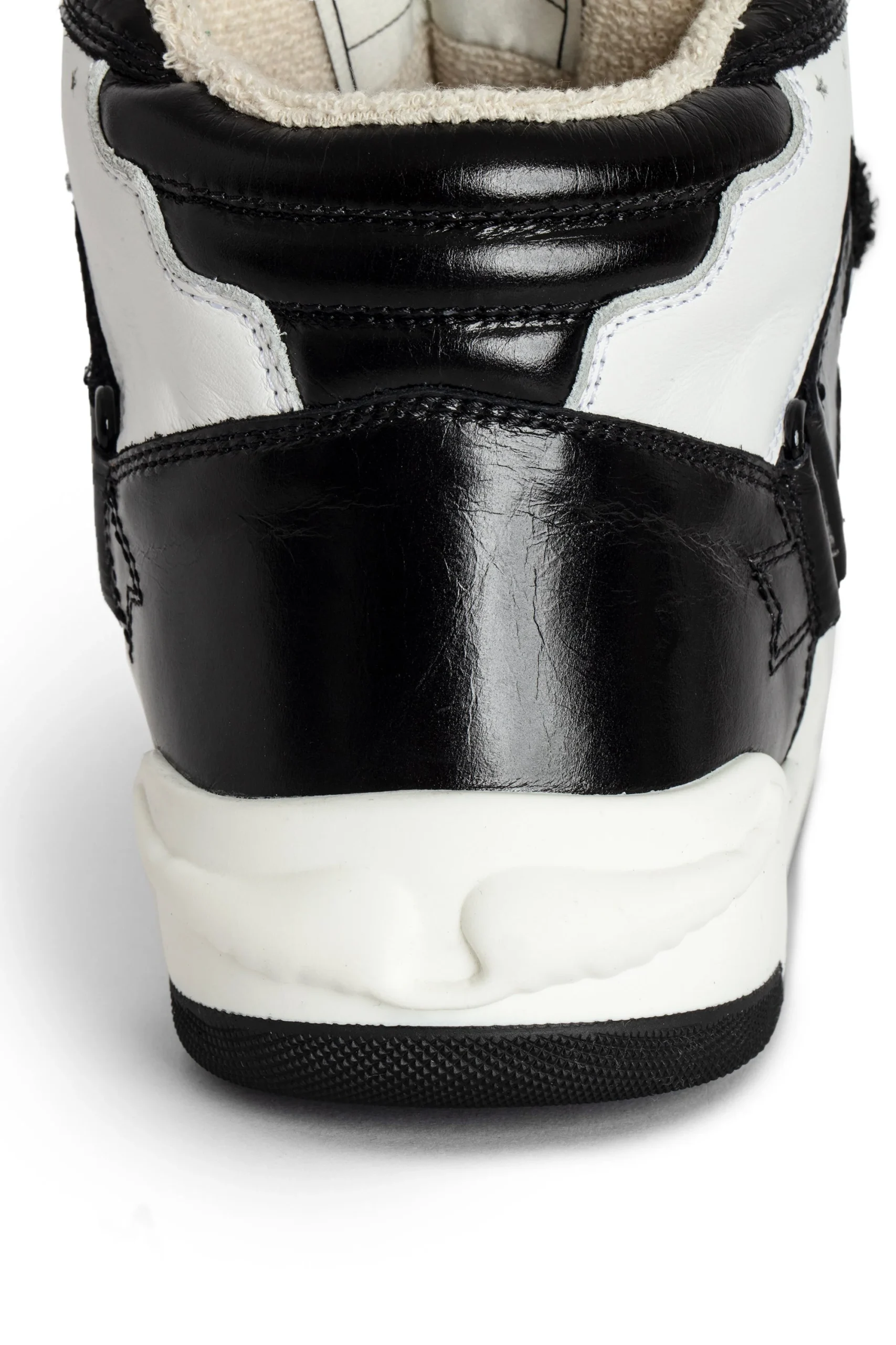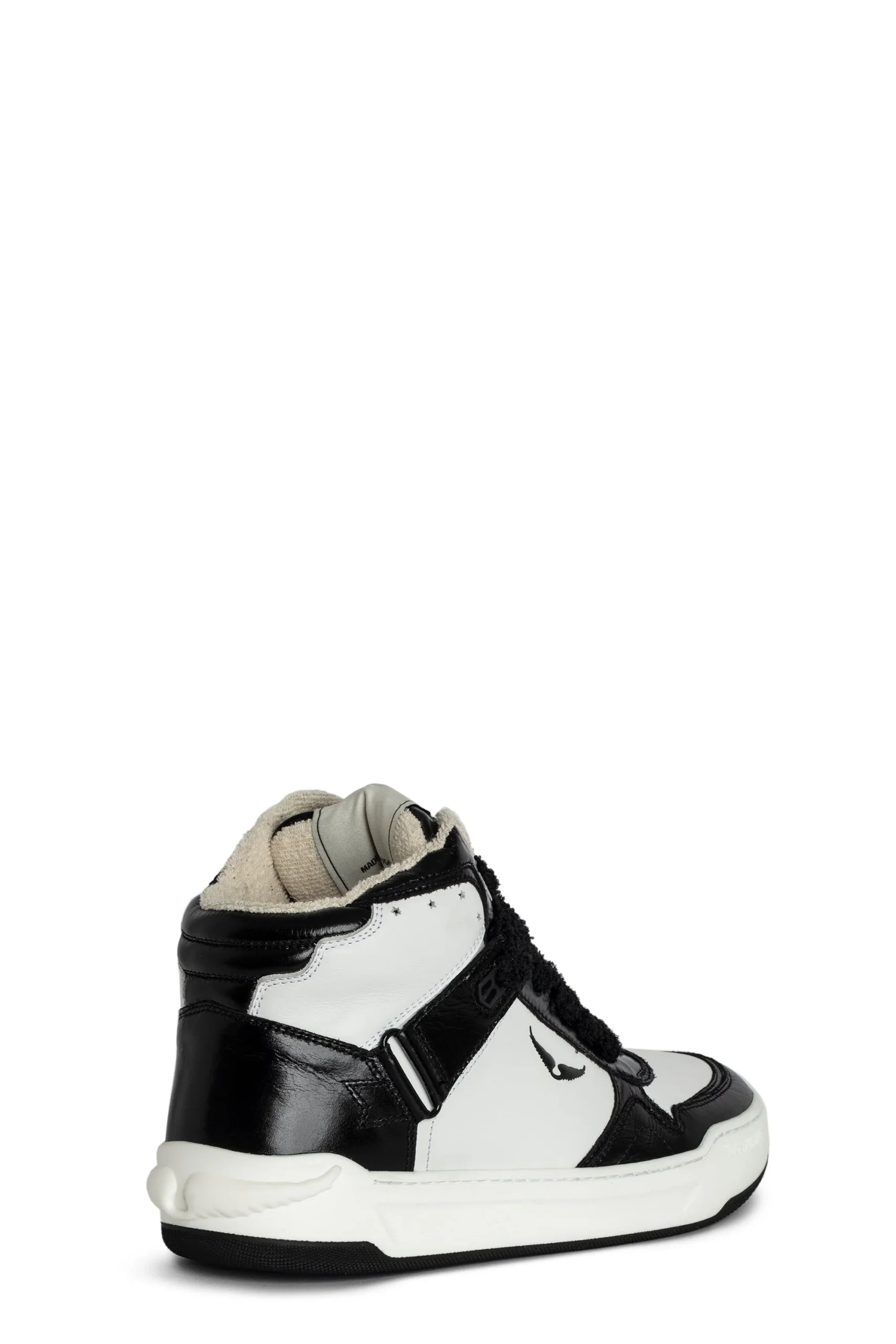 Zapatillas altas de piel lisa blanca, con inserciones de piel vintage negra y alas características. Estas zapatillas están fabricadas con materiales de menor impacto ambiental.