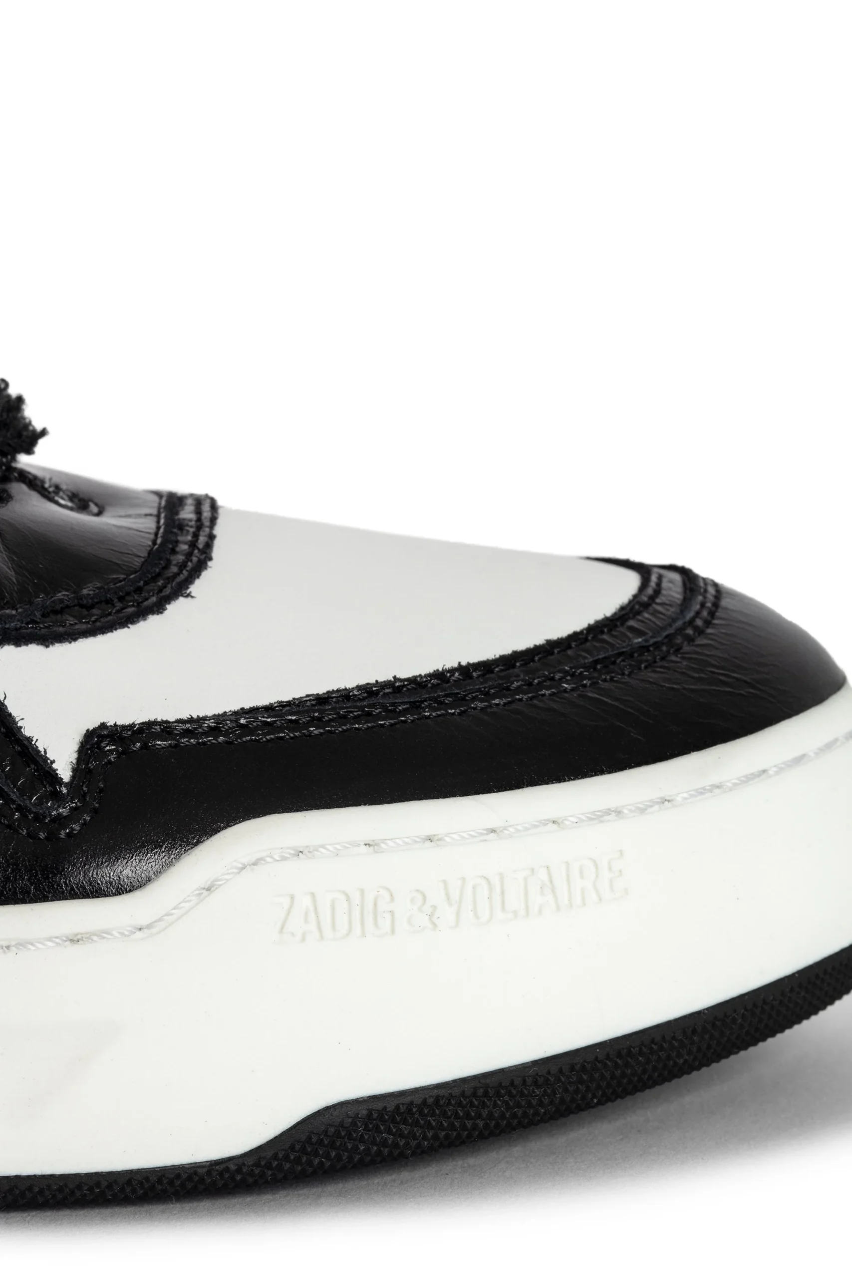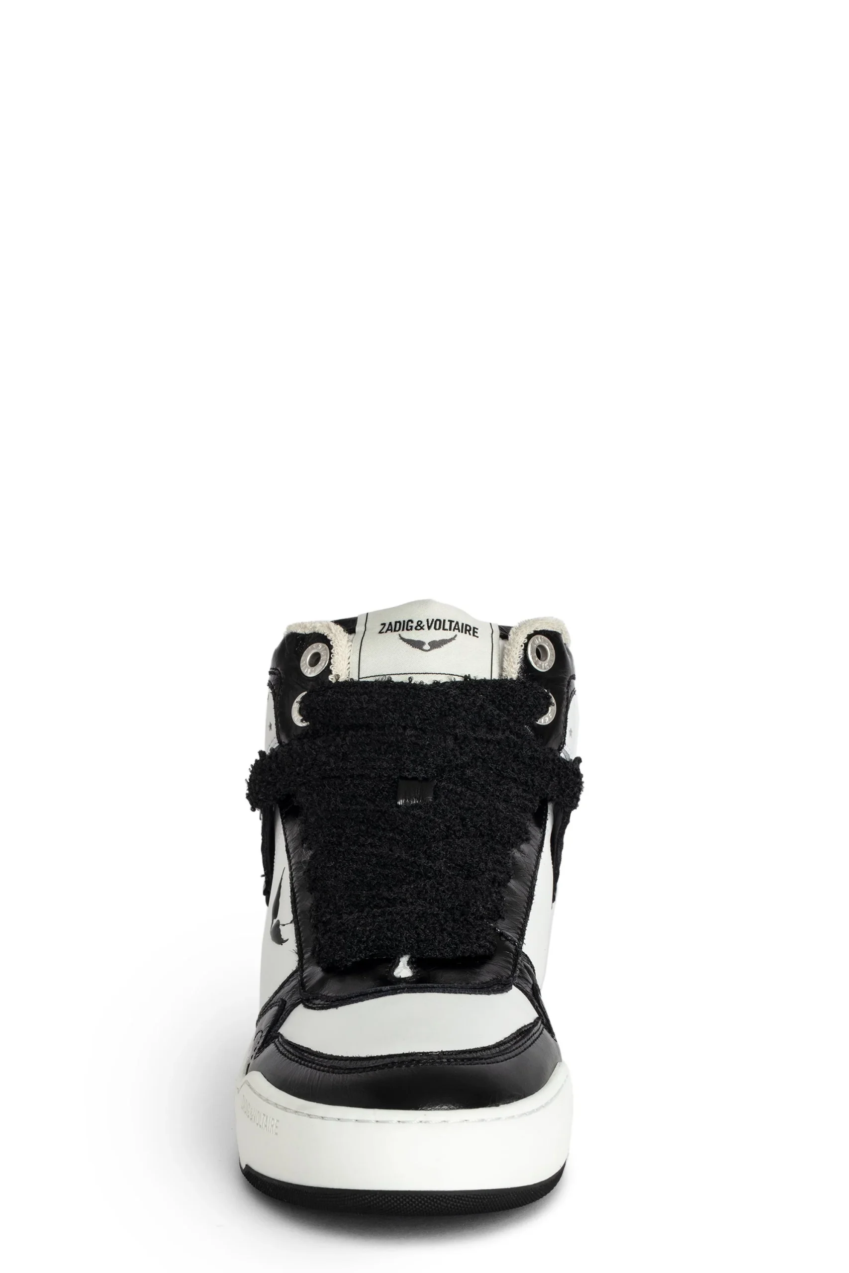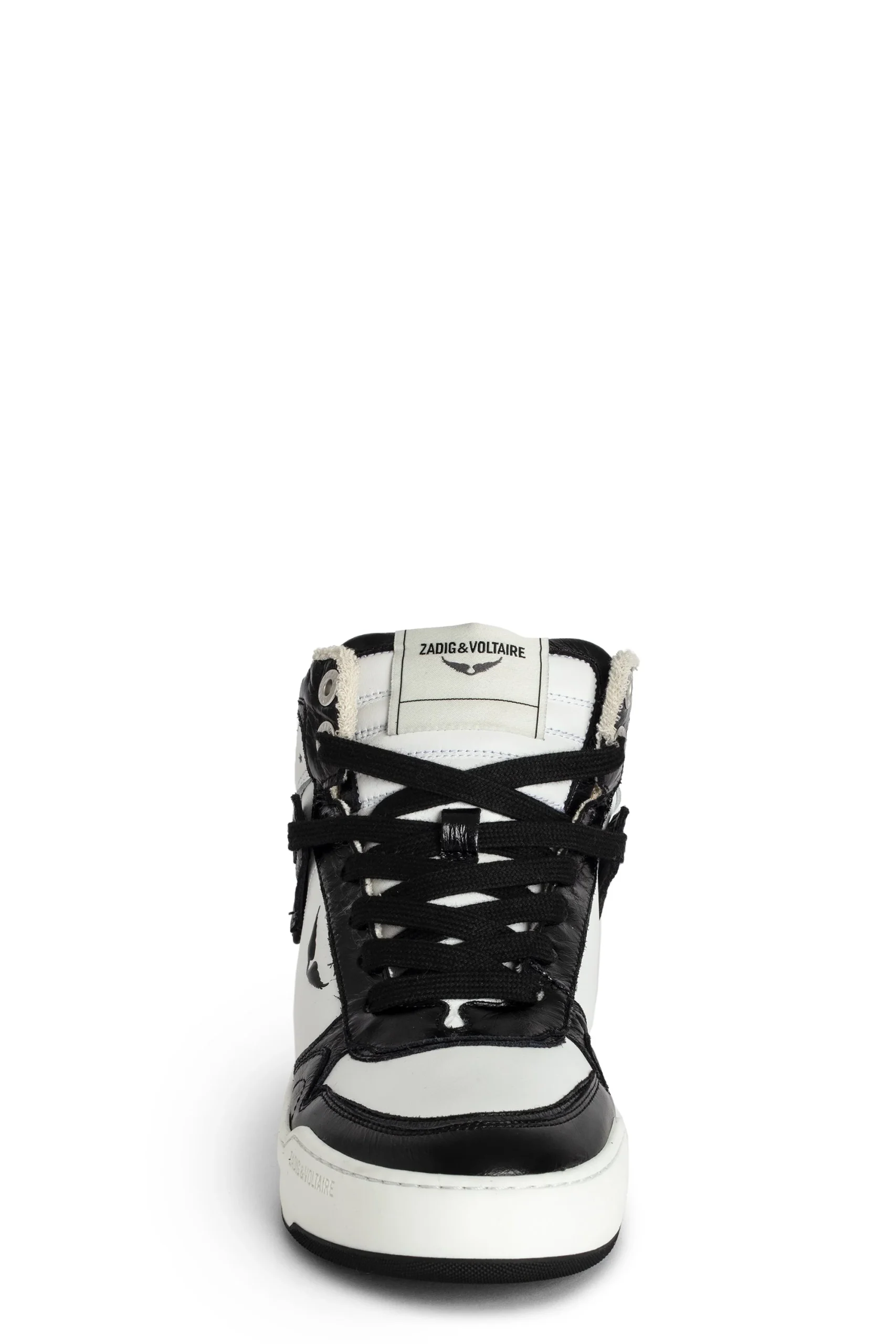 Zapatillas altas de piel lisa blanca, con inserciones de piel vintage negra y alas características. Estas zapatillas están fabricadas con materiales de menor impacto ambiental.