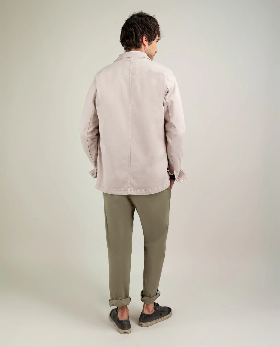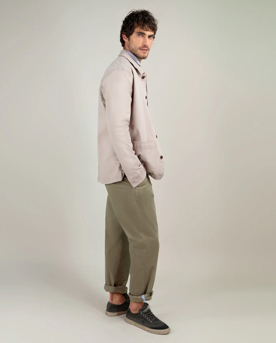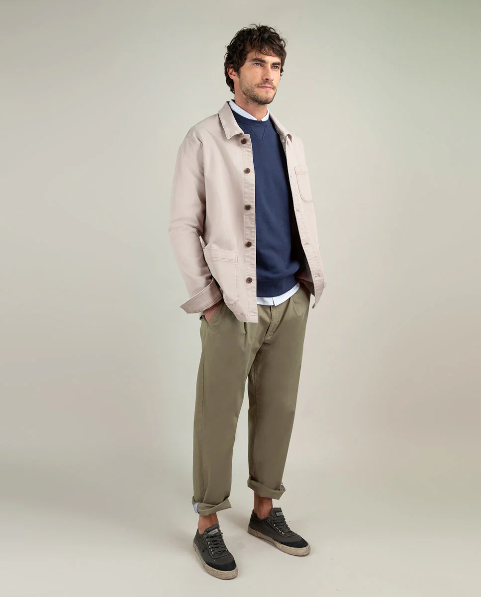 Sobrecamisa de hombre lisa confeccionada en 97% Algodón y 3% Elastano. Para conseguir ese color desgastado, la prenda ha sido tintada con acabado sulfuroso. Corte Regular Fit, cuello clásico, bolsillos tipo parche y cierre con botones. Manga larga y detalle de cinta de 3mm en el borde de la tapilla interior. Lleva logo bordado en uno de los bolsillos de parche. Esta prenda cuenta con un lavado enzimático que le dará un aspecto desgastado.