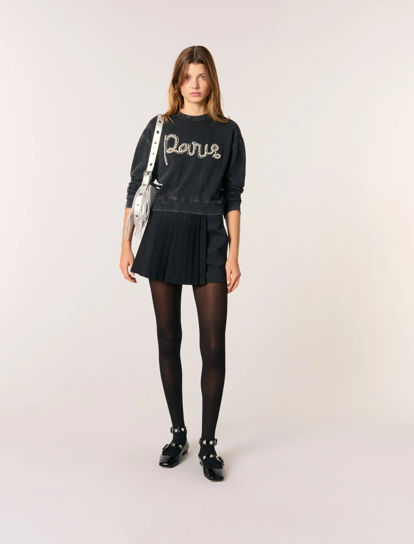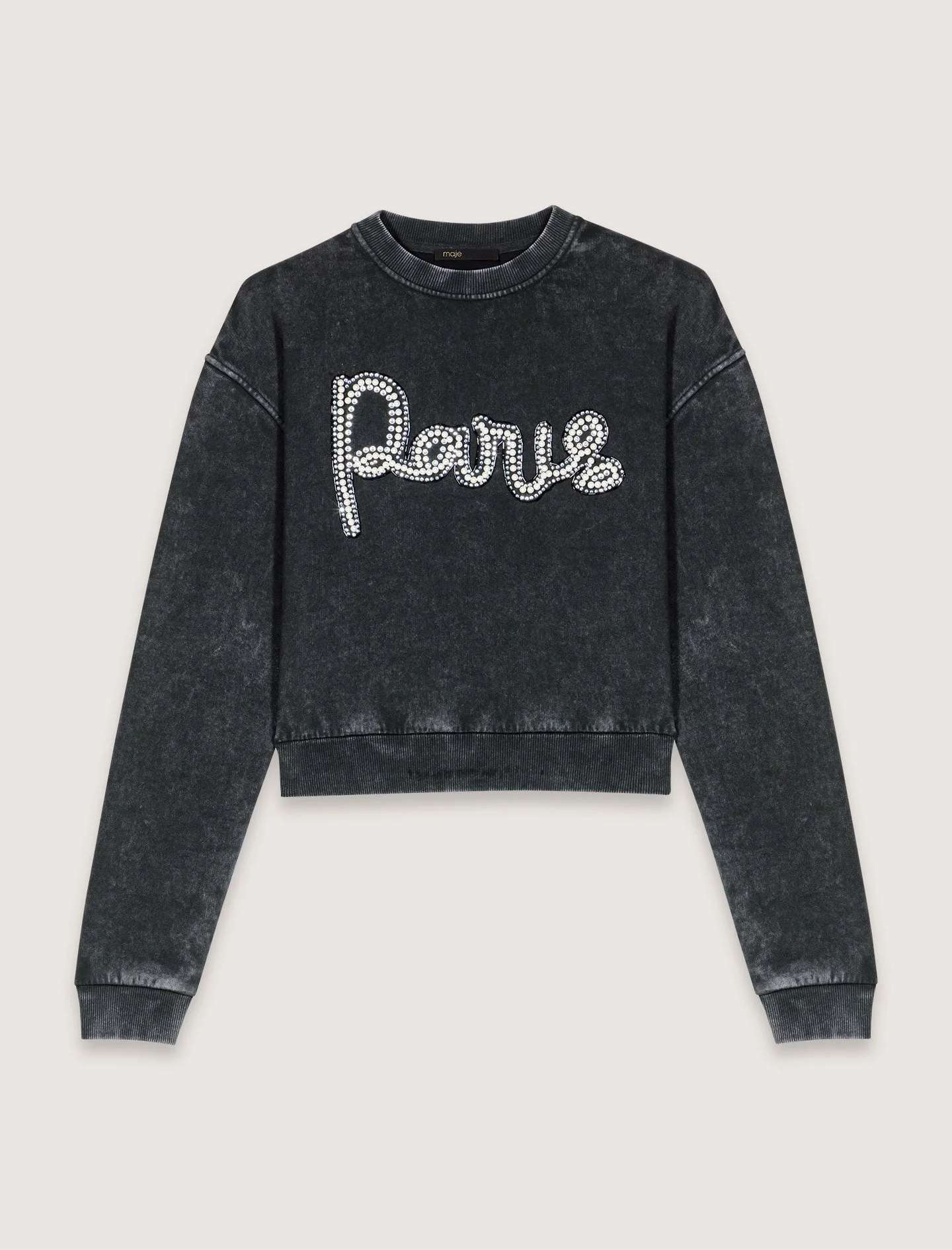 Adornada con un bordado de estrás de la firma «Paris», esta sudadera de cuello redondo y manga larga muestra ribetes de canalé. Una prenda informal y sofisticada, para llevar con zapatillas o zapatos de tacón.