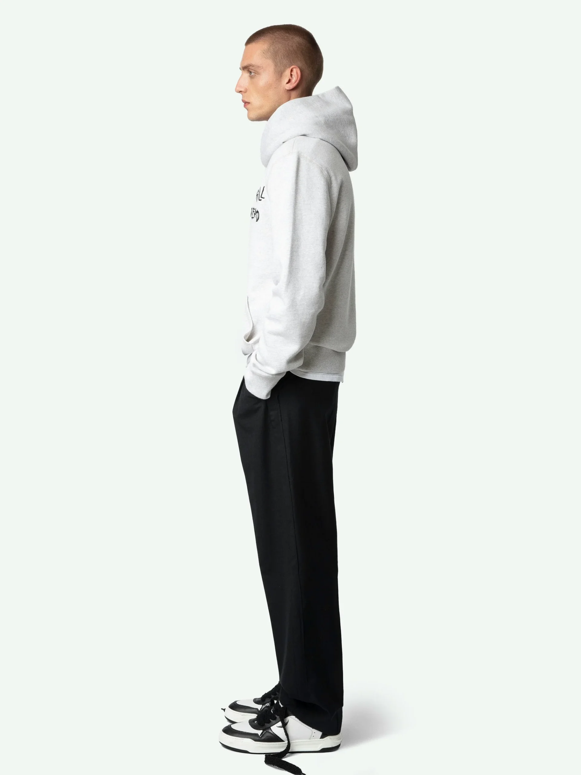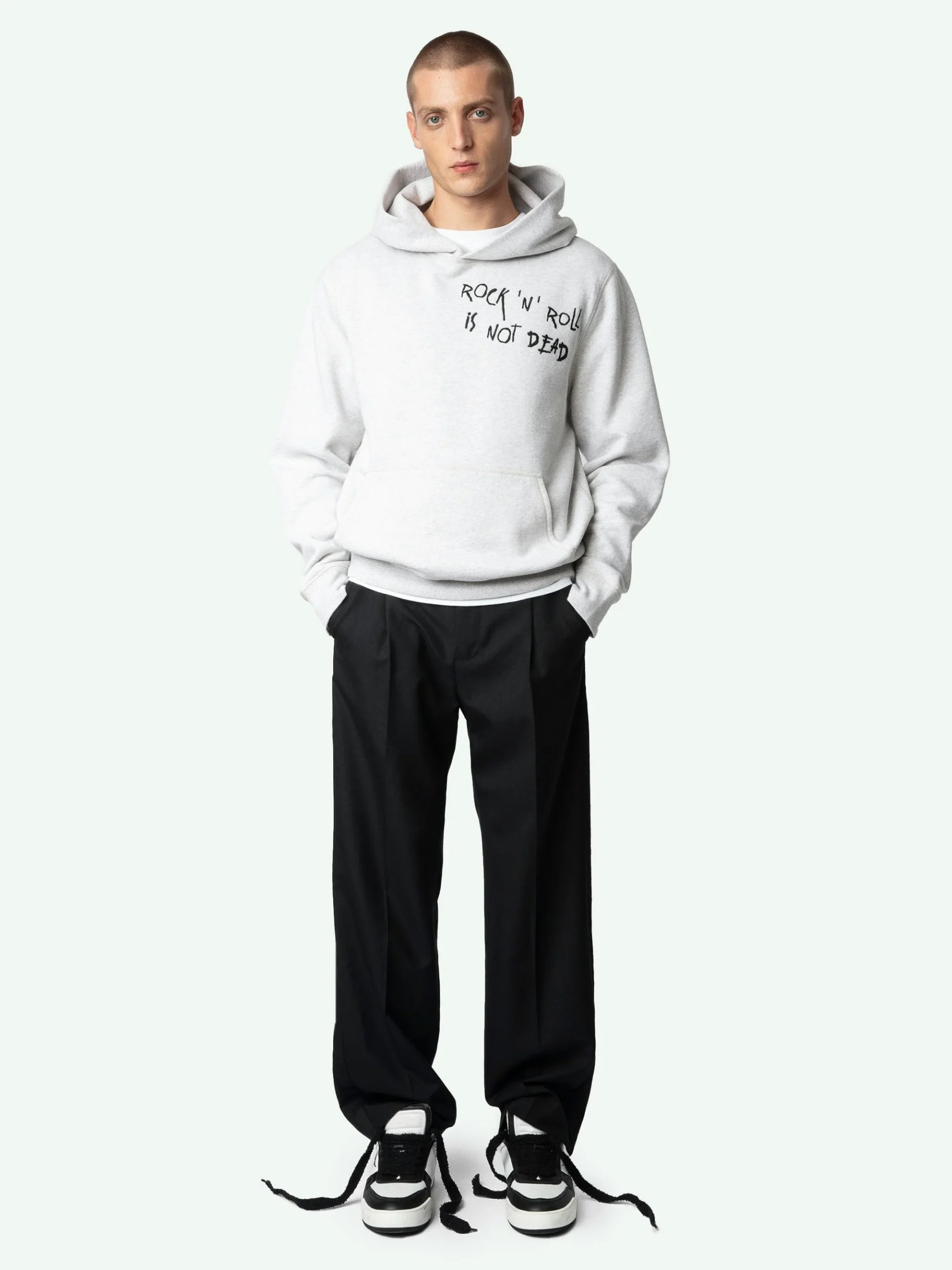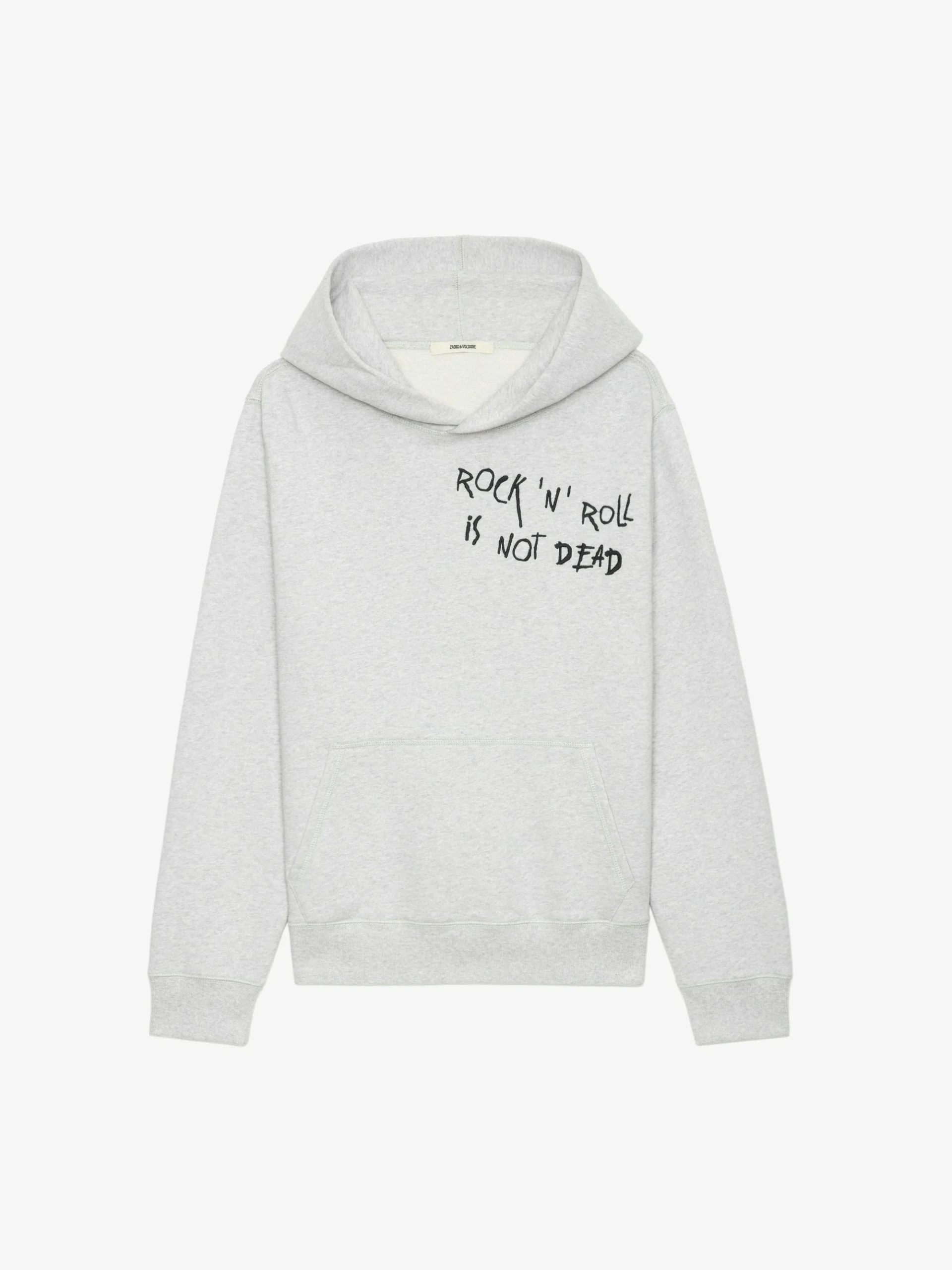 Sudadera de felpa confeccionada en algodón orgánico gris jaspeado claro con capucha, manga larga y bordado «Rock’N’Roll Is Not Dead».