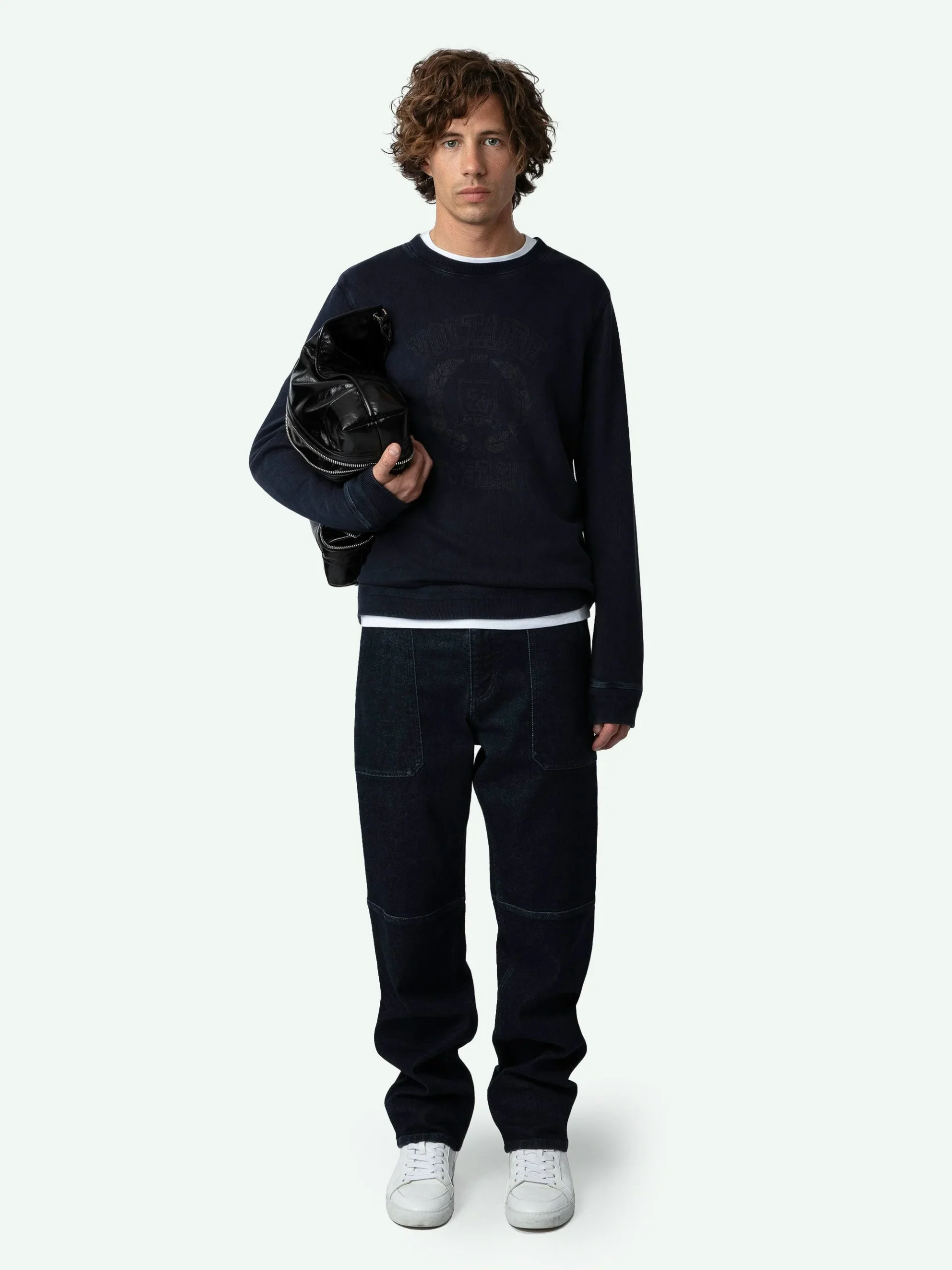 Sudadera de felpa de algodón ecológico con efecto desteñido, de manga larga, con escudo estampado en la parte delantera.