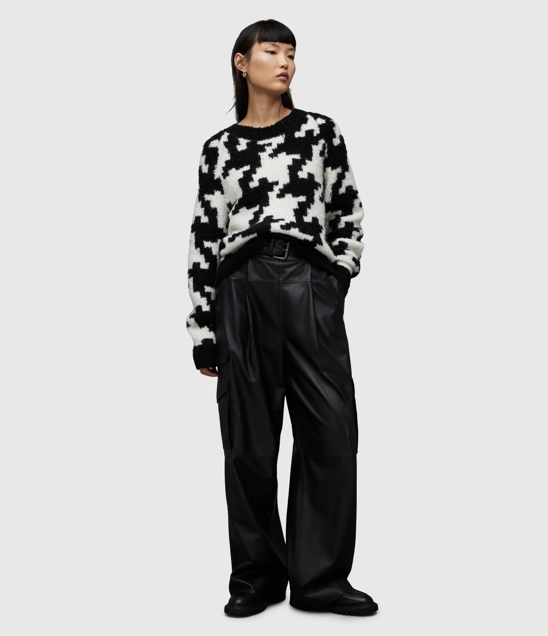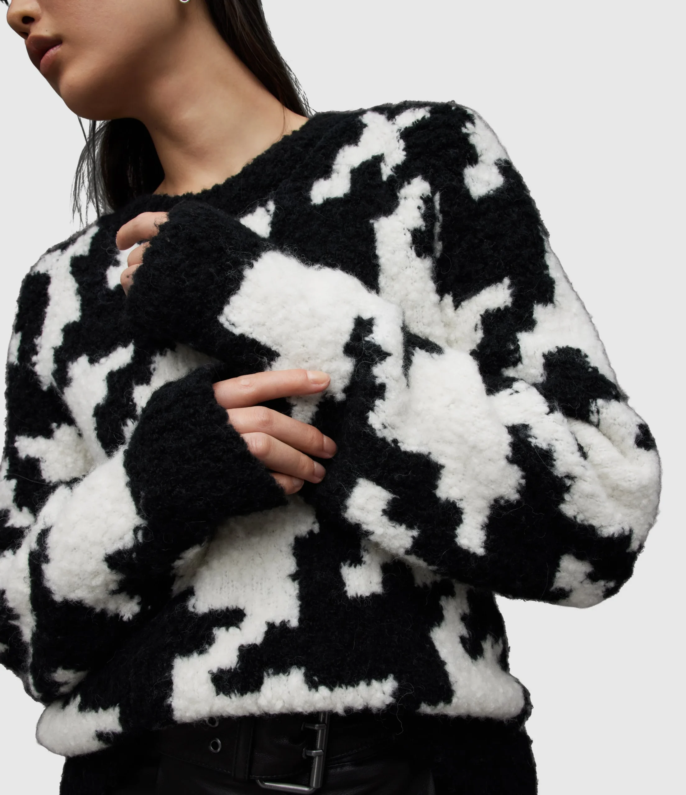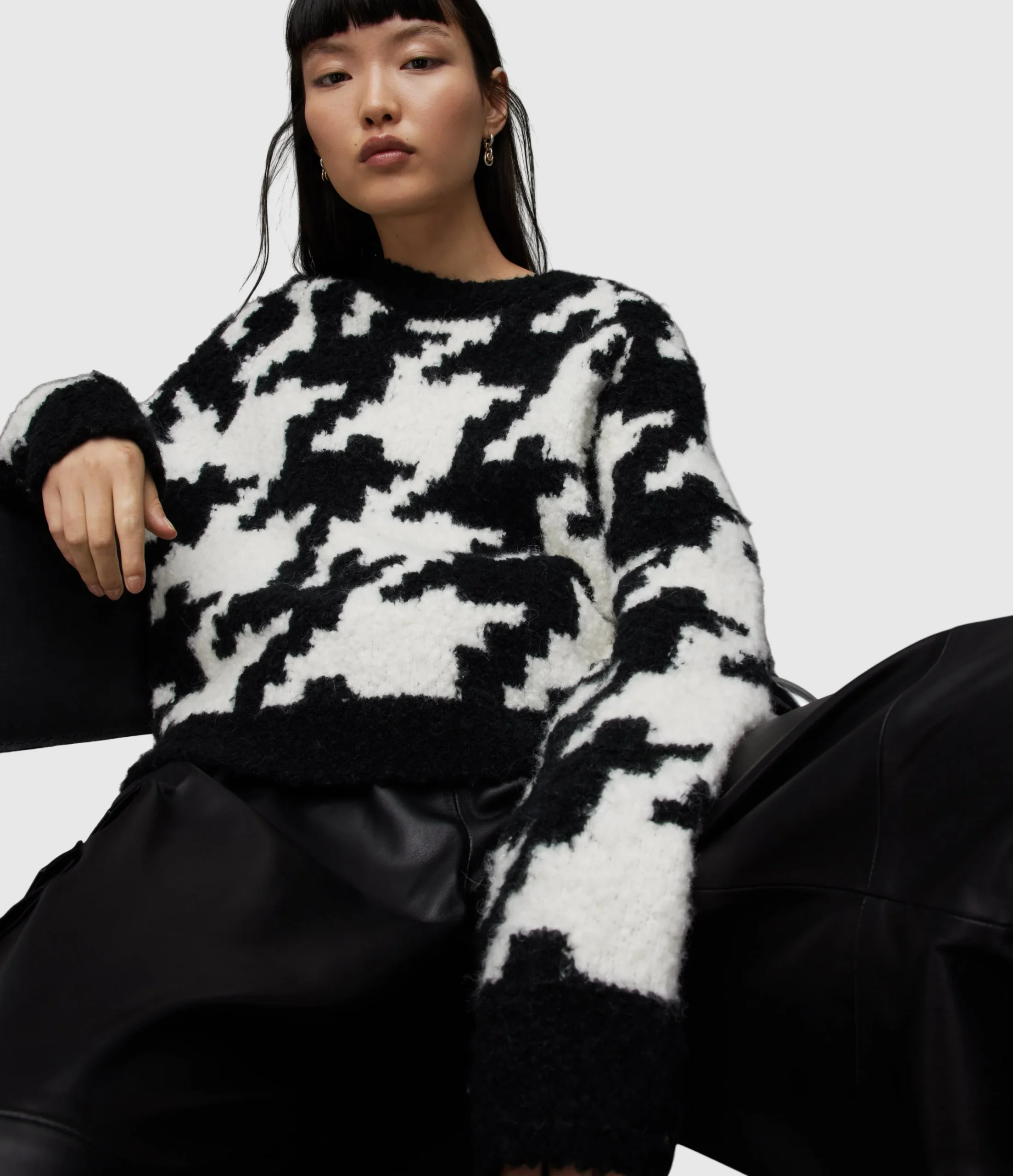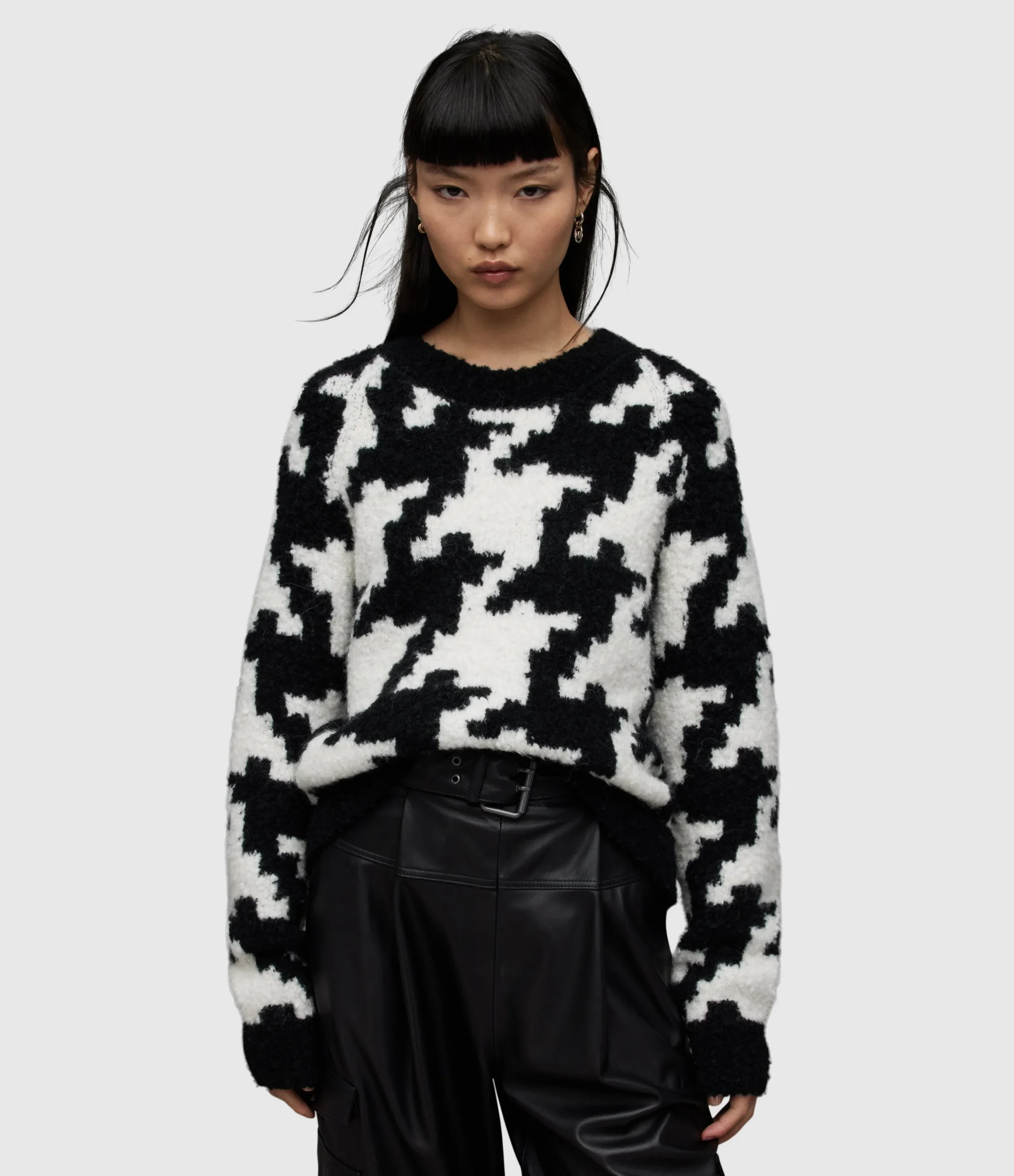 JOY JUMPER WK022Z BLK/CHALK WHITE SEP Pull over Round neck Long sleeve Crew neck jumper with rib trims knitted from a soft lofty boucle yarn offering a textured look to this style which also fearures a bold hounds tooth all over pattern. No Pockets Unlined Knitted Heavyweight Alpha