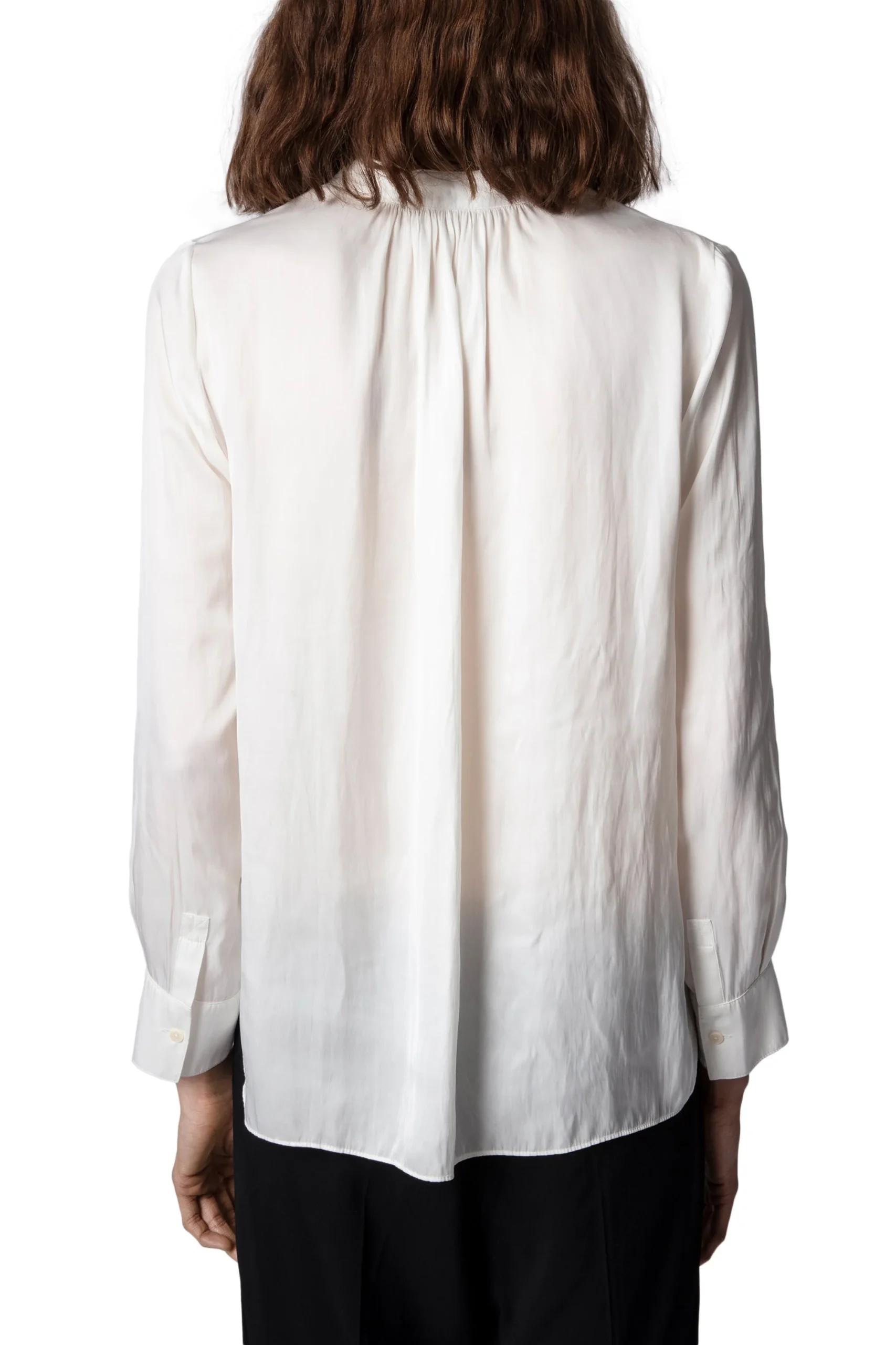 Blusa de satén con cuello abierto, mangas largas y detalles fruncidos.