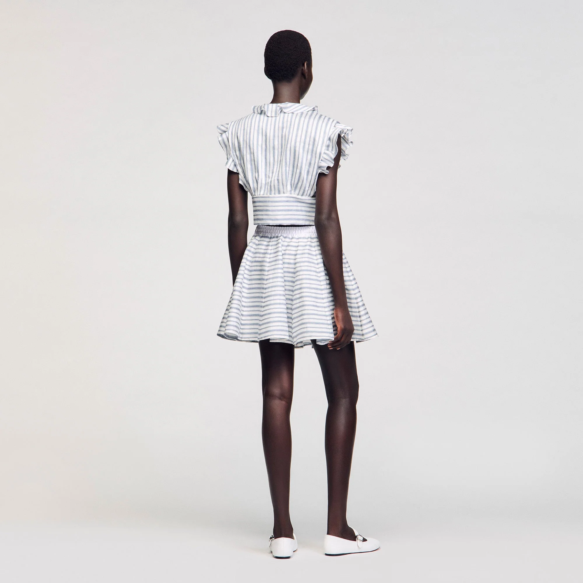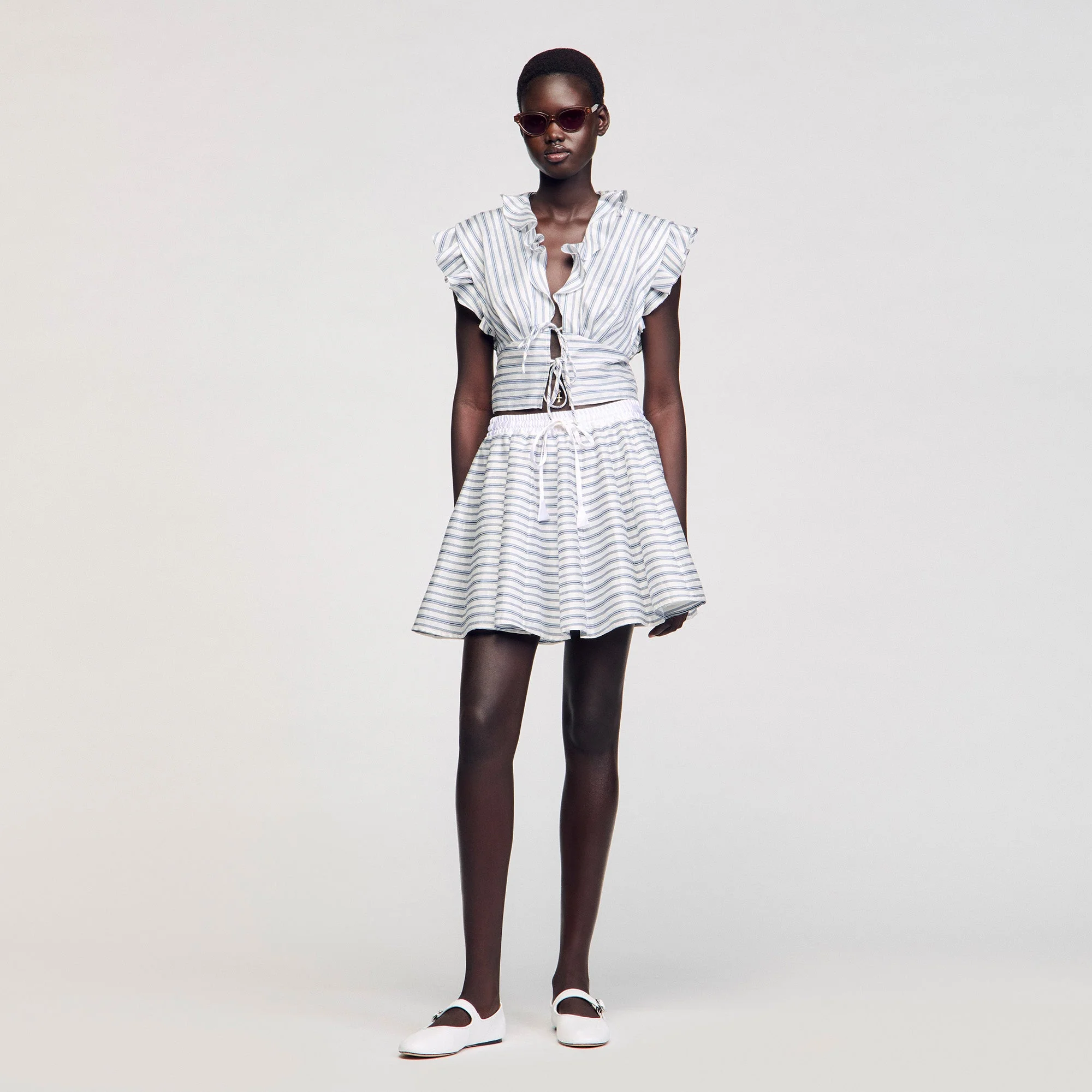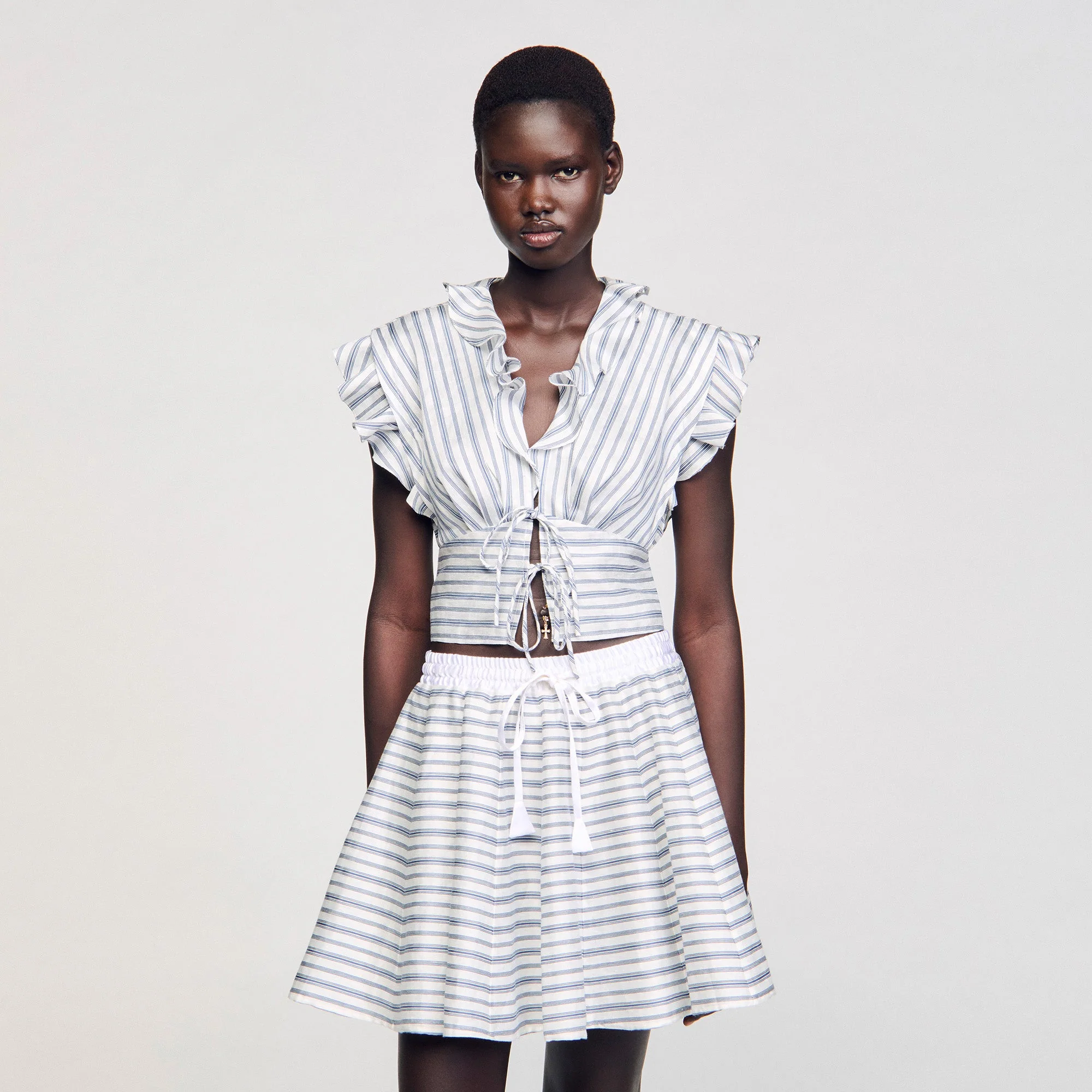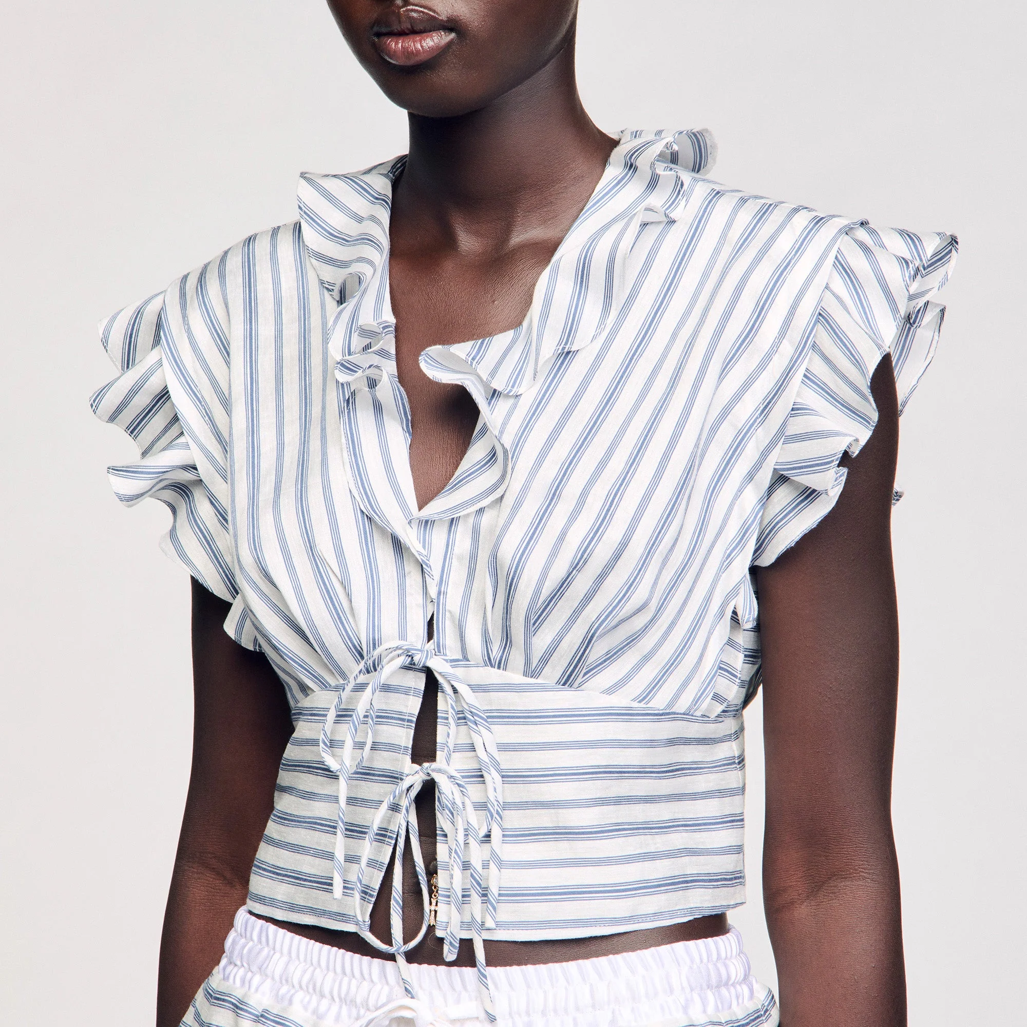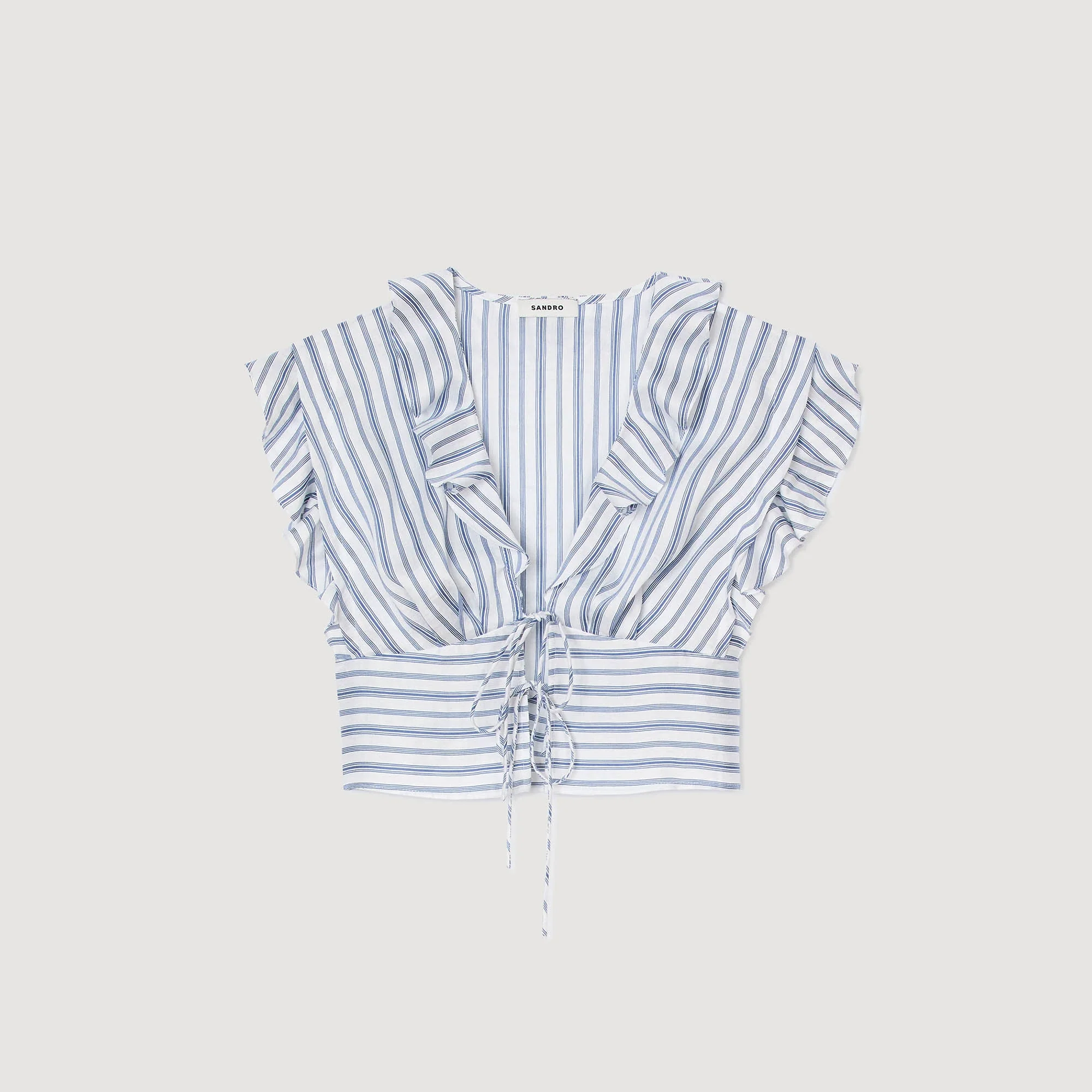 Top corto con volantes en las mangas, tiras para anudar por delante y estampado de rayas.