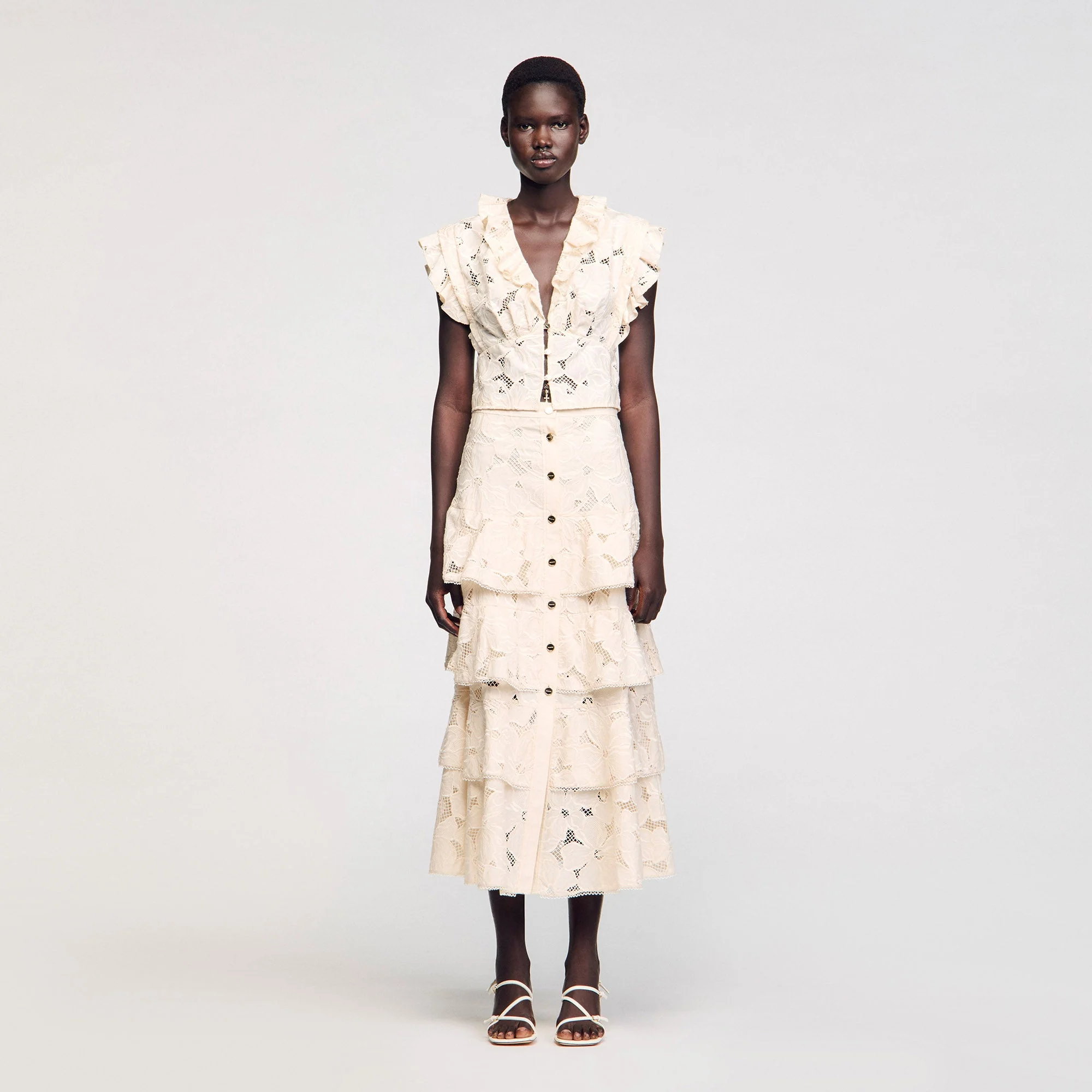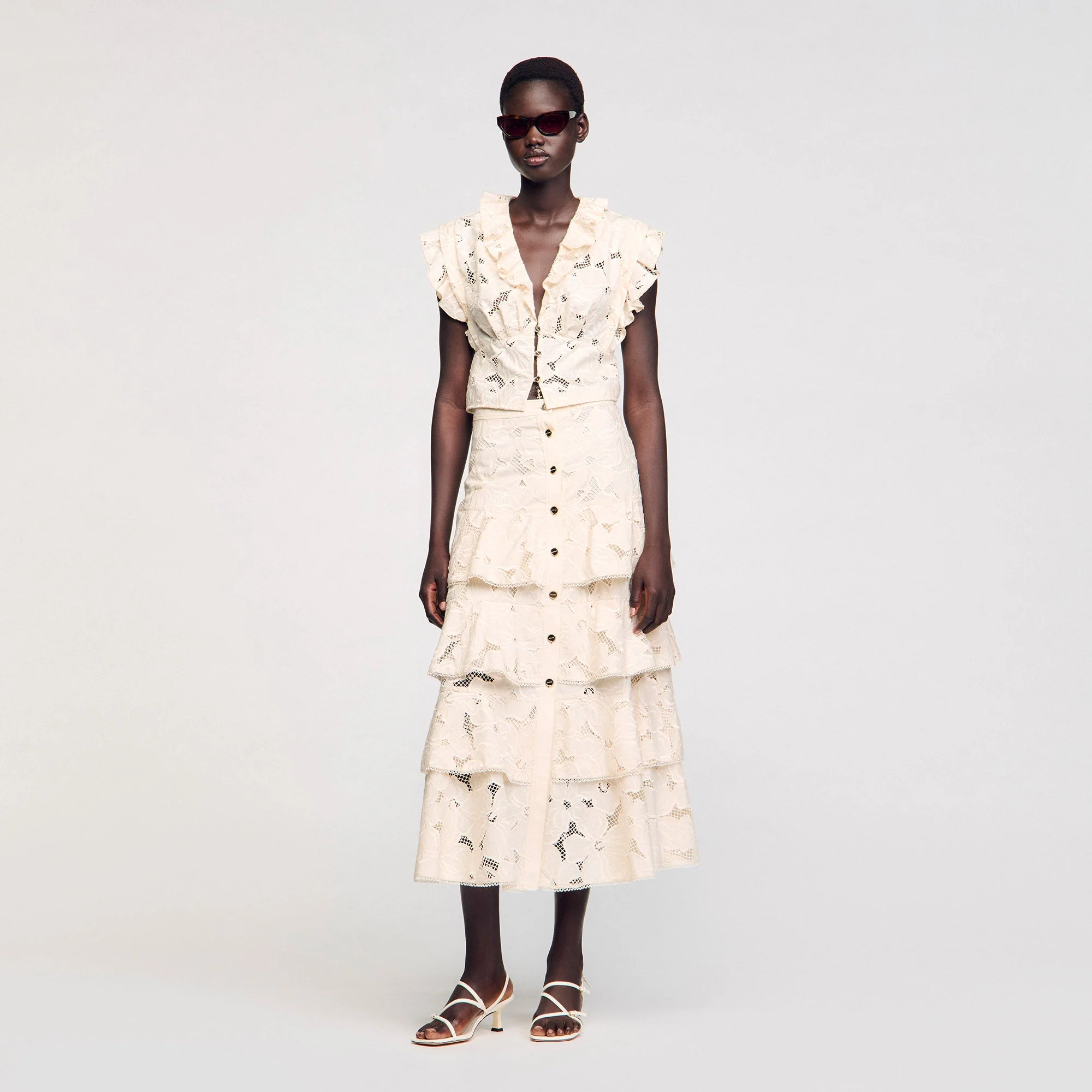 Top corto bordado con manga corta con volante, escote de pico y tapeta de botones.