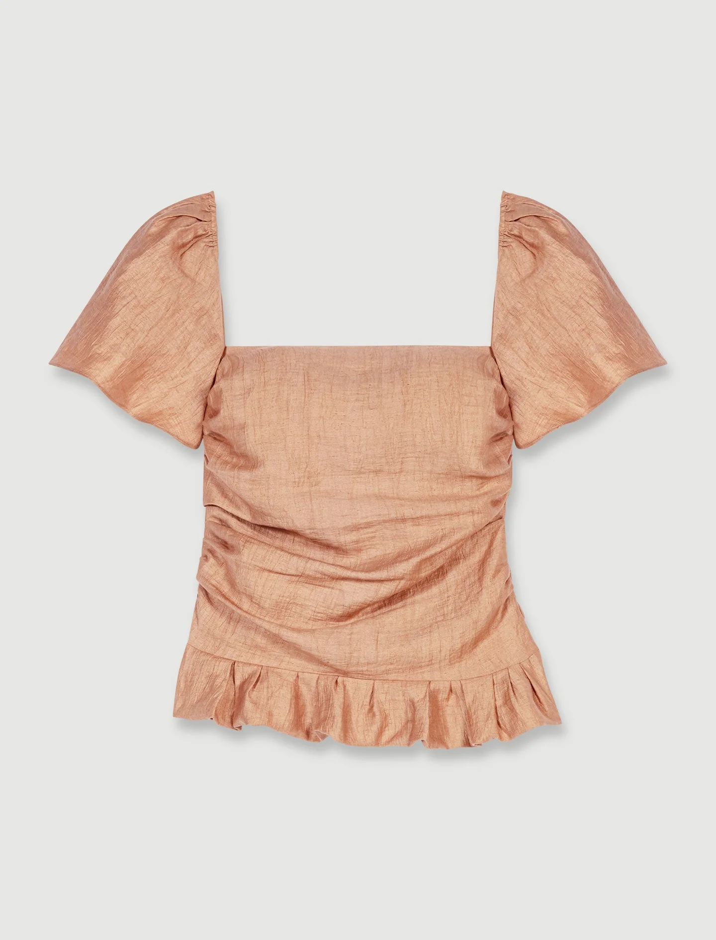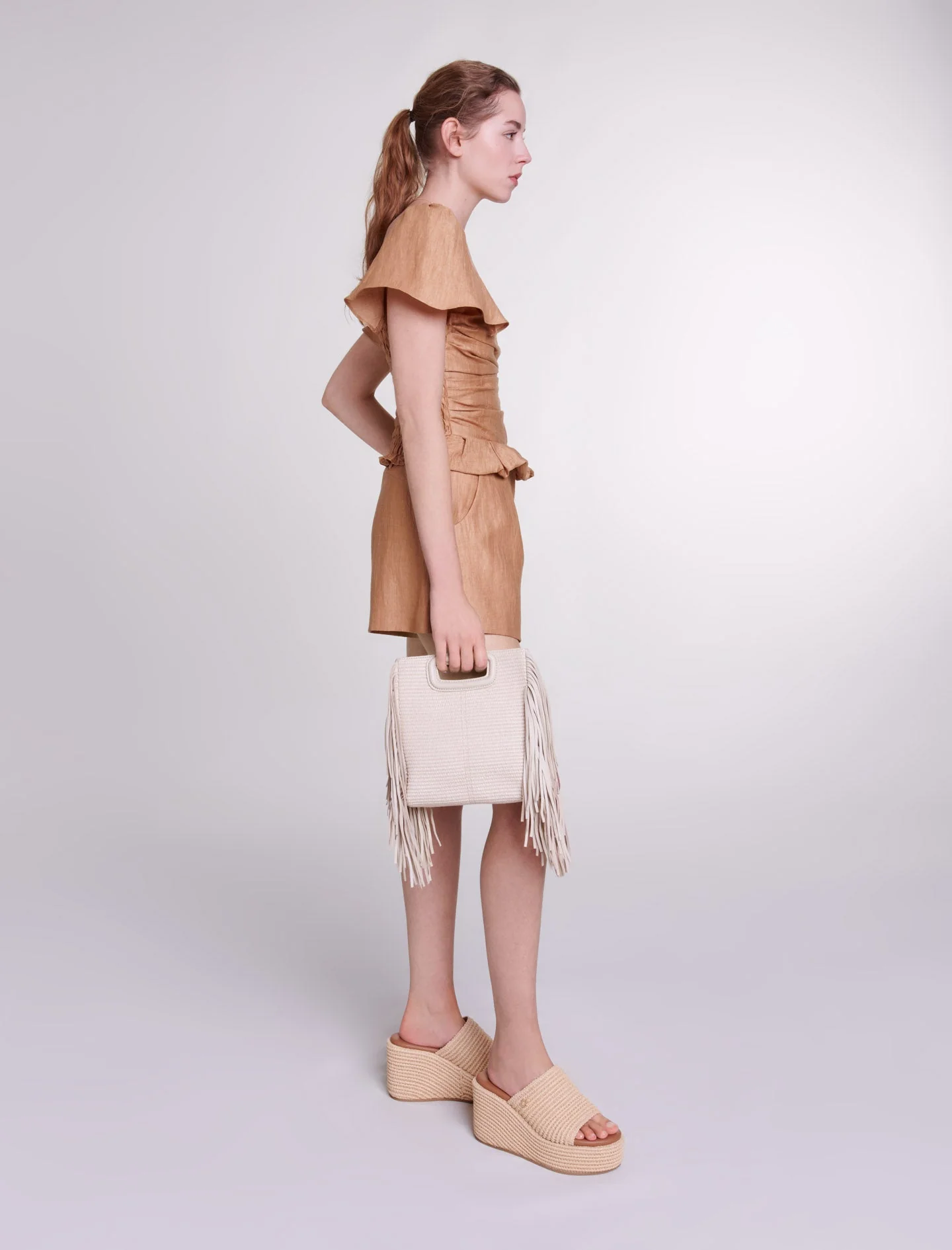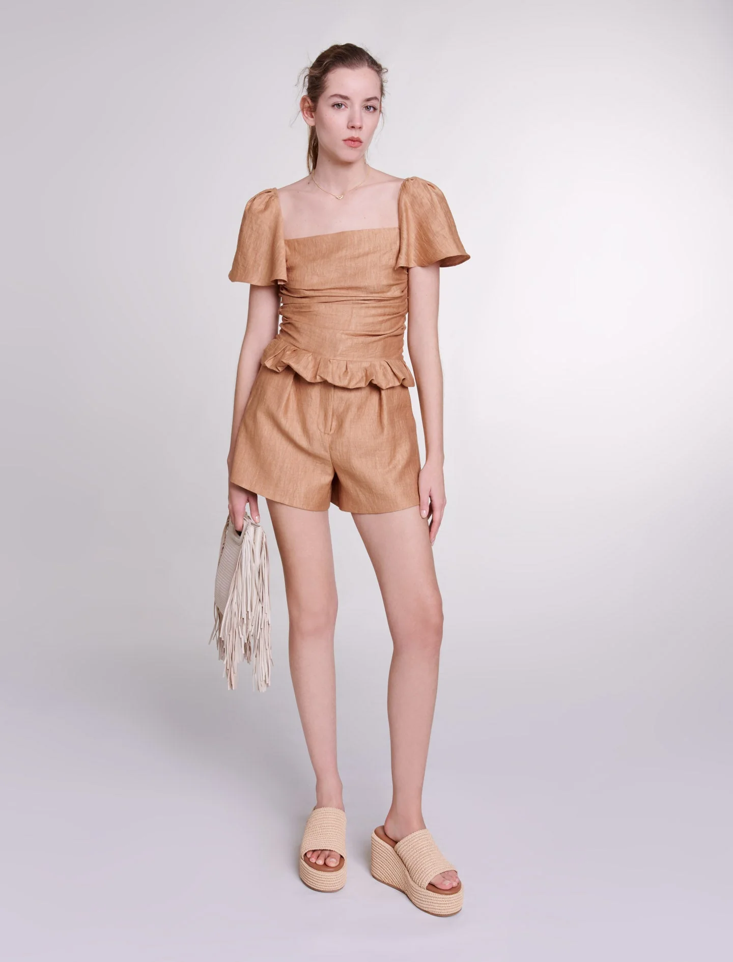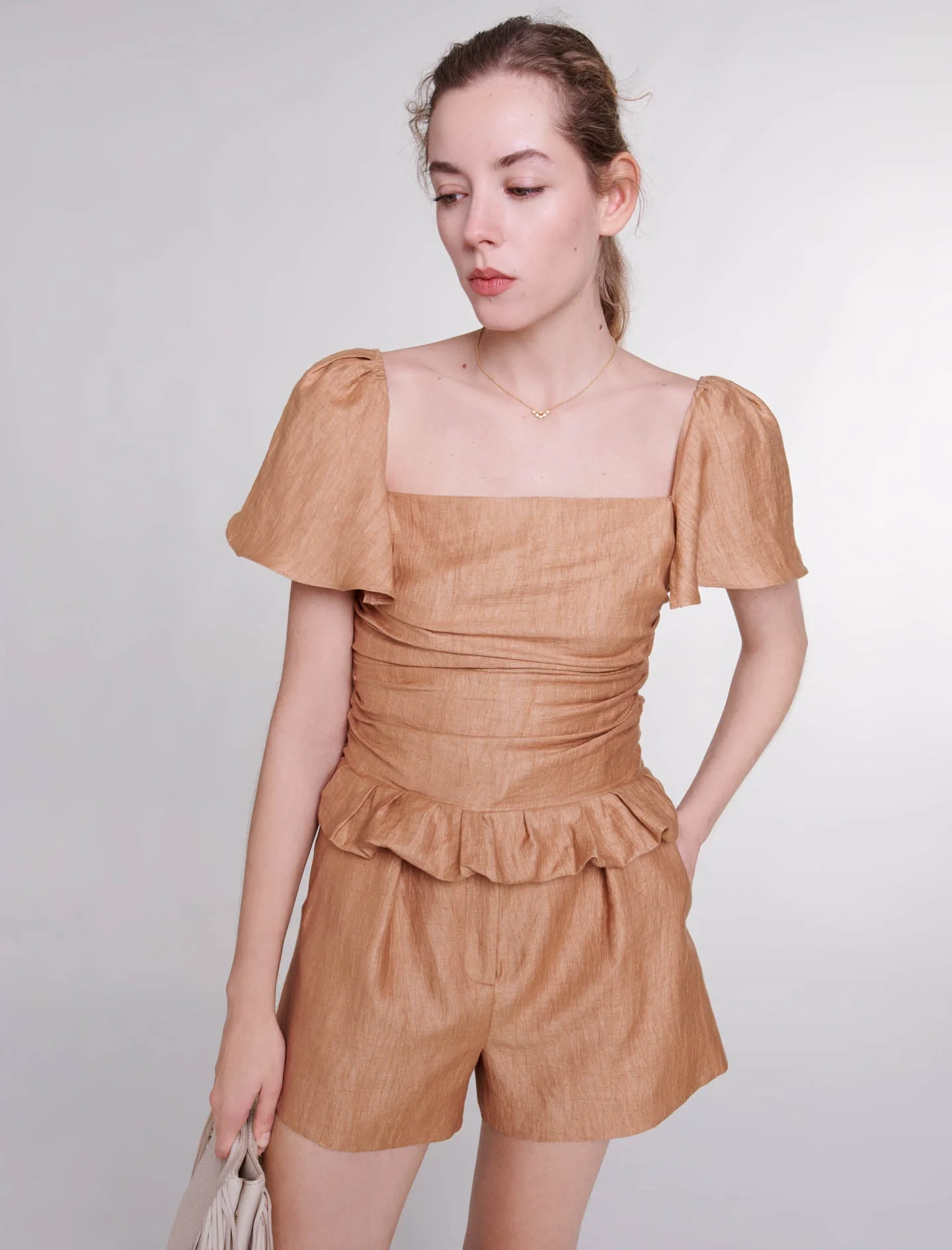 Para esta nueva colección, el estudio revisita piezas intemporales con un toque atrevido y cortes femeninos para acompañar sus «looks» de temporada.Añadiendo un estilo elegante y ligero, tiene un corte atrevido, detalles intrincados y una caída perfecta.Con un escote cuadrado y una espalda totalmente fruncida, presenta una parte delantera drapeada, mangas cortas y un bajo con volantes.Ideal para cualquier ocasión, apueste por el «look» total con el pantalón corto a juego. En cuanto a los accesorios, opte por un bolso insignia y sandalias de plataforma.La modelo mide 179 cm y lleva una talla 1.Referencia: MFPTO00999_U013