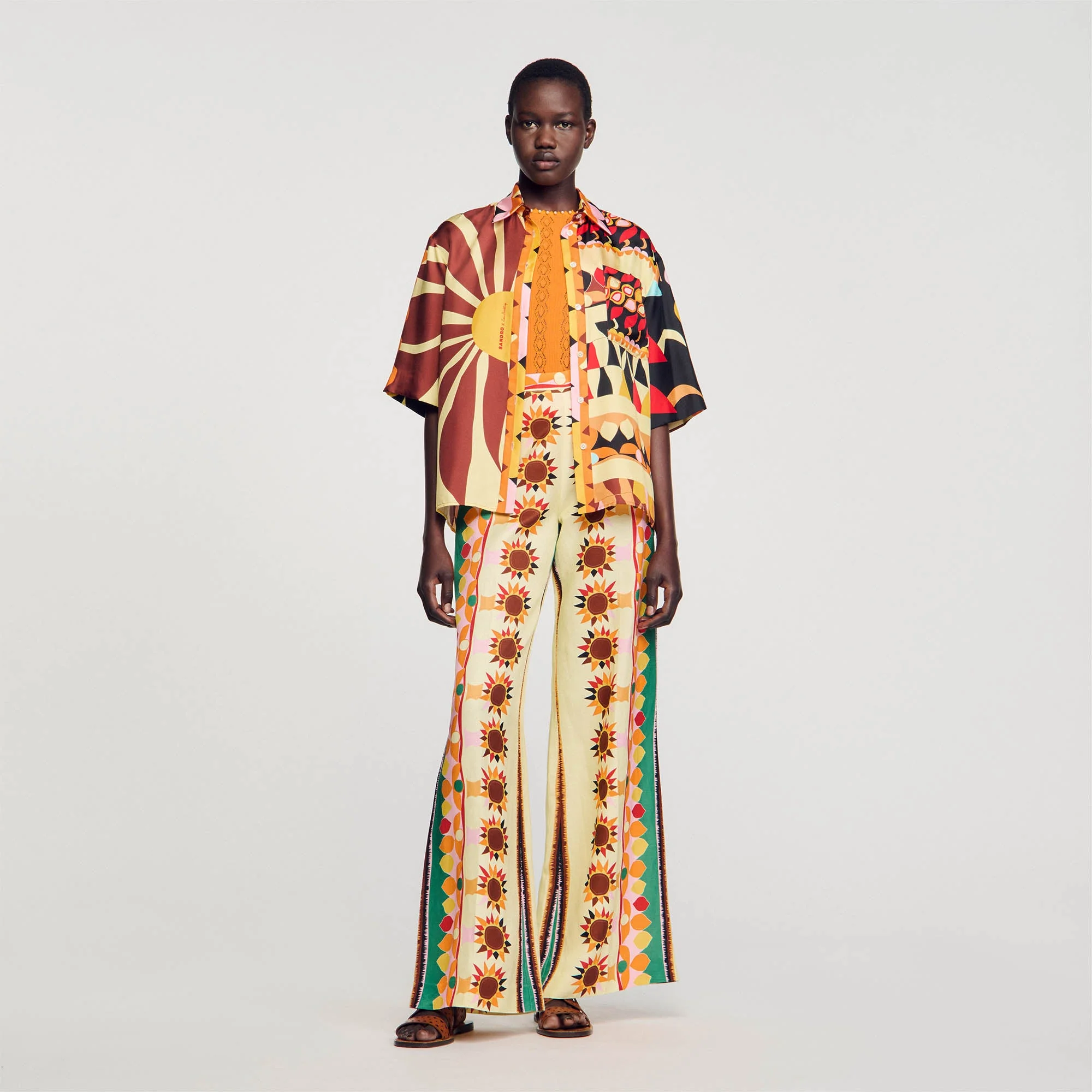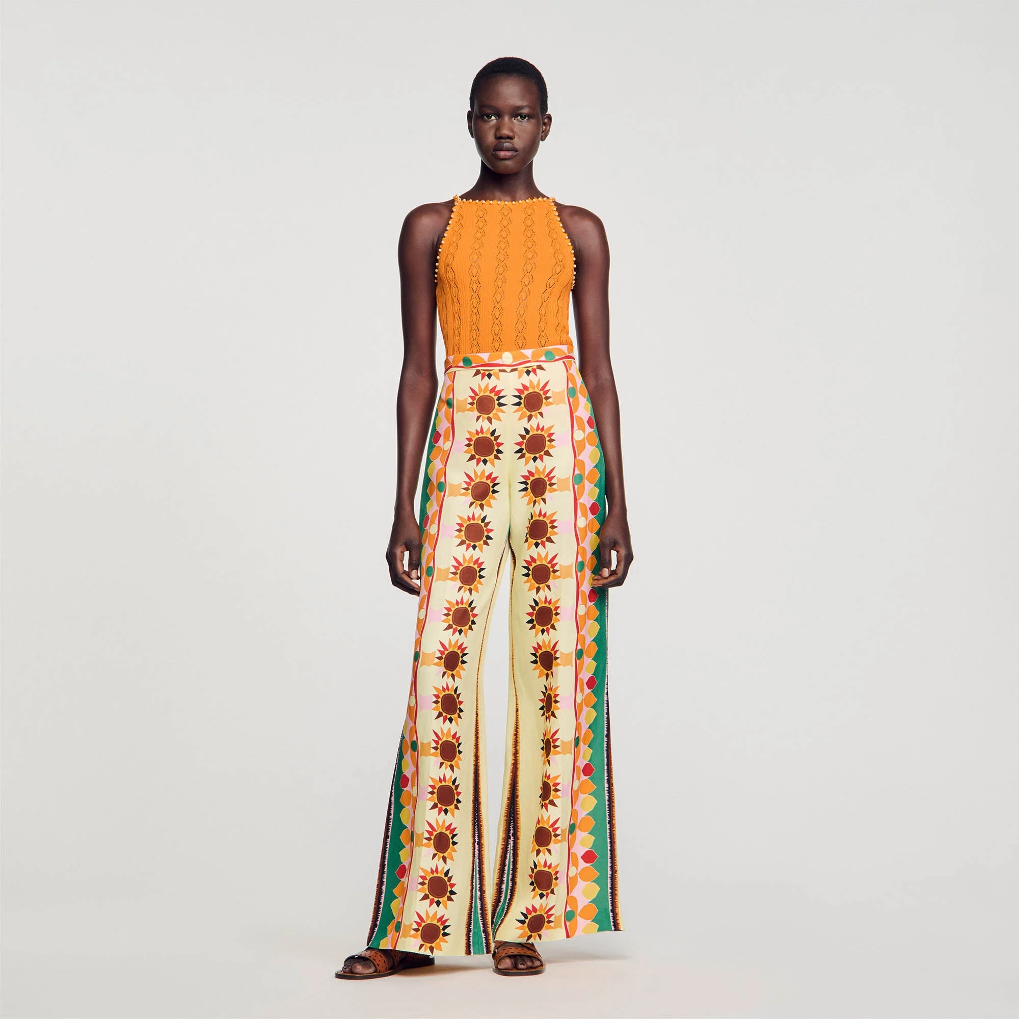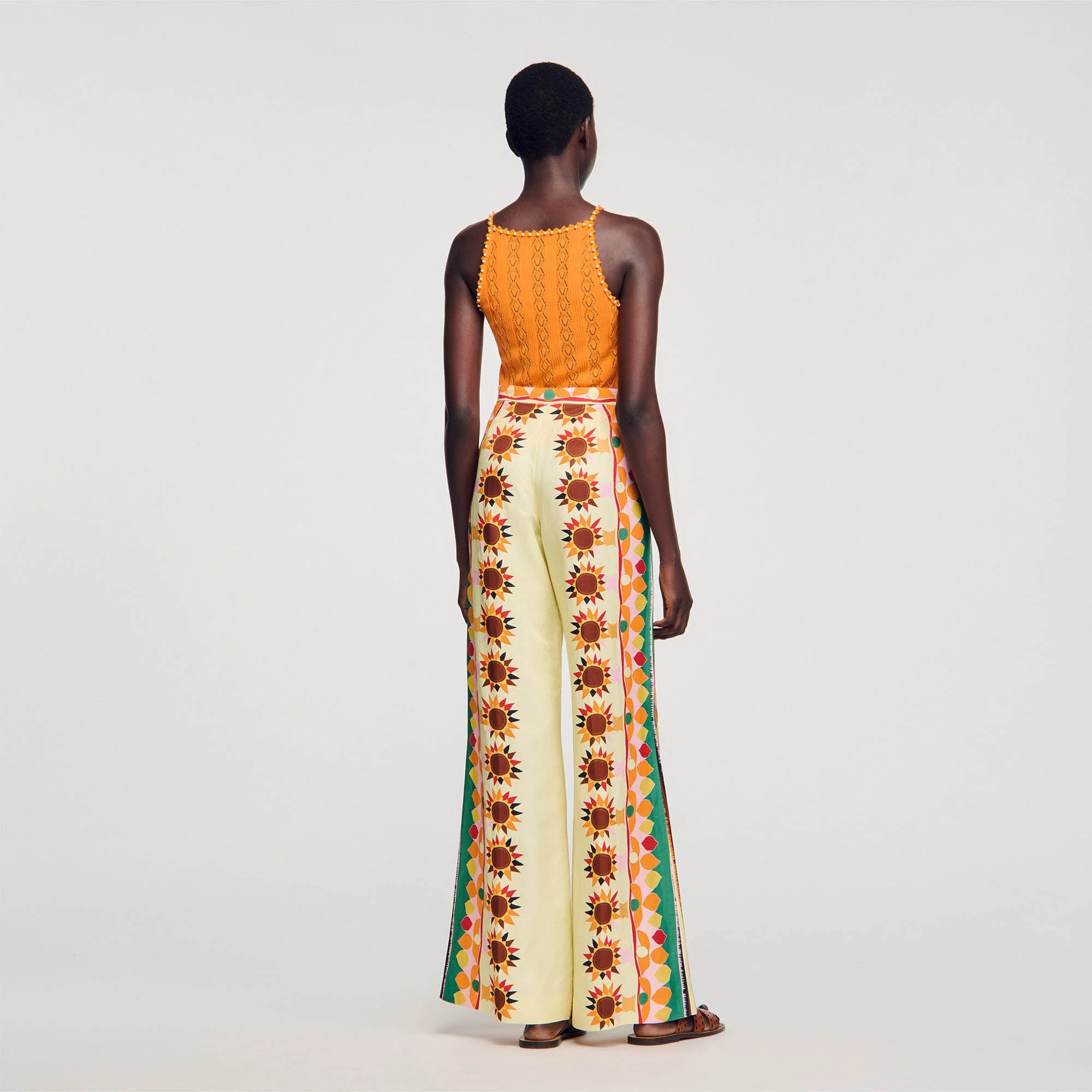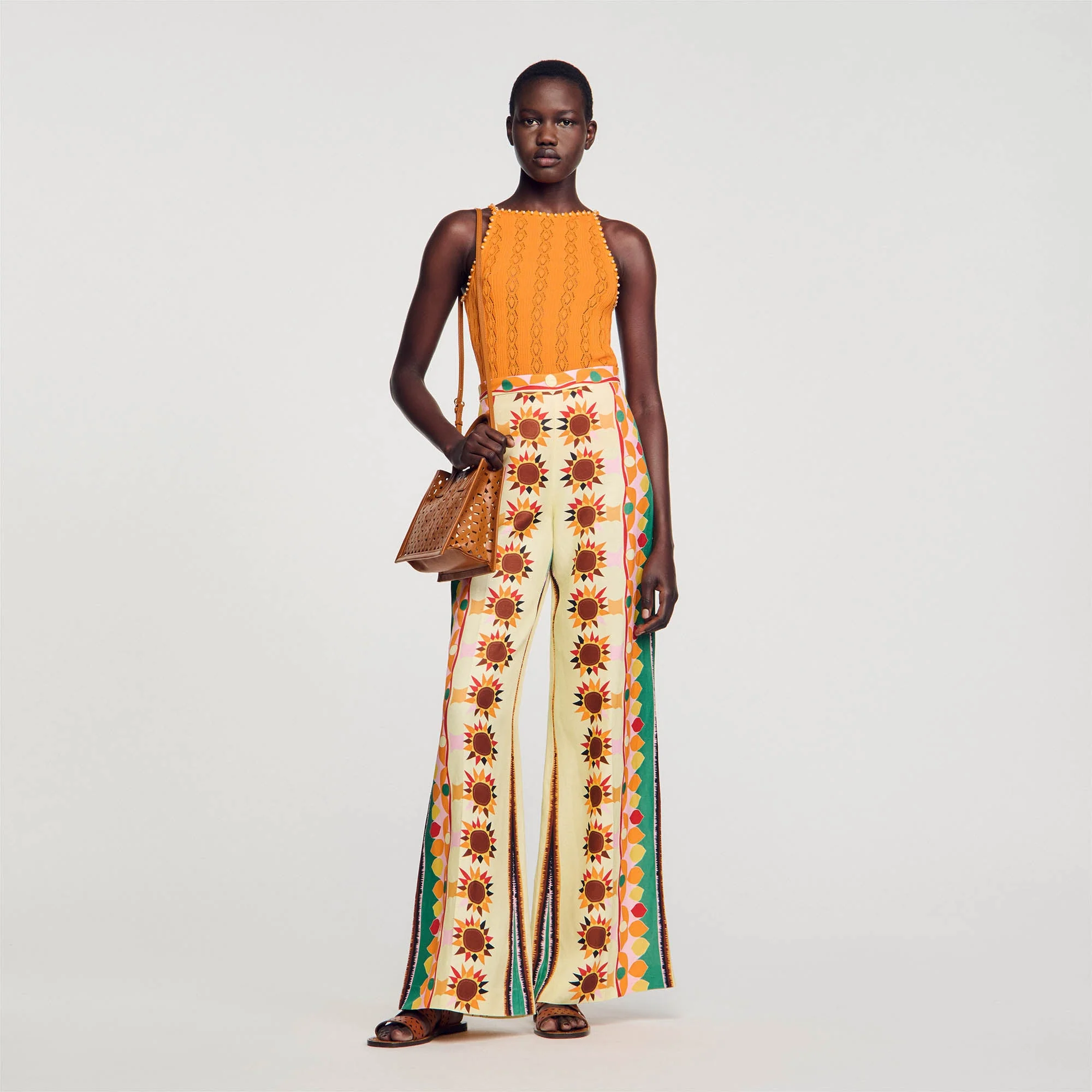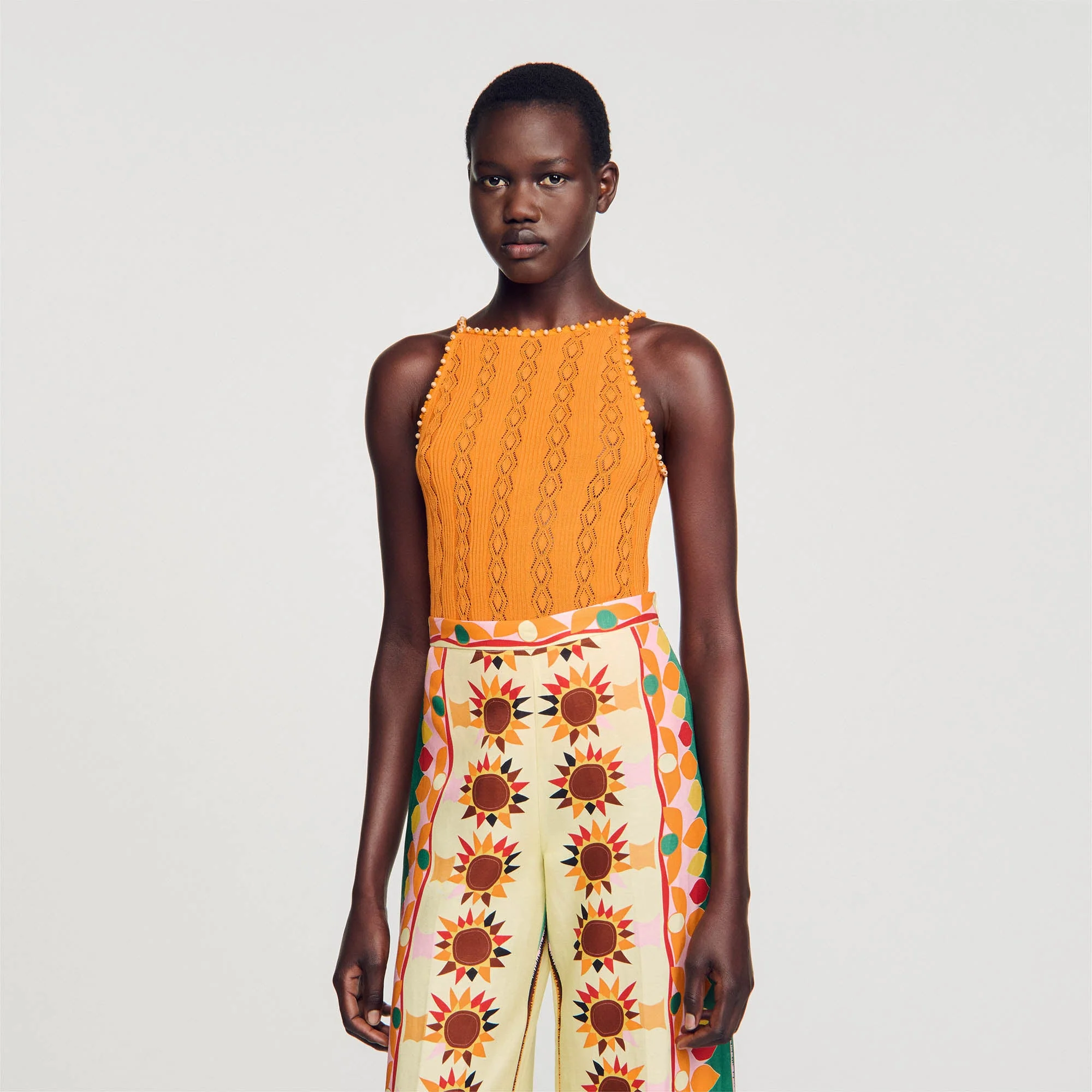 Sandro renueva su colaboración con el artista francés Louis Barthélemy para crear una colección cautivadora e inspirada en los viajes que rinde homenaje a la artesanía africana. Top con sisas americanas de punto pointelle con motivo de rombos y tirantes finos con detalle de pedrería.