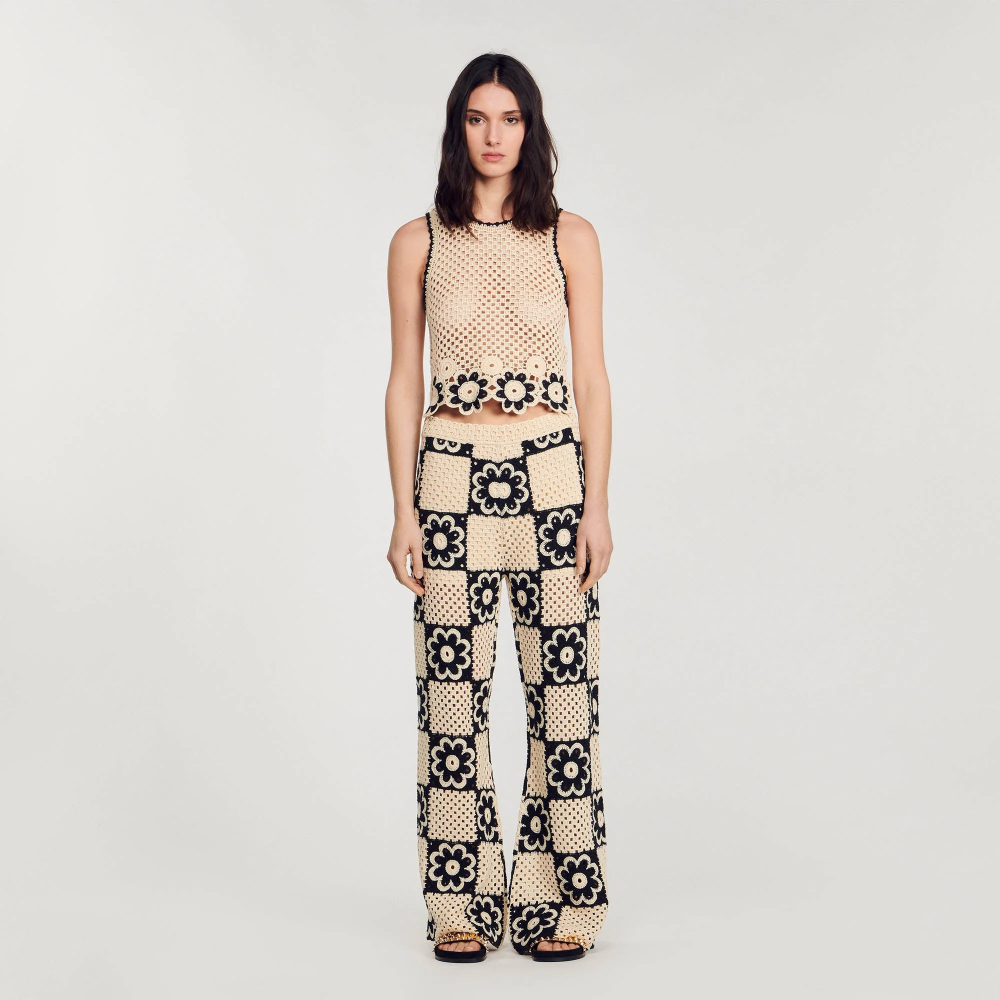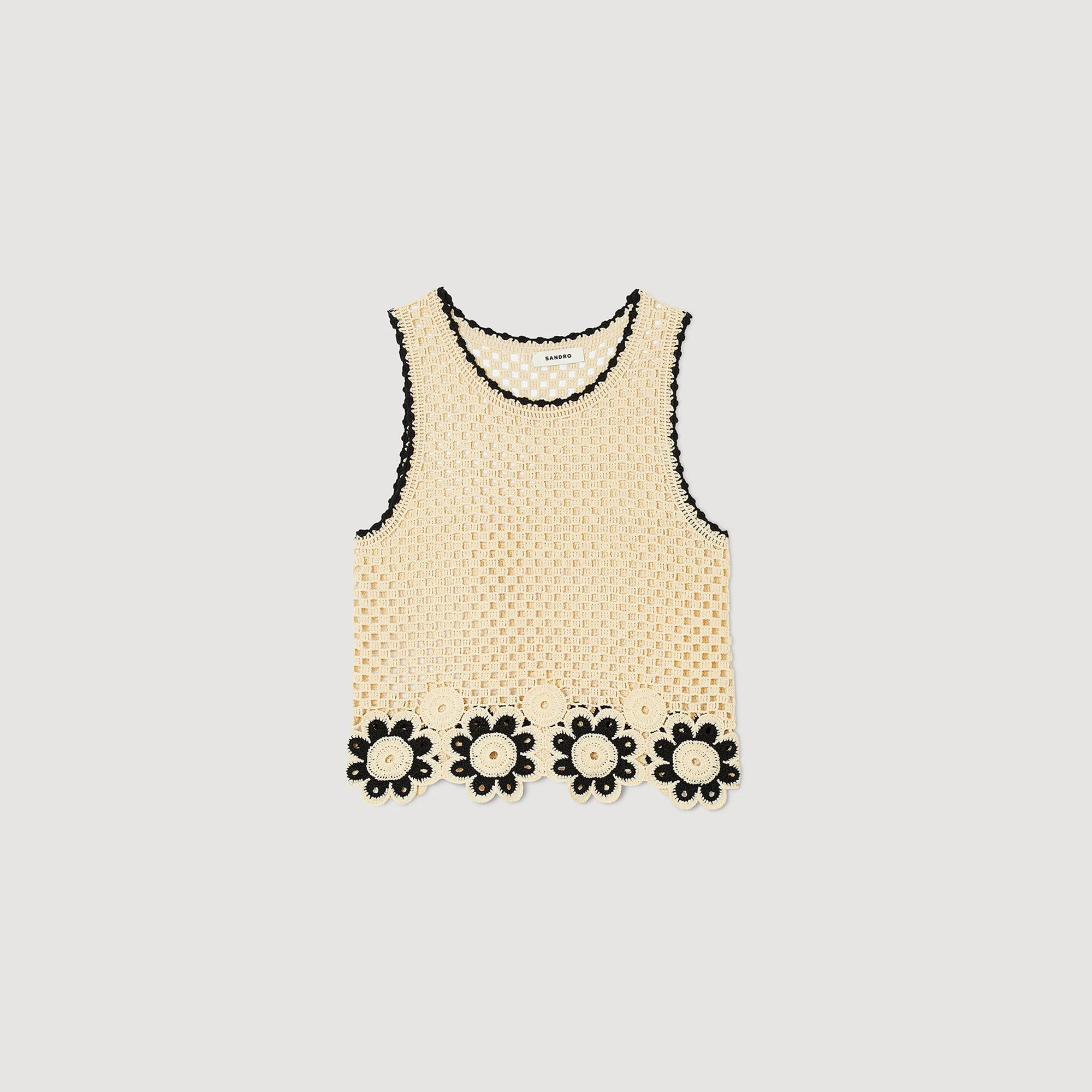 Jersey sin mangas de punto de ganchillo con detalle de motivos de flores en contraste y bordes festoneados.
