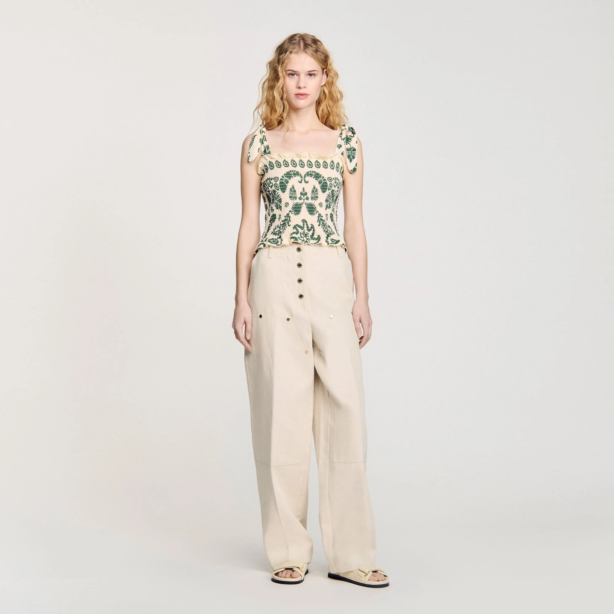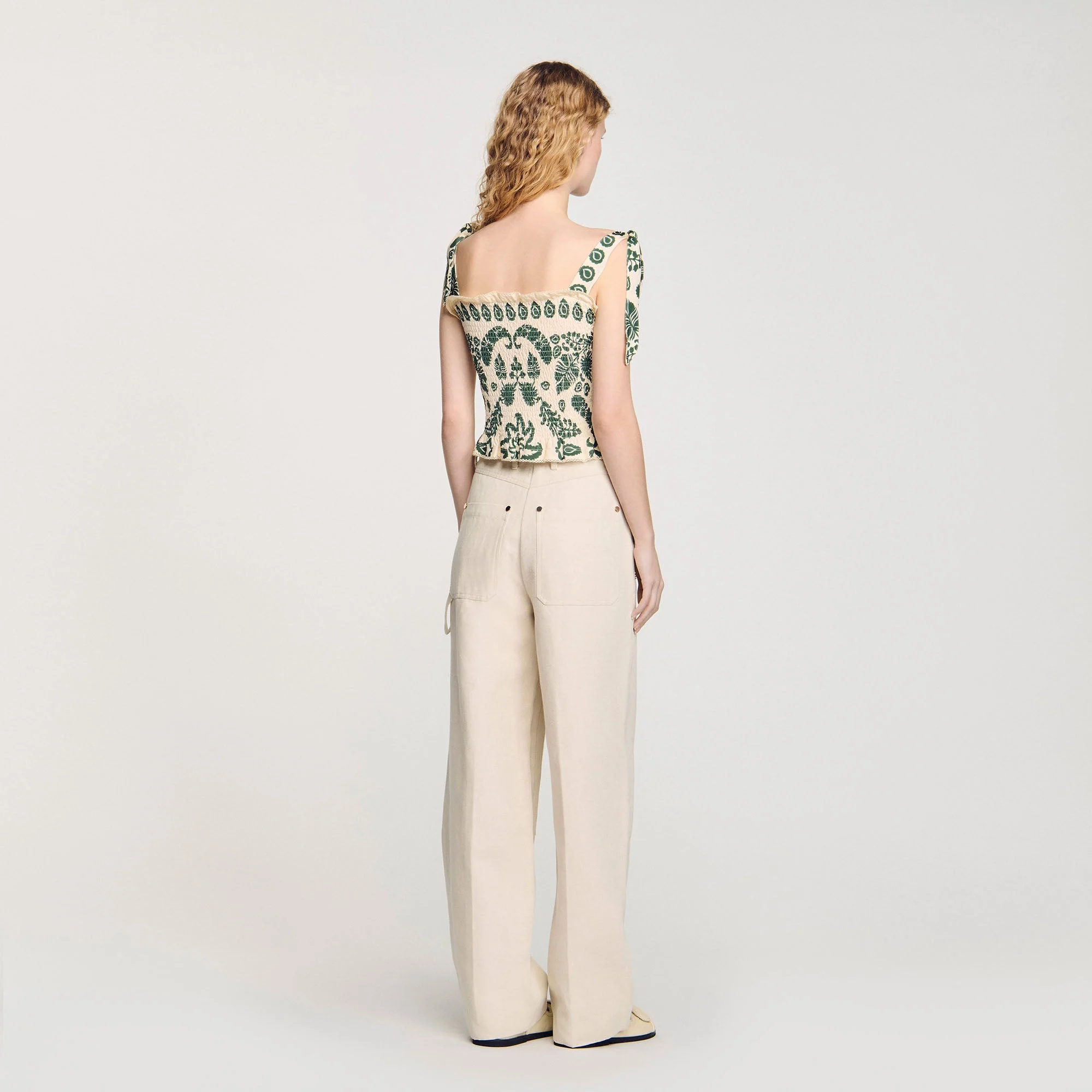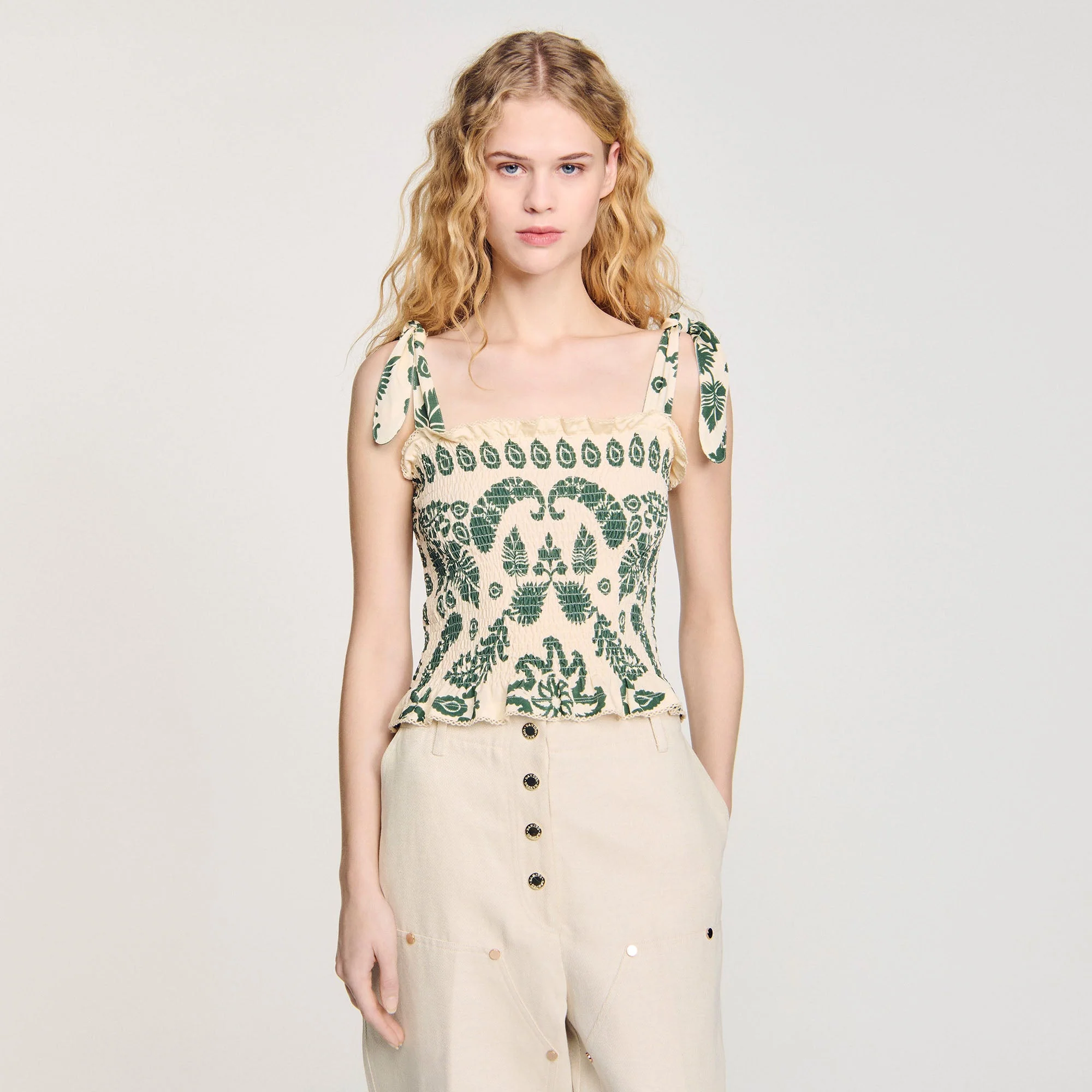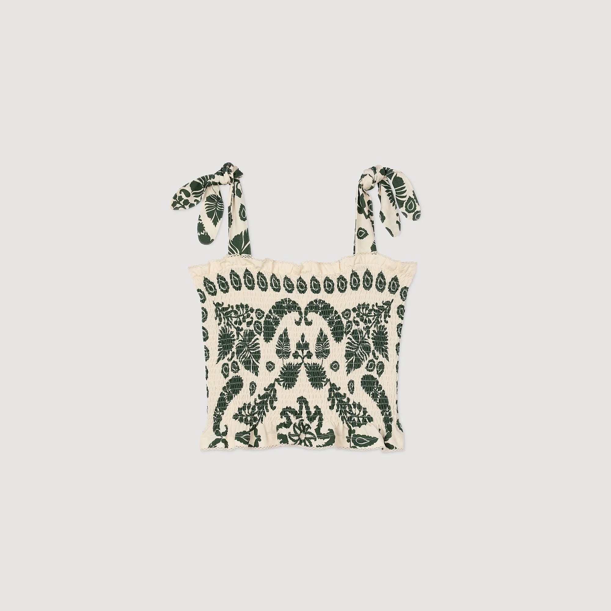 Top fruncido con estampado de flores, tirantes anudados y bordes con volantes.