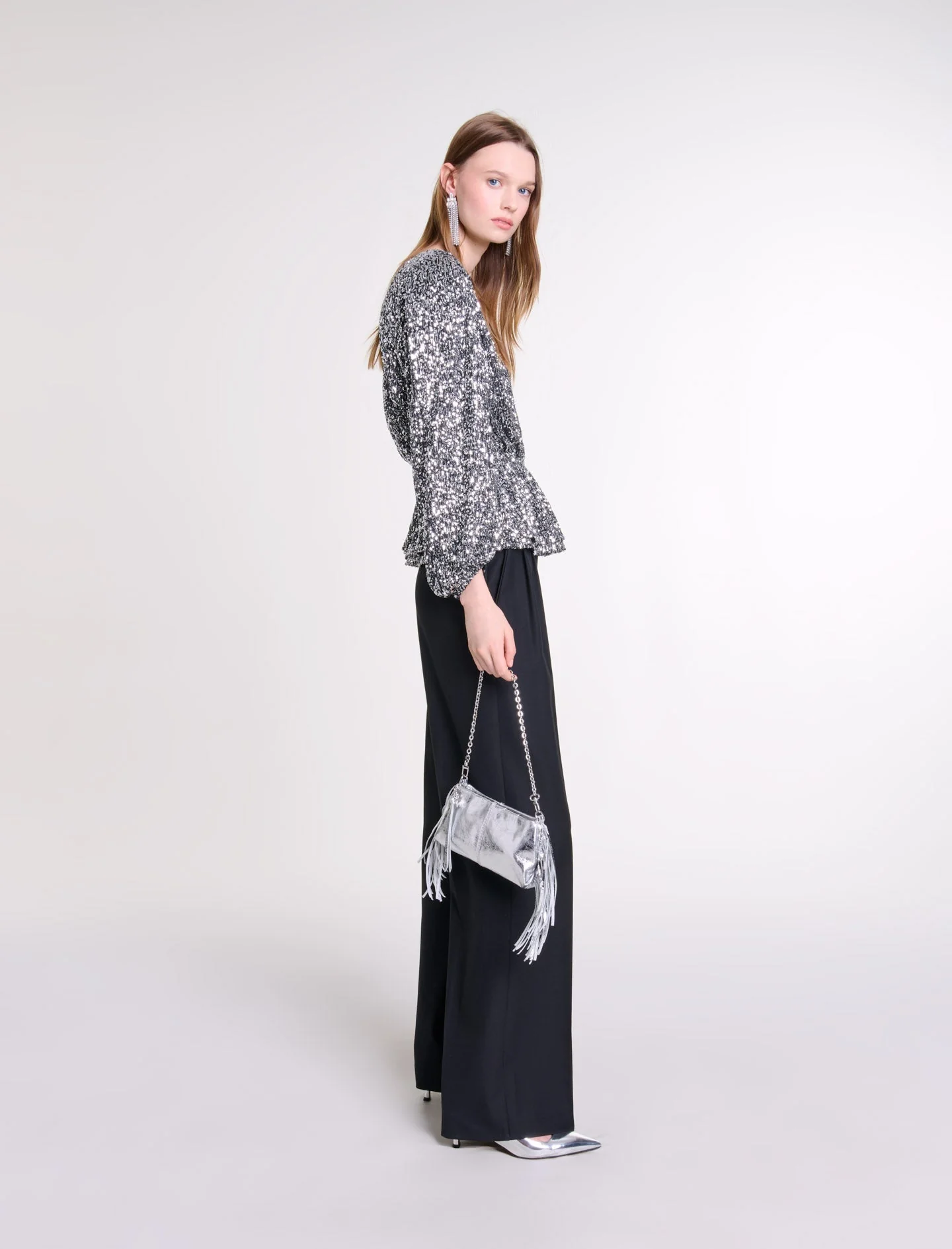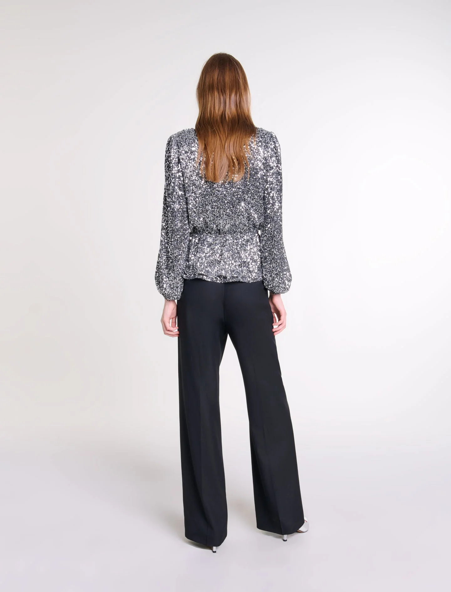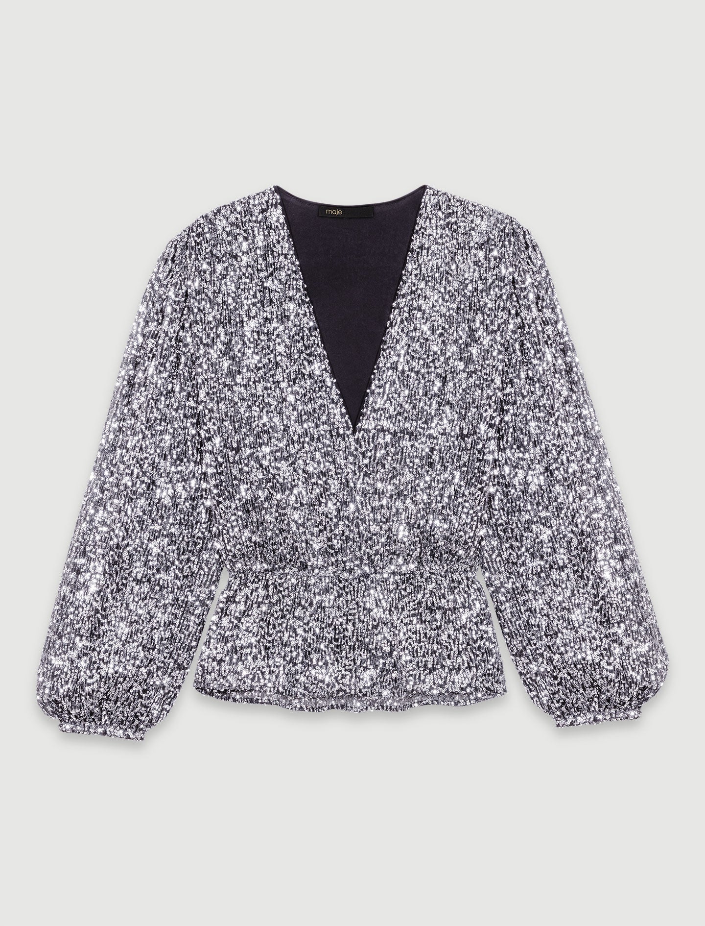 Este top de manga larga está adornado con lentejuelas plateadas en all-over para iluminar cualquier ocasión. Su cintura fruncida marca un escote pronunciado y un bajo voluminoso, creando un efecto de volantes.