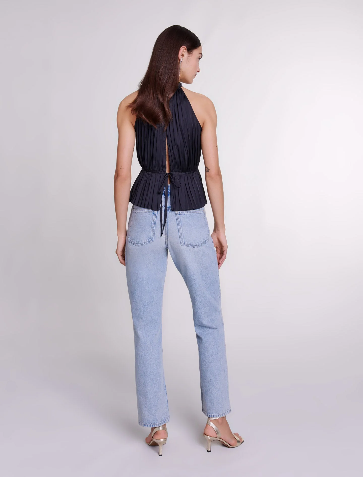 Muy elegante, este top recto satinado delicadamente plisado añade estilo al instante a sus conjuntos. Con sisas americanas y un botón recubierto en la nuca, revela un cuello con volantes y una espalda abierta. Con lazos para anudar en la espalda, confiere una silueta estructurada y entallada.
