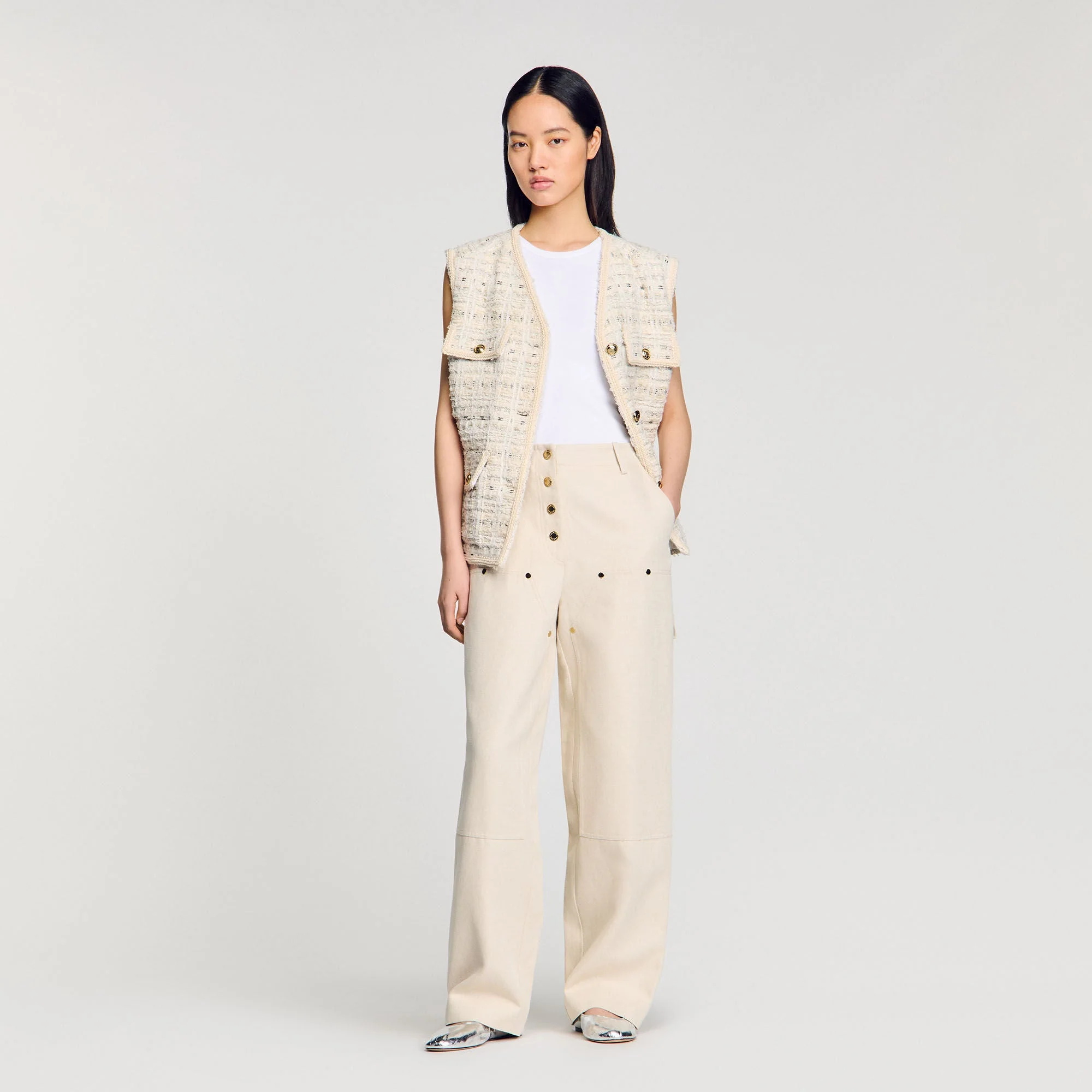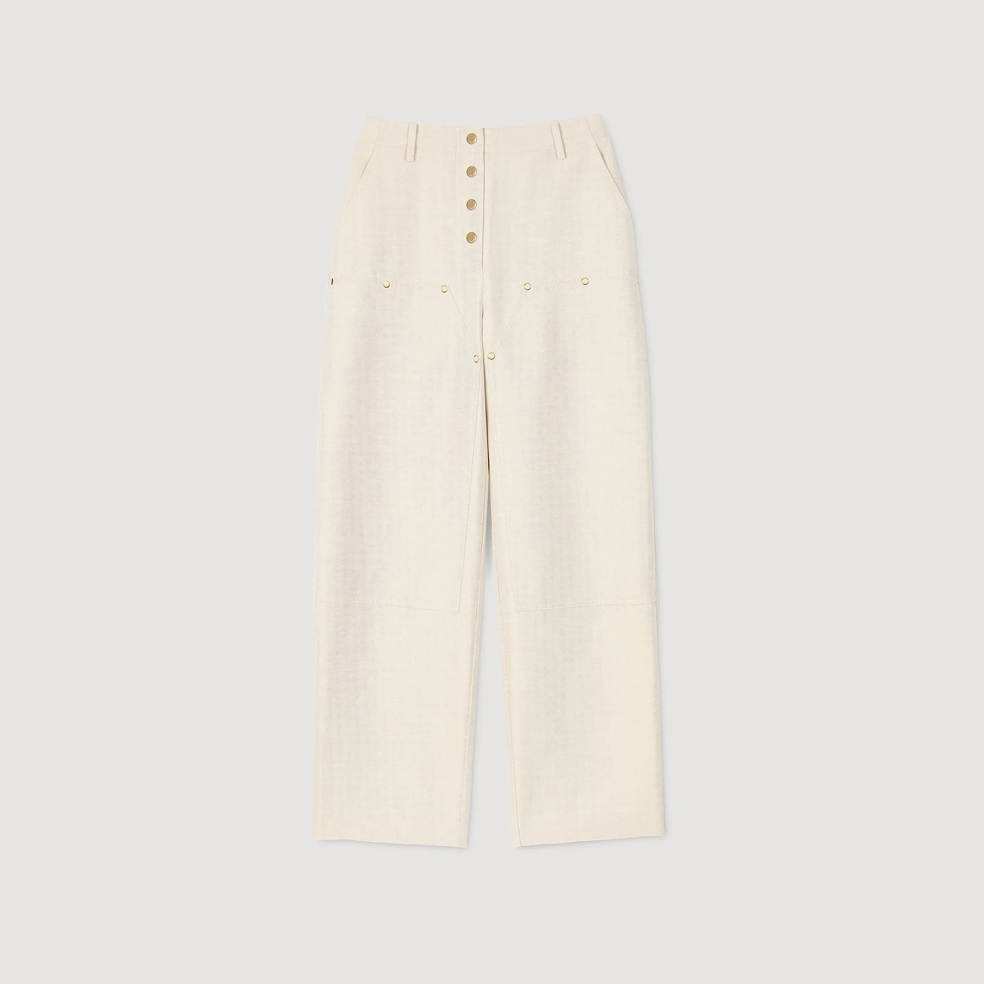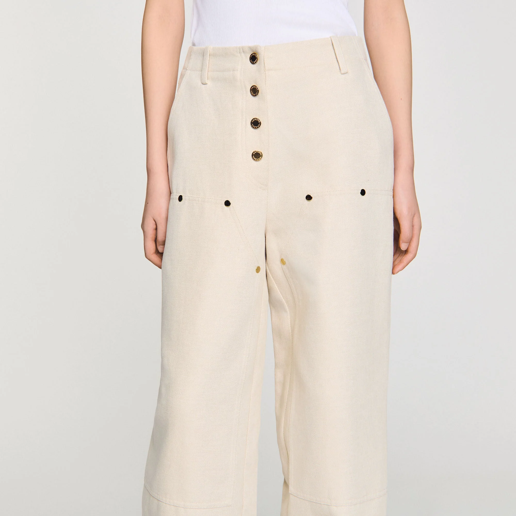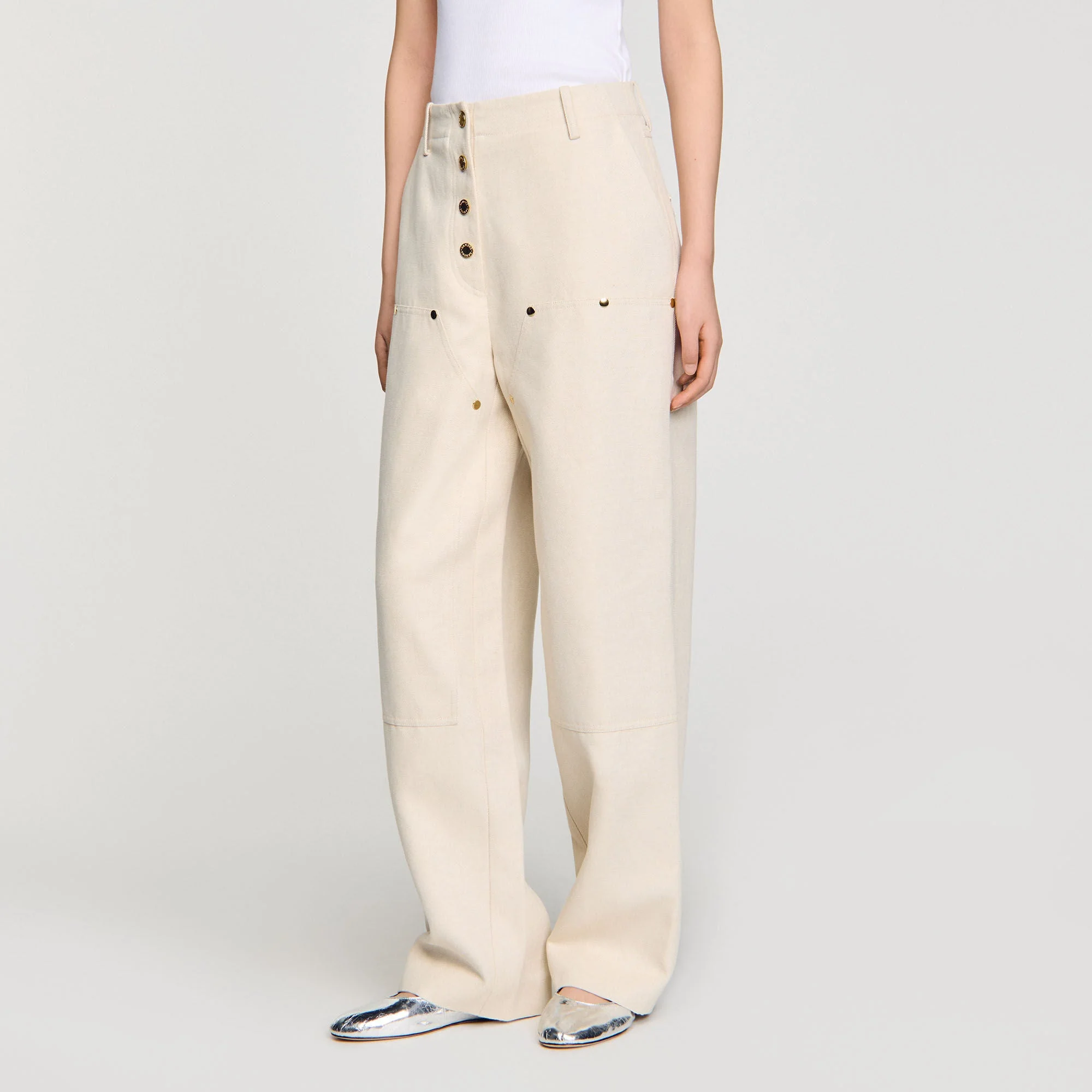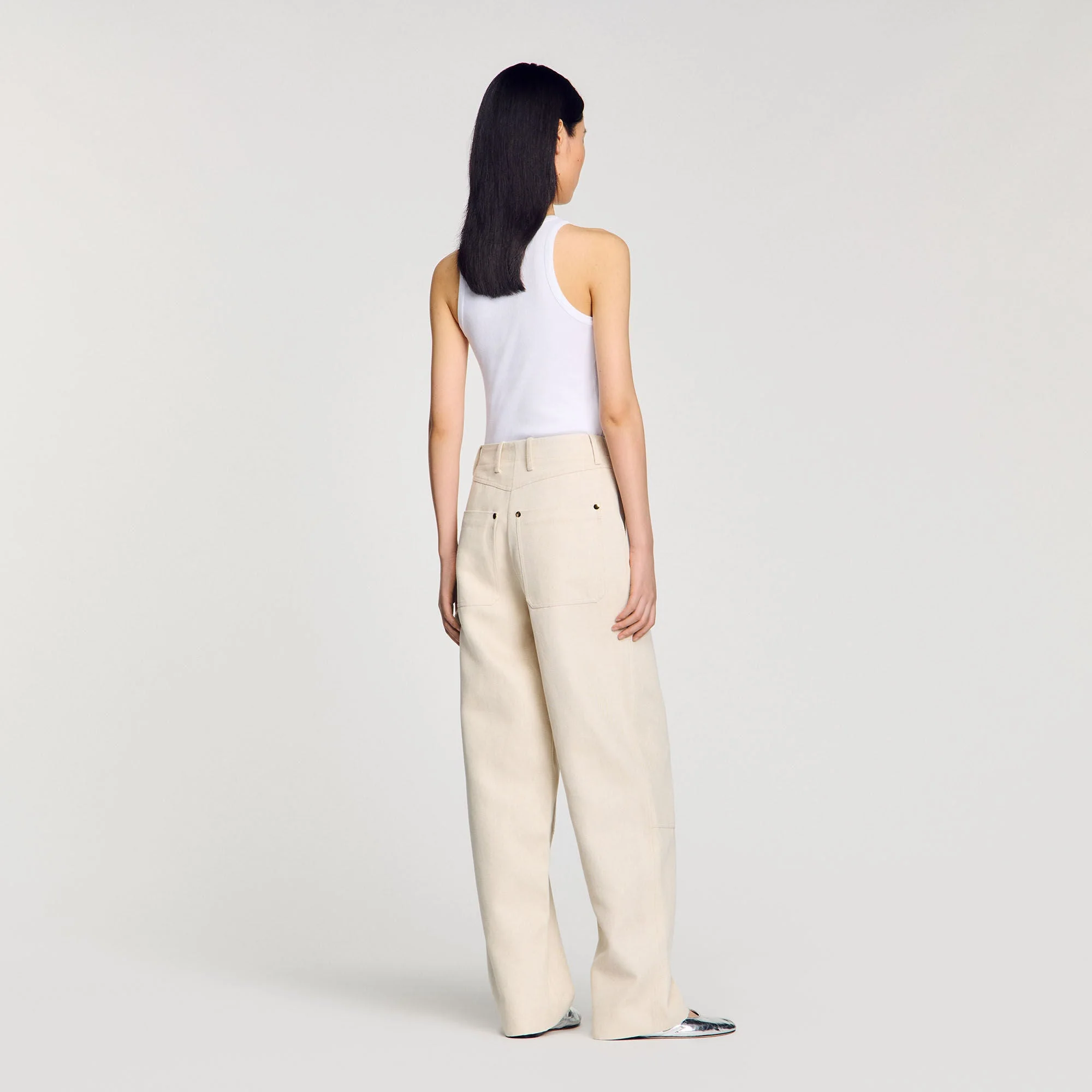 Vaquero carpenter ancho con talle alto, aplique pespunteado con remaches y bolsillos.