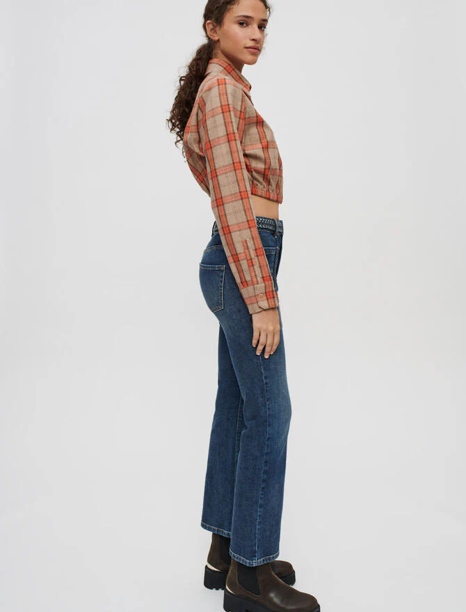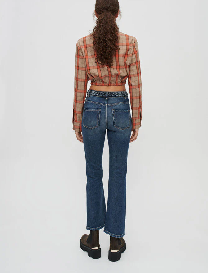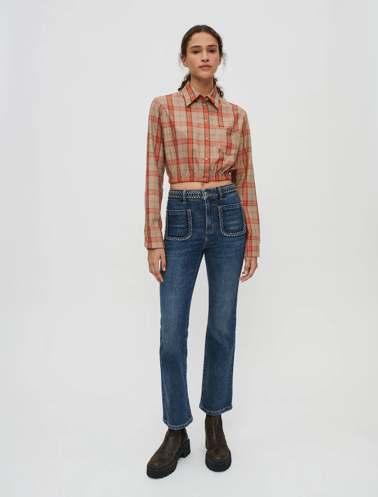 Vaquero ligeramente acampanado de tiro medio y desgastado. Botones metálicos con las siglas de Maje y cremallera oculta. Detalle trenzado en la cintura y alrededor de los bolsillos de parche delanteros. Bolsillos en la parte trasera. Trabillas en la cintura.Ref.: MFPJE00392