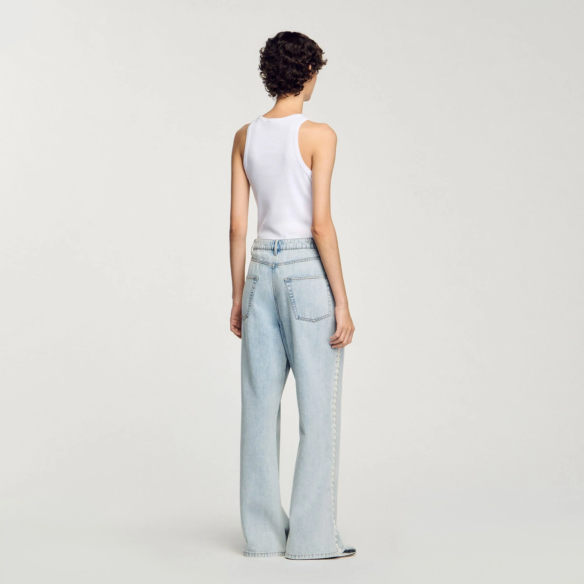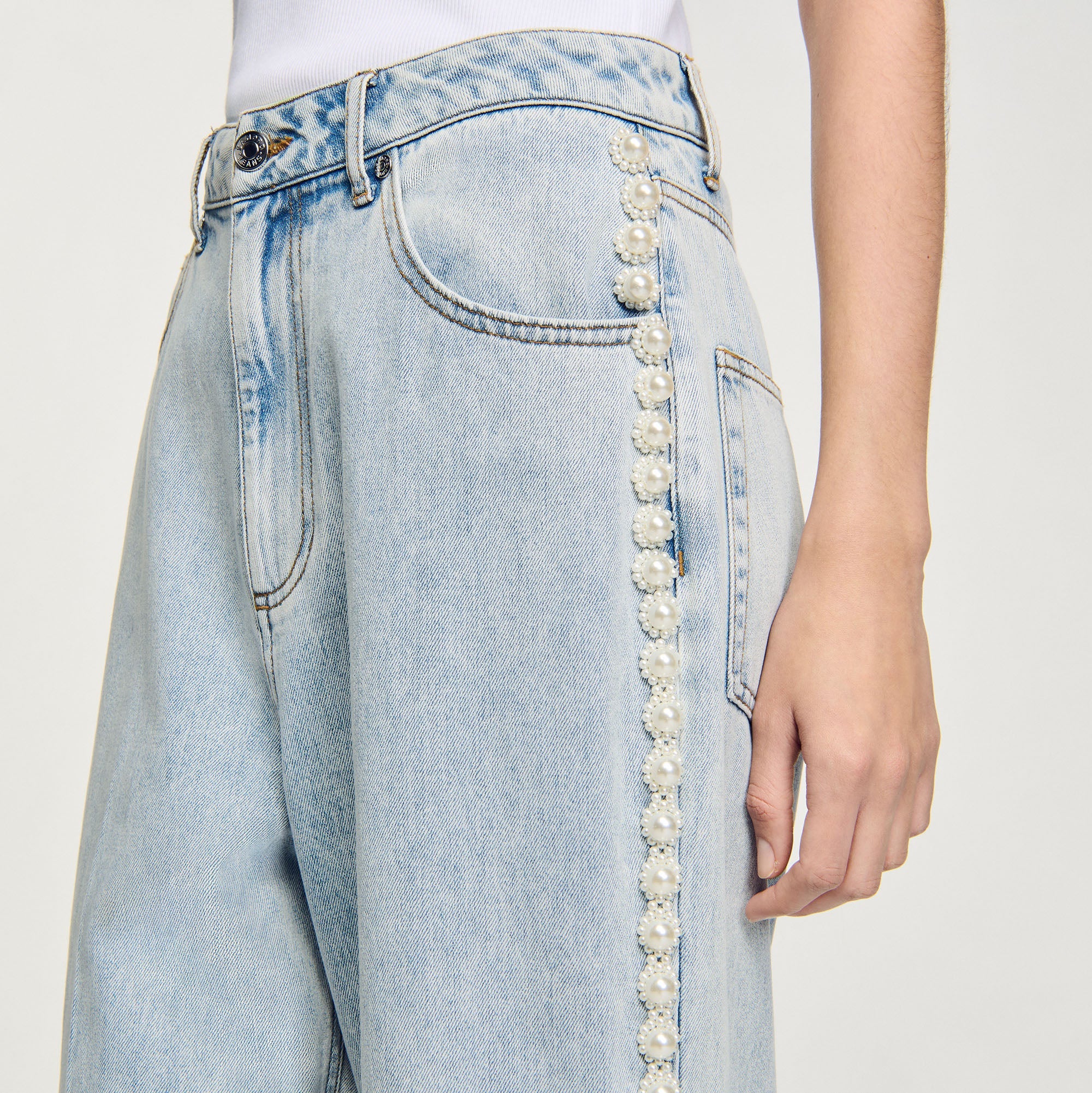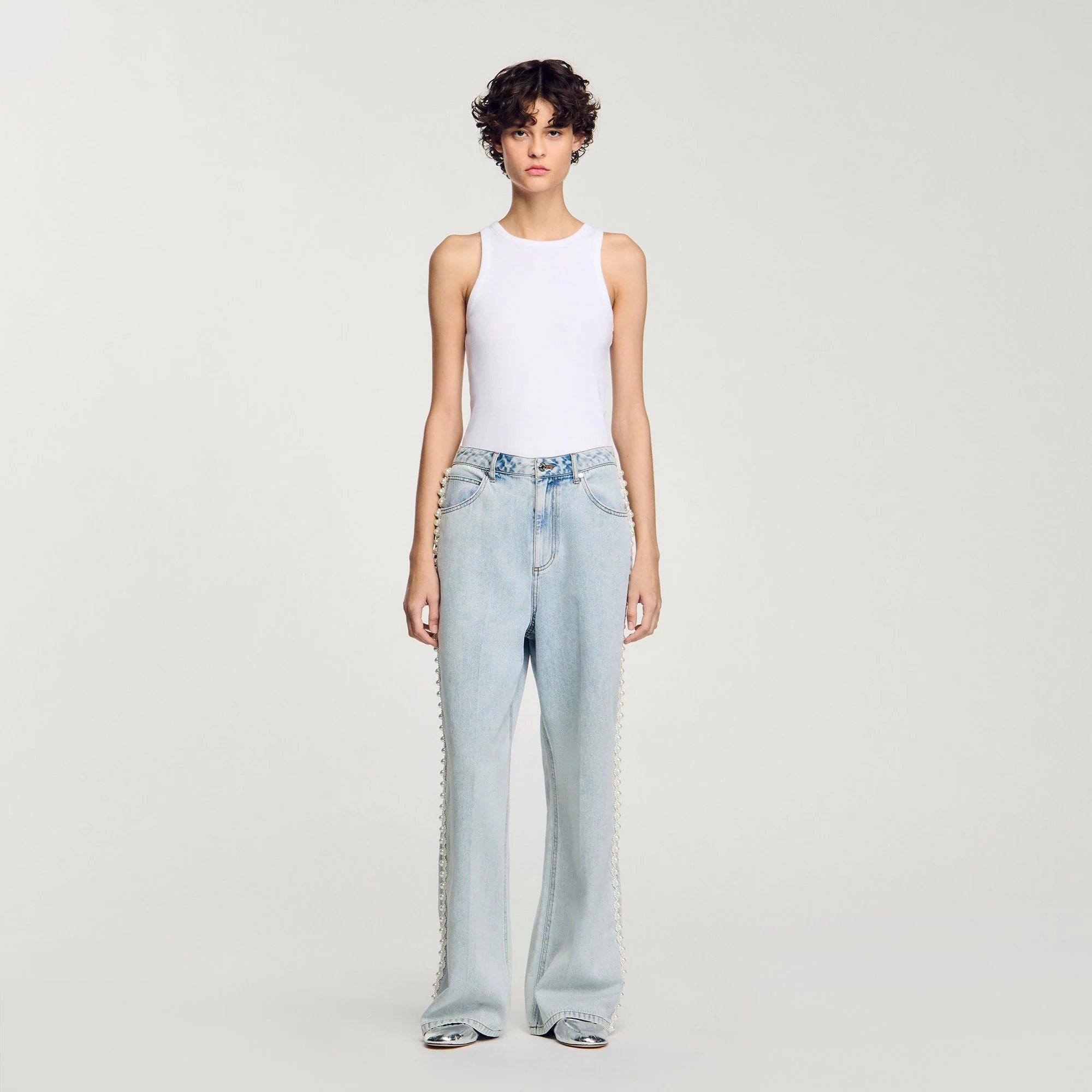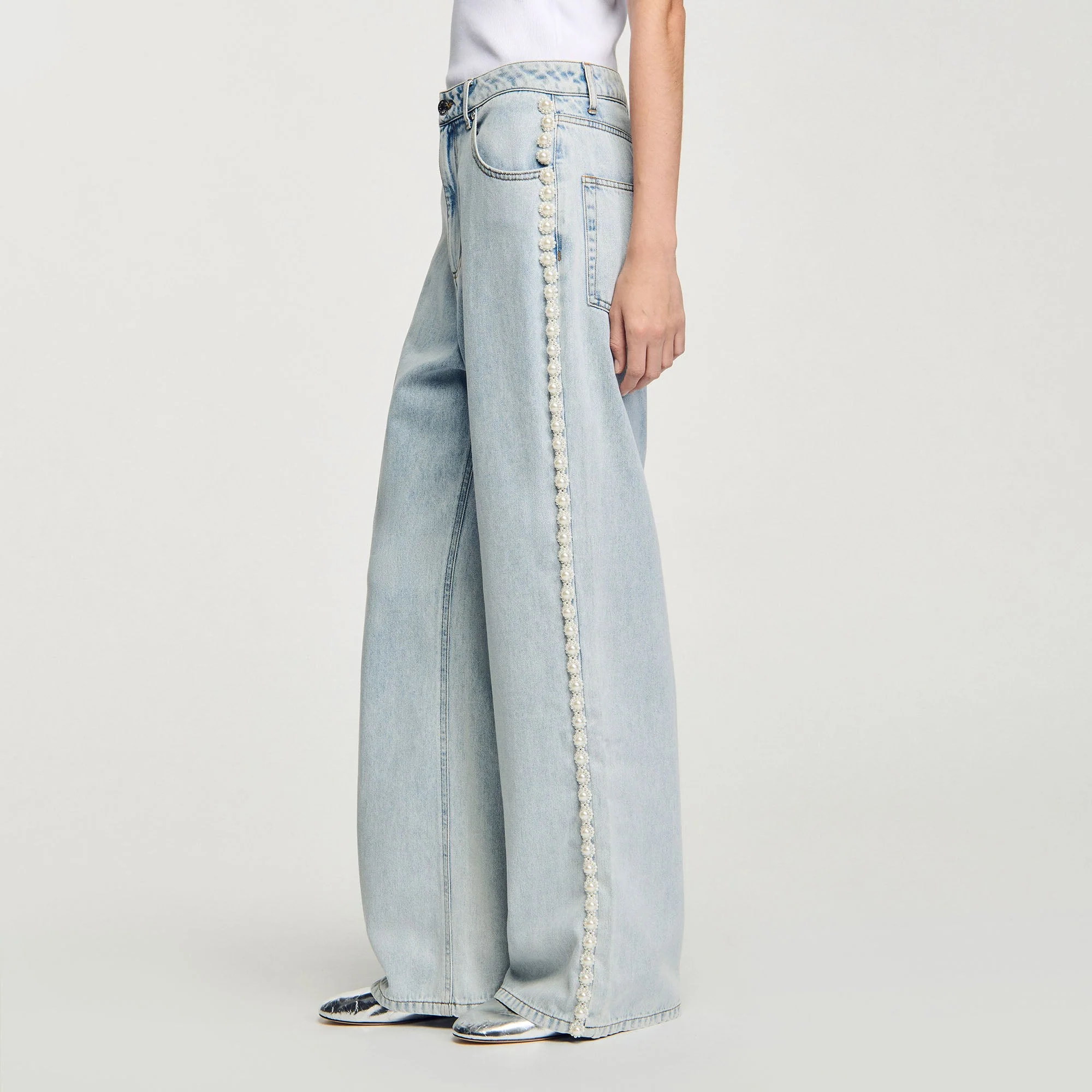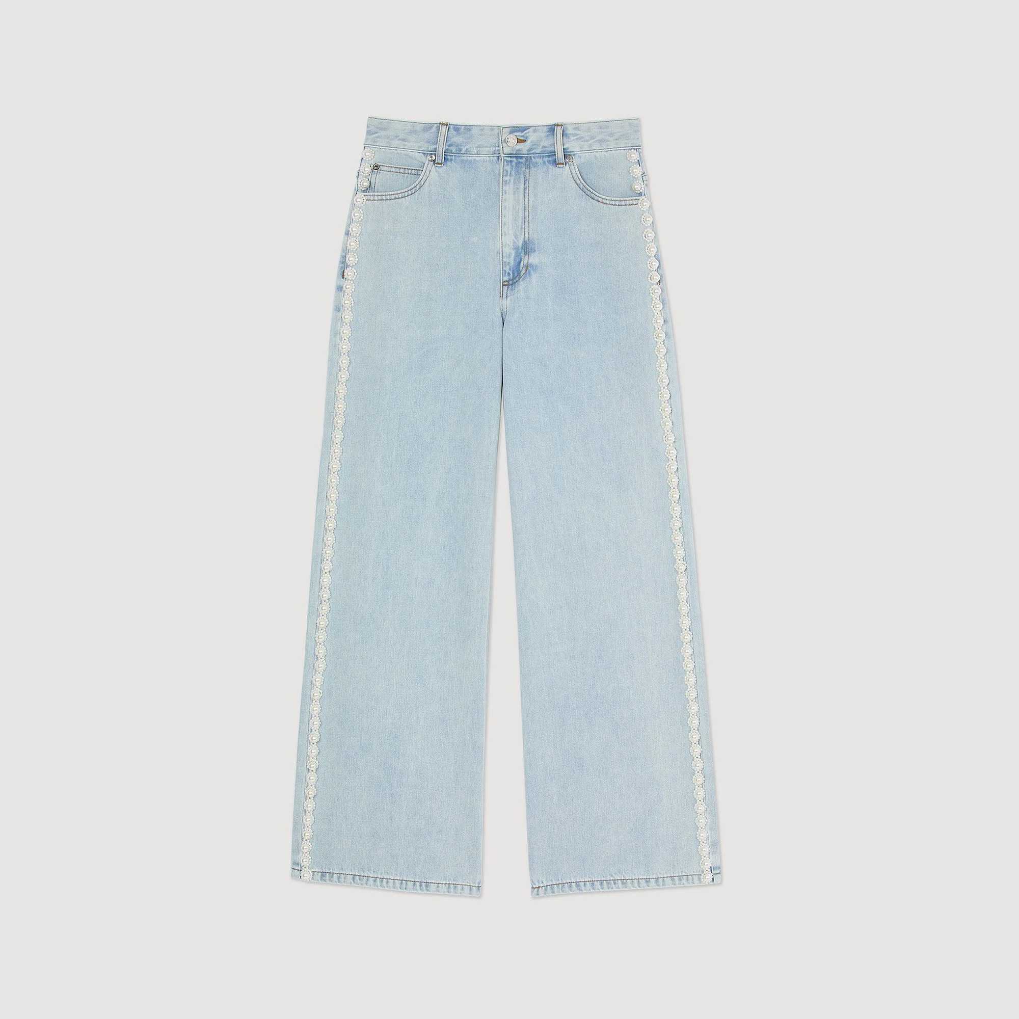 Vaquero desteñido con detalle de pedrería bordada en forma de flores a lo largo de la pierna.