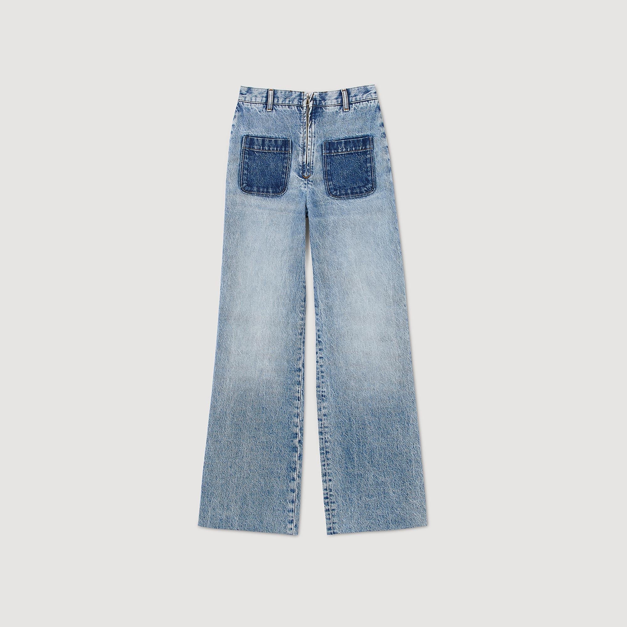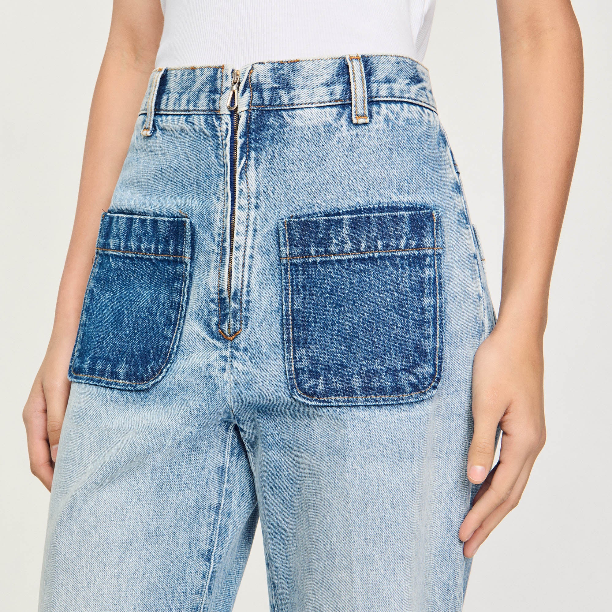 Vaquero de talle alto con pierna ancha y bolsillos delanteros de parche con lavado en contraste.