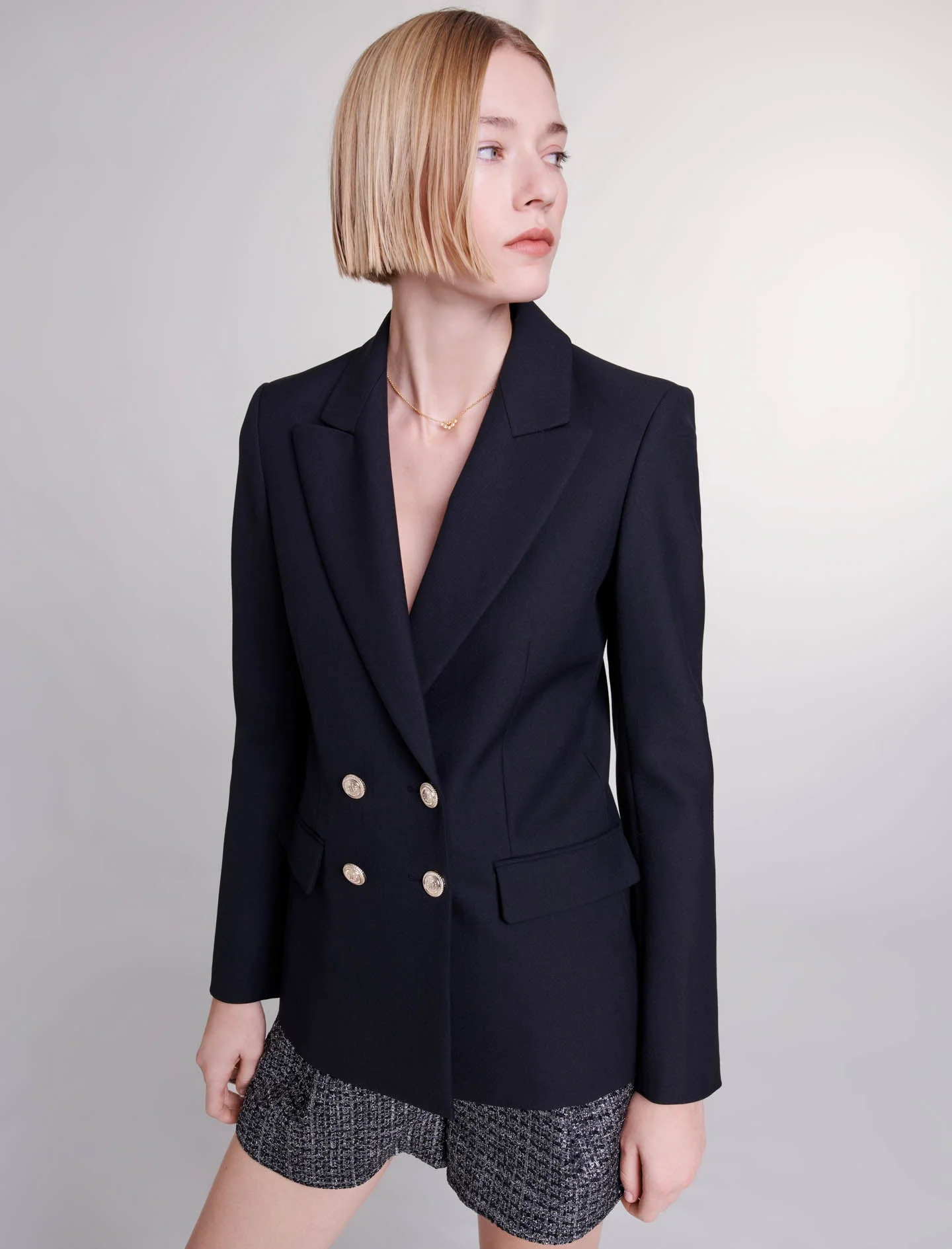 Oda a la elegancia británica, el estudio rinde homenaje a los grandes clásicos con una vuelta de tuerca con detalles sexis para crear siluetas cautivadoras.Una pieza clásica del guardarropa femenino, esta chaqueta de traje de mezcla de lana es perfecta para el día o la noche. Con un cuello sastre y forro con el trébol, revela un cierre de doble botonadura con las siglas, dos bolsillos con solapa y tres botones dorados con el trébol en las mangas largas. Su corte entallado crea una silueta estructurada con un ajuste perfecto.Encarnando la elegancia sin esfuerzo, dele una vuelta de tuerca a su «look» con un top elegante, un pantalón de traje, bisutería y un par de zapatos de salón.Ref : MFPVE00570