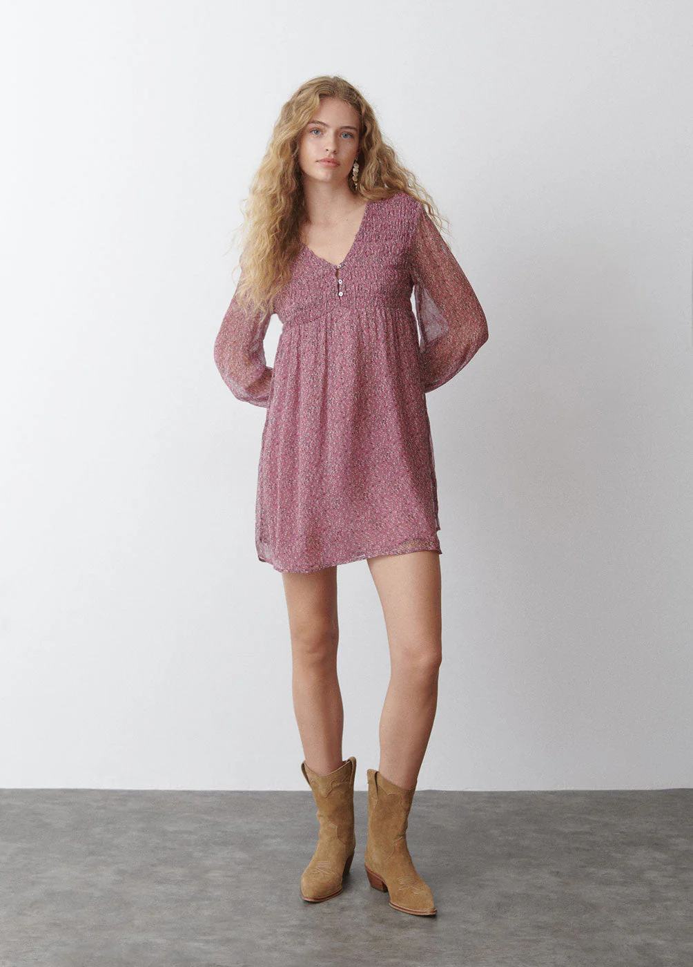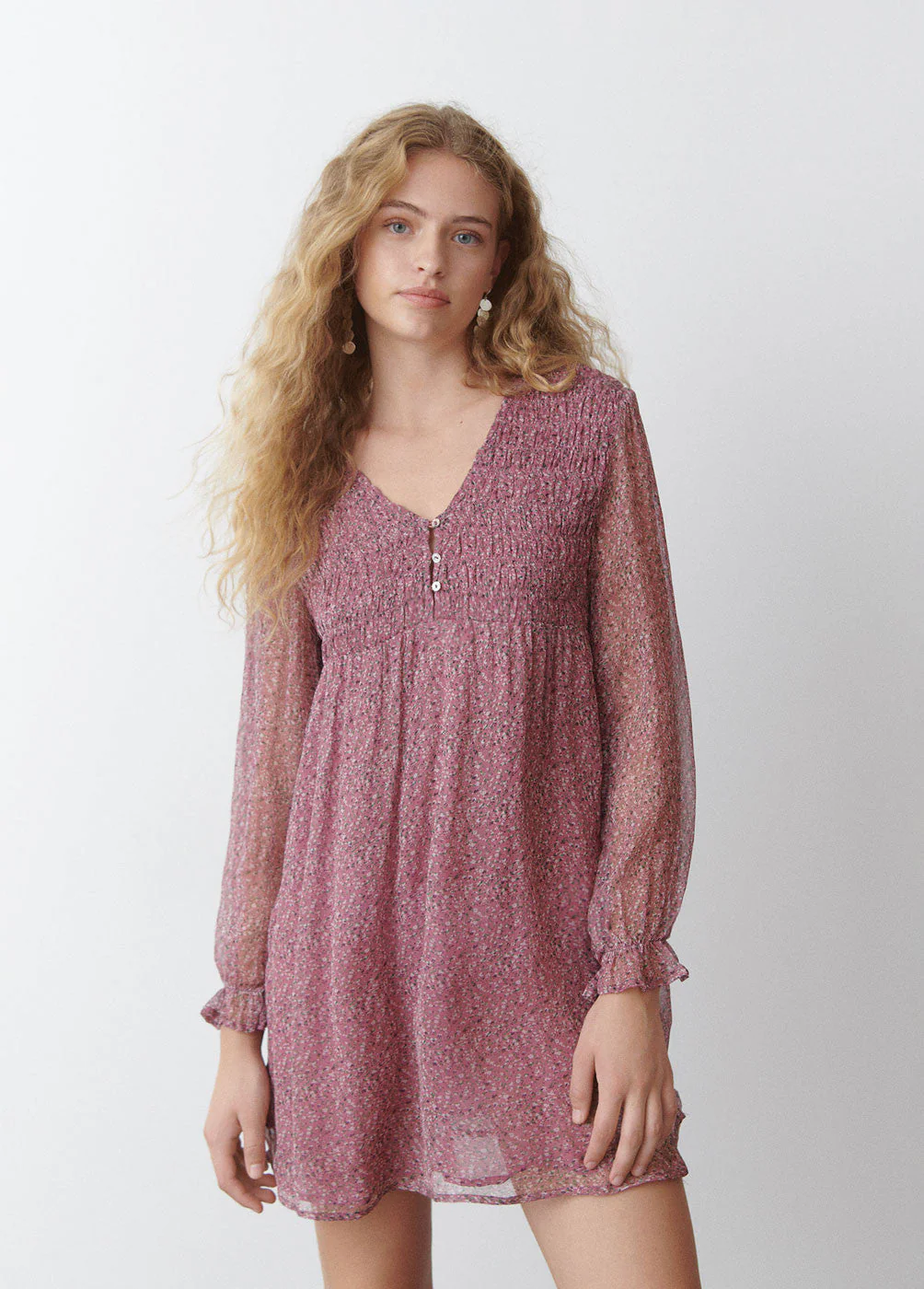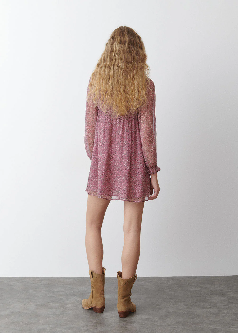 Vestido corto fluido estampado, manga larga abullonada, escote en pico y cuerpo fruncido. Ref: W24-0483-012-406.