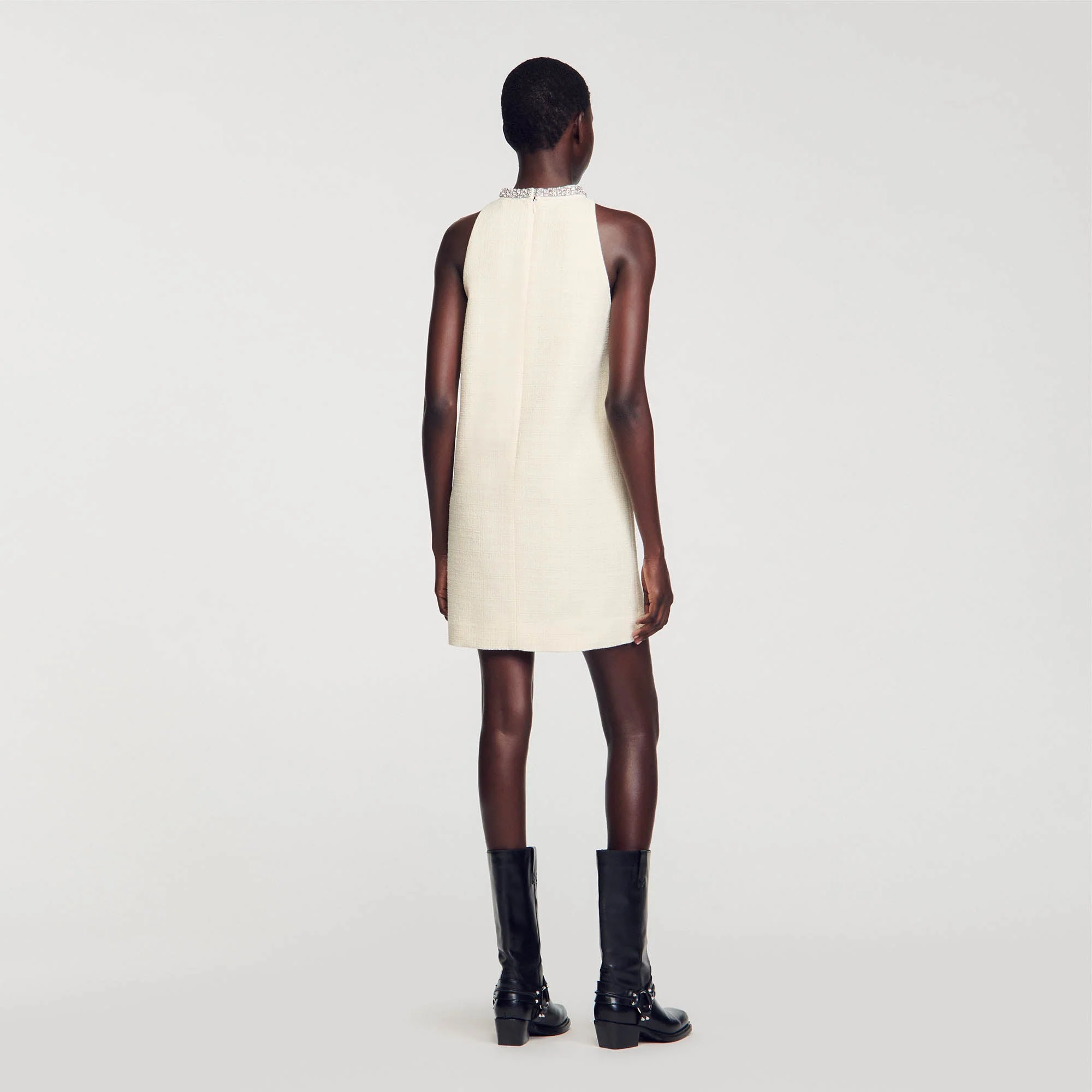 Vestido corto de tweed con sisas americanas, con cuello redondo decorado con pedrería.