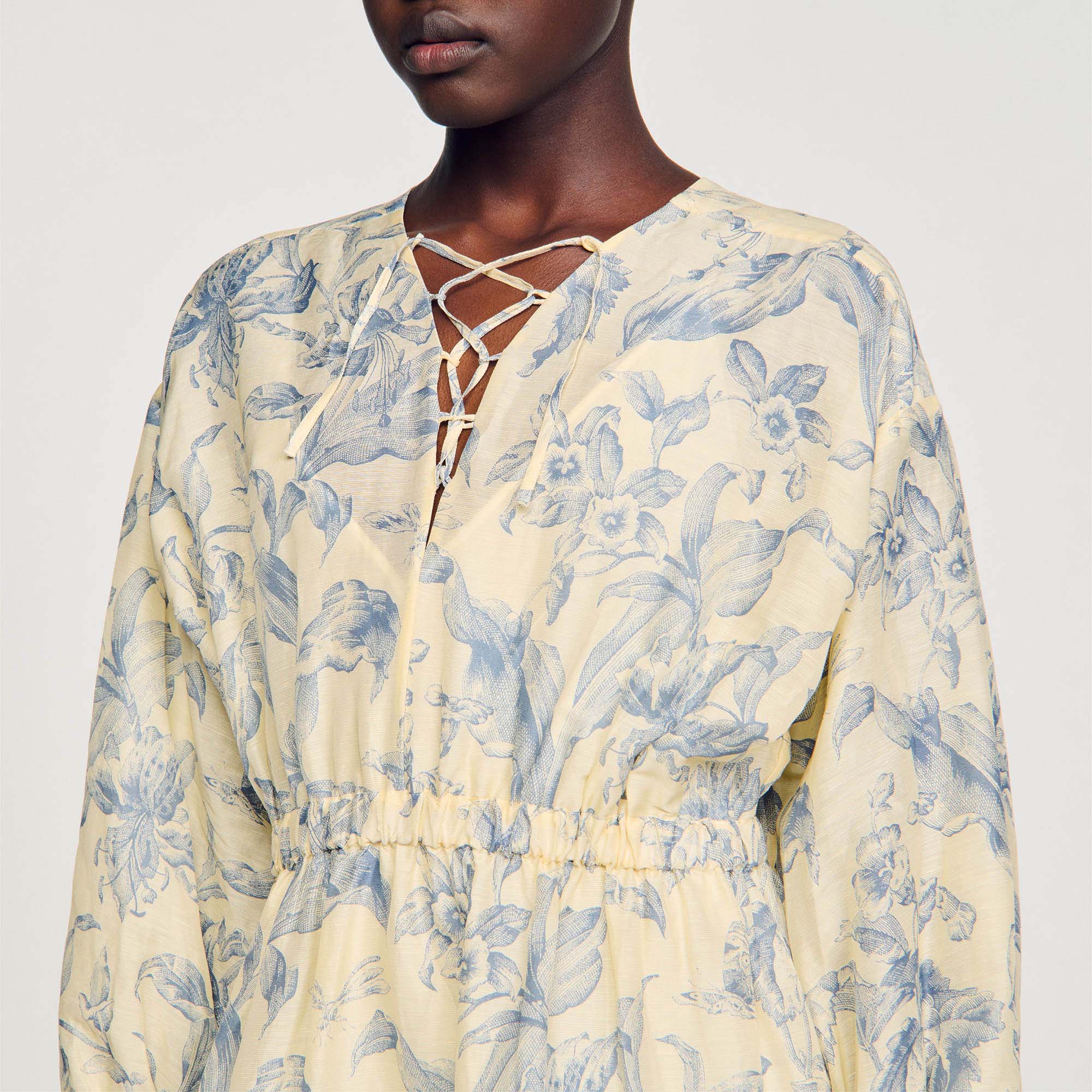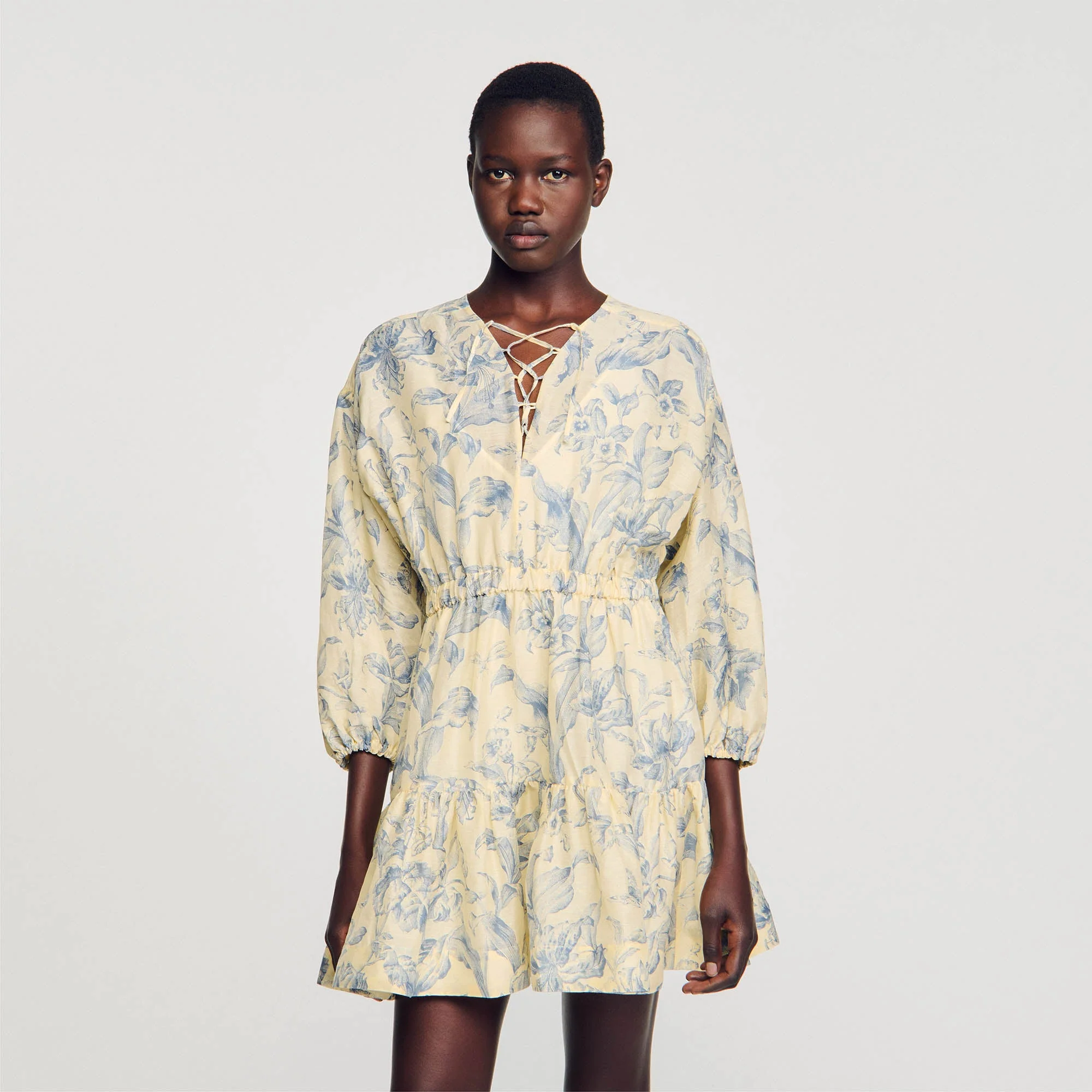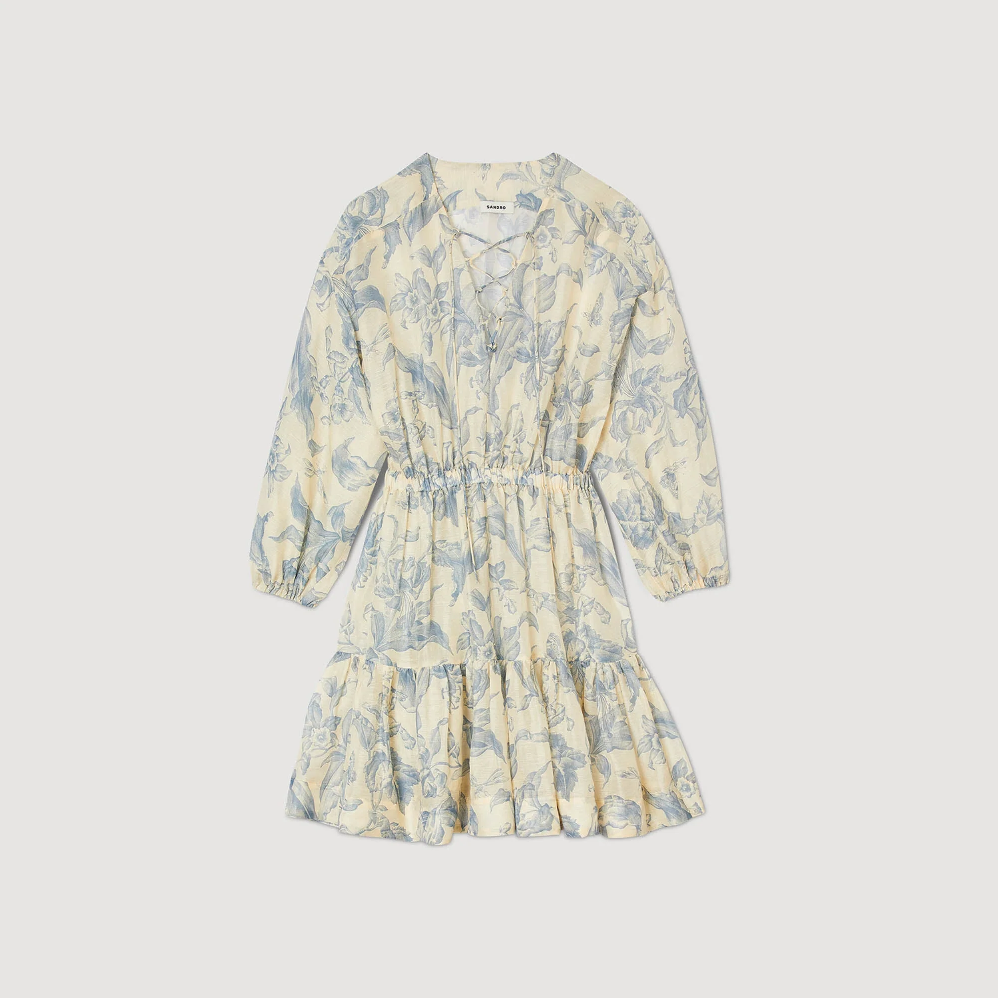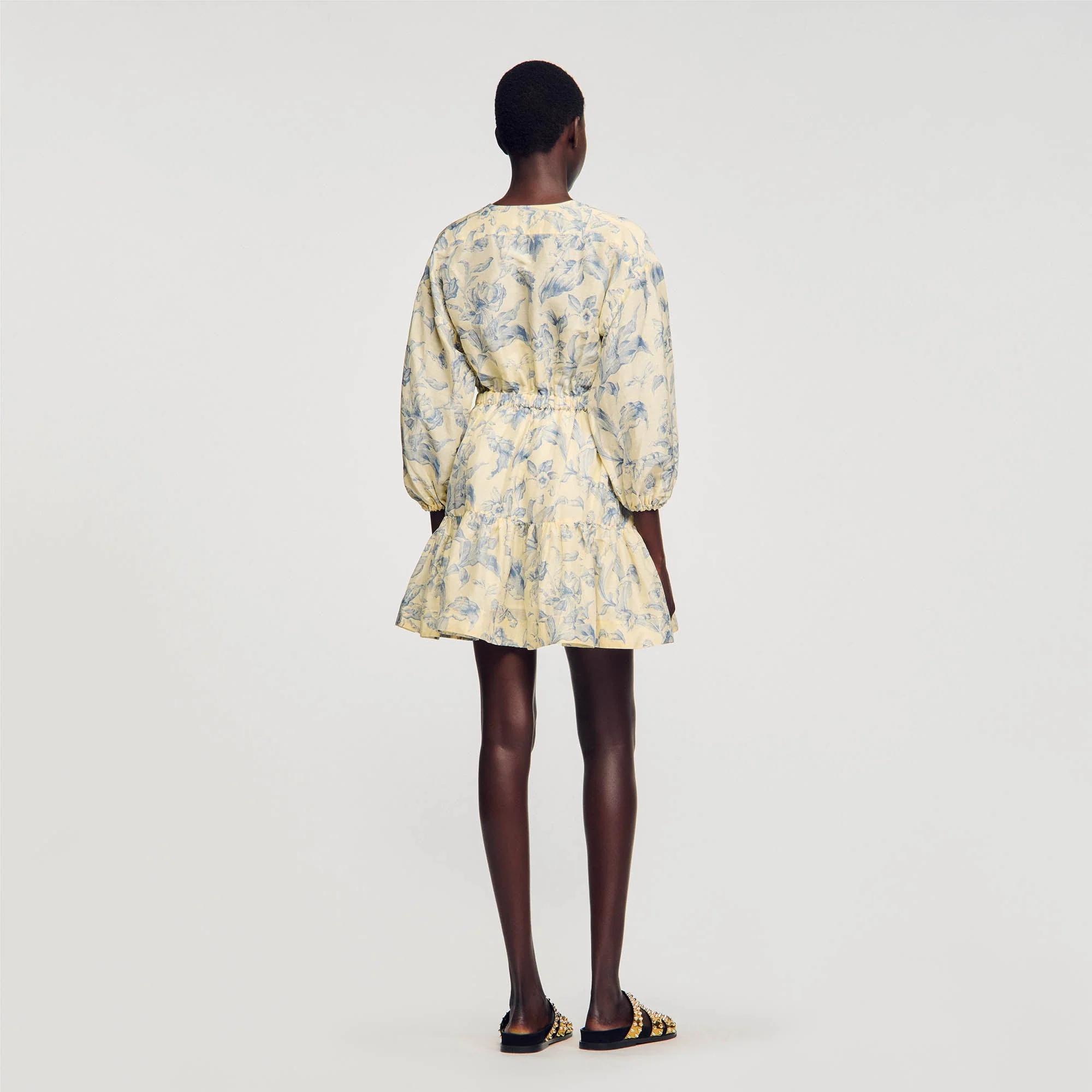 Vestido corto con estampado de flores, escote de pico con lazada, manga larga voluminosa con puño ajustado, cintura elástica y falda voluminosa con volantes.