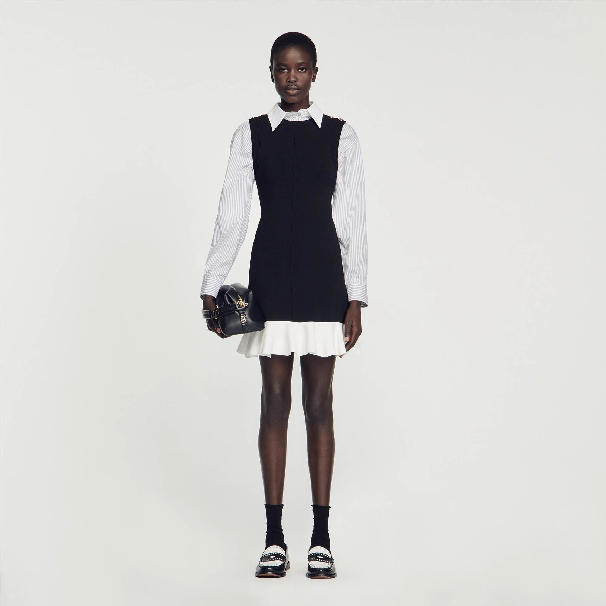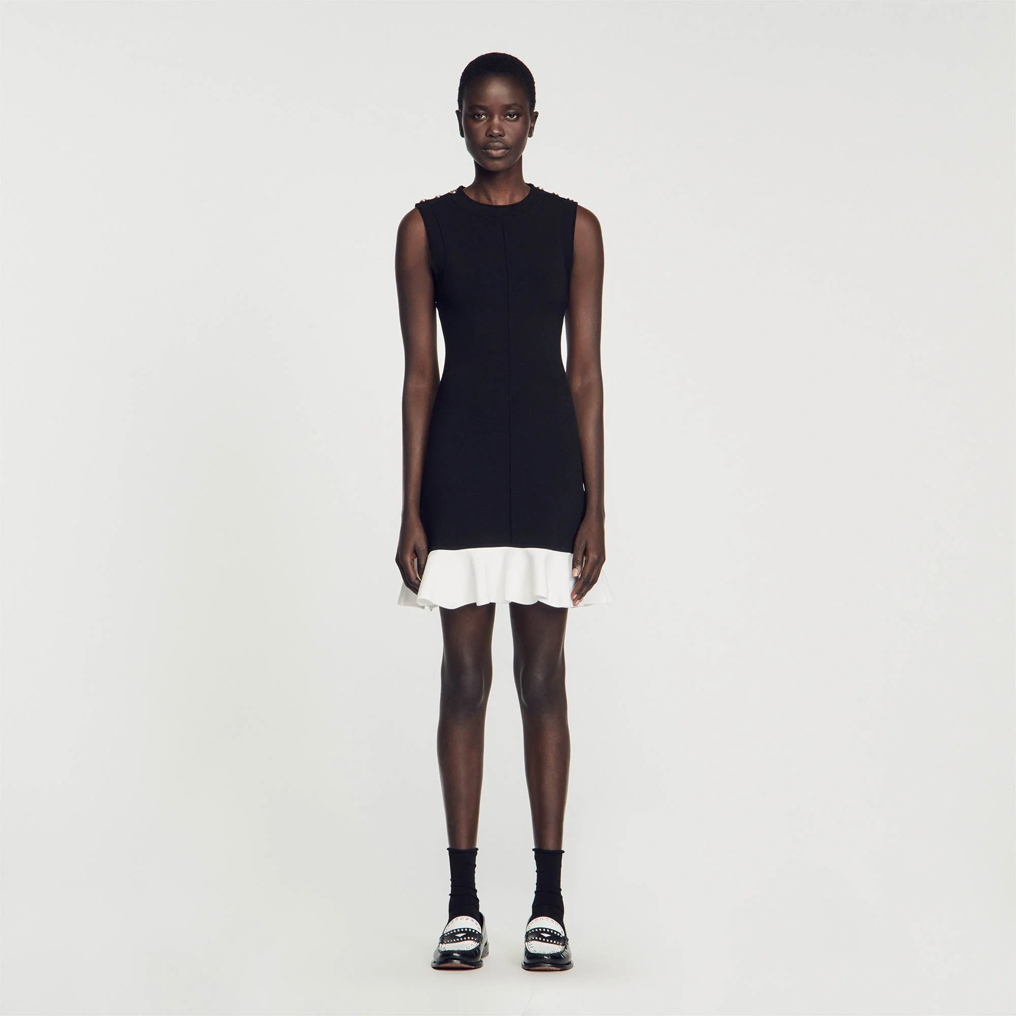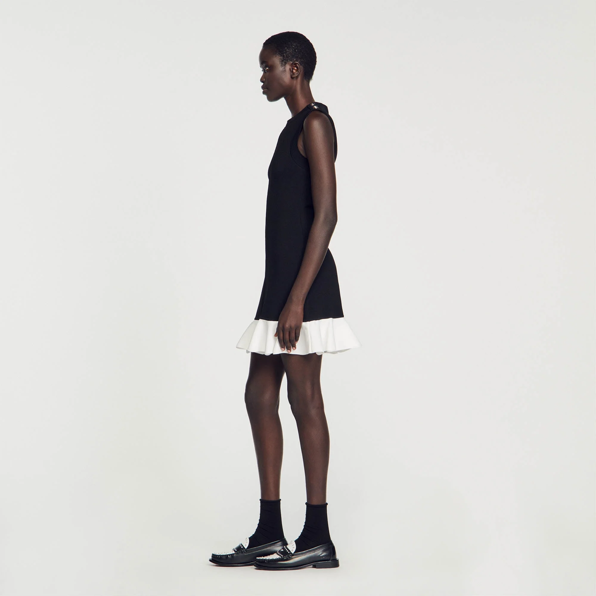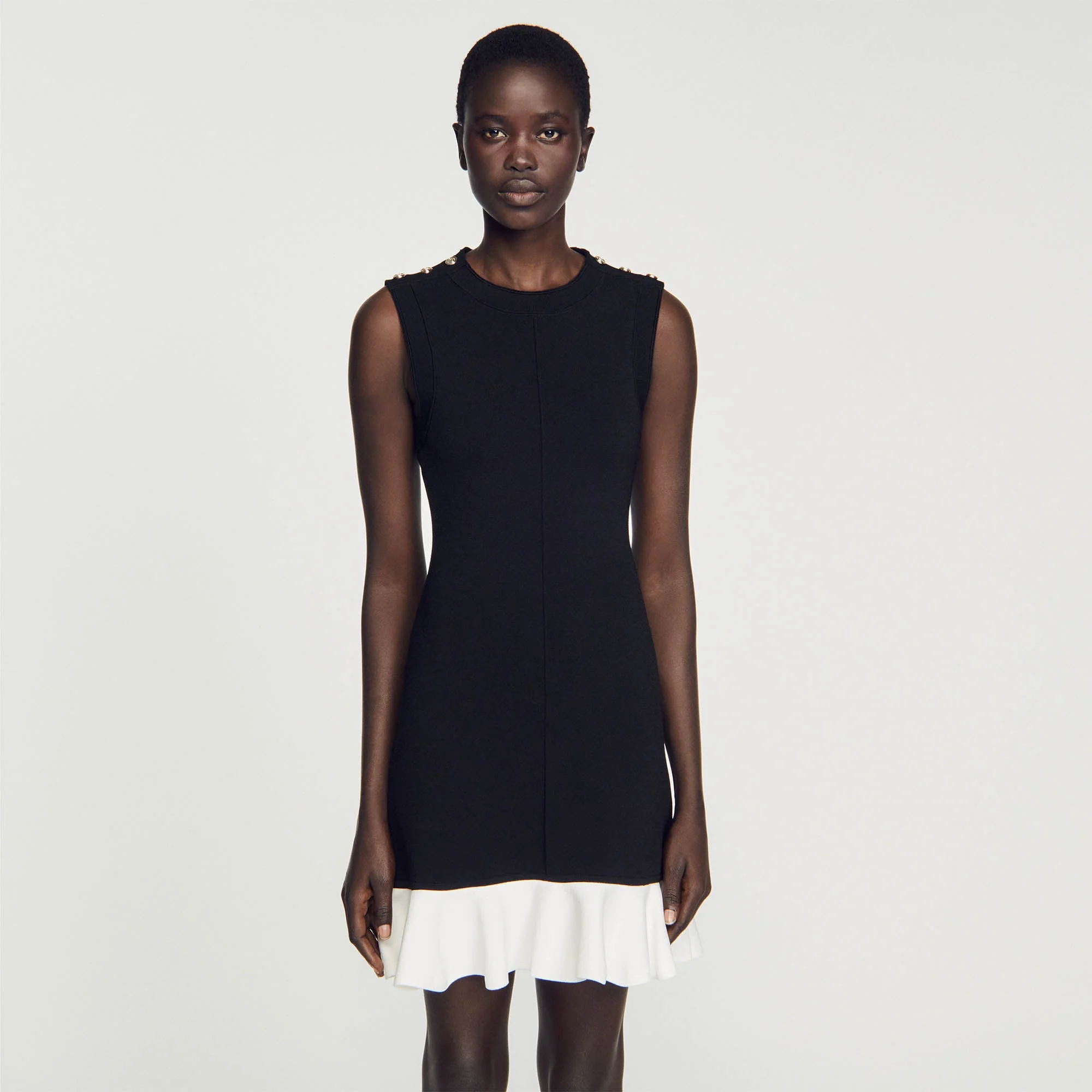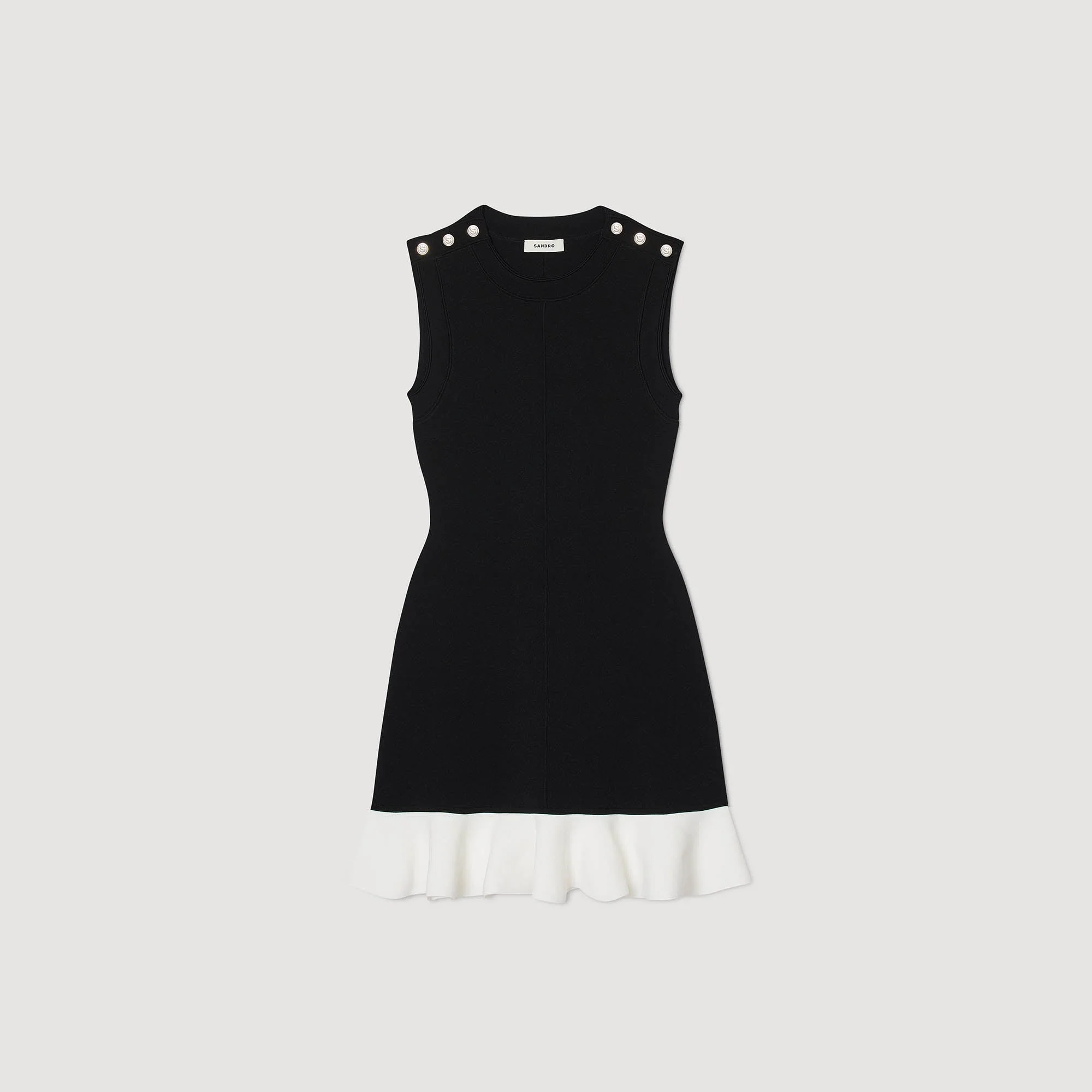 Vestido corto sin mangas, con un cuello redondo, falsos botones en los hombros, con un volante que contrasta en la parte inferior de la falda.