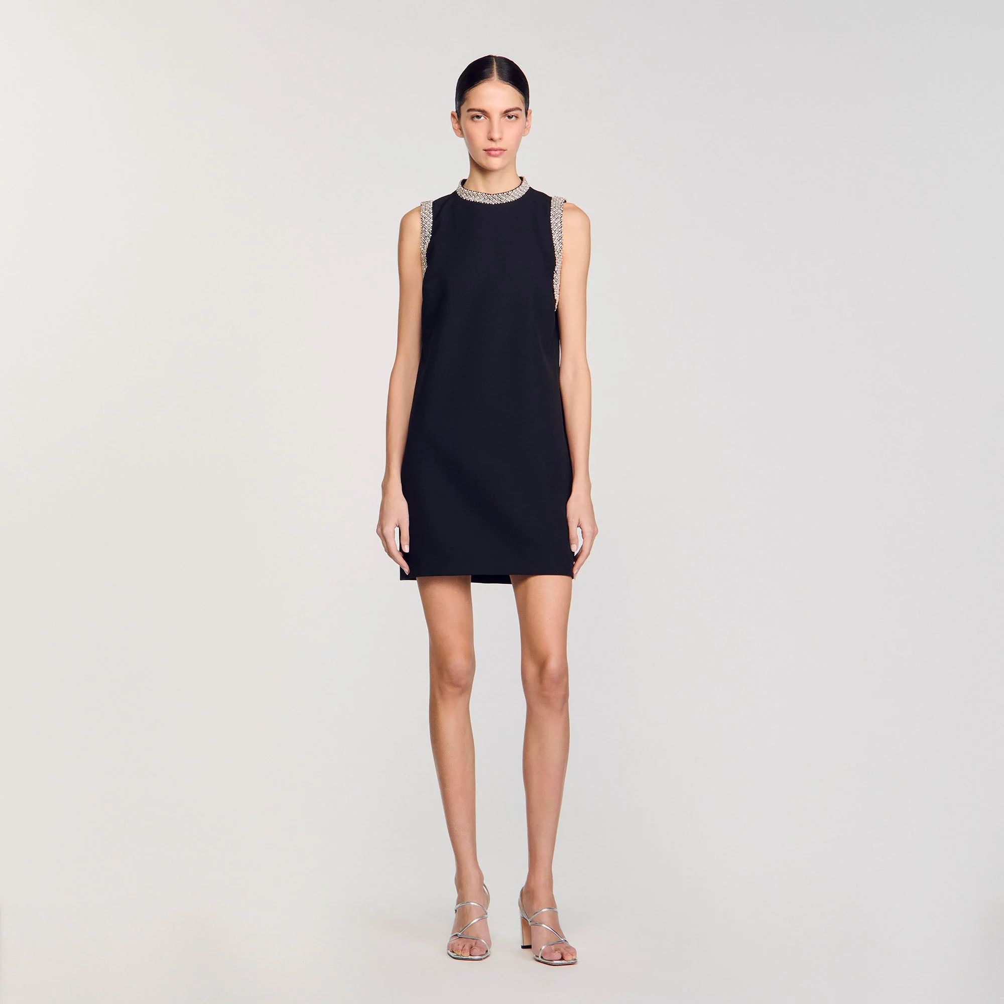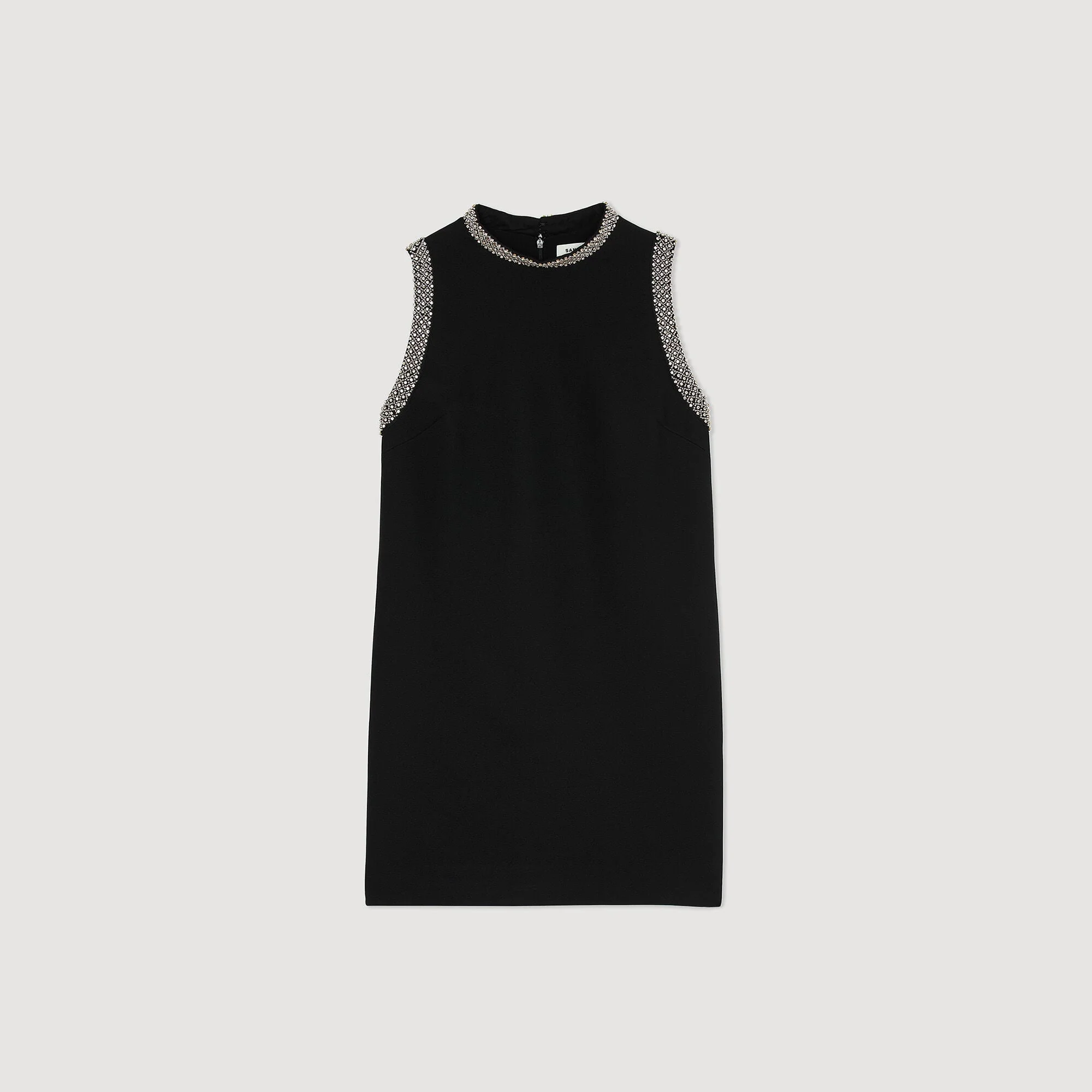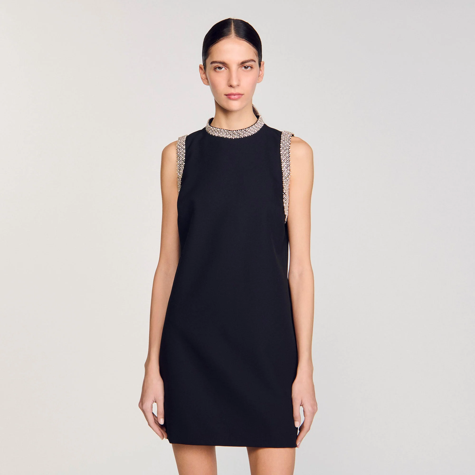 Vestido corto sin mangas con cuello subido adornado con ribetes de strass en el escote y las sisas.