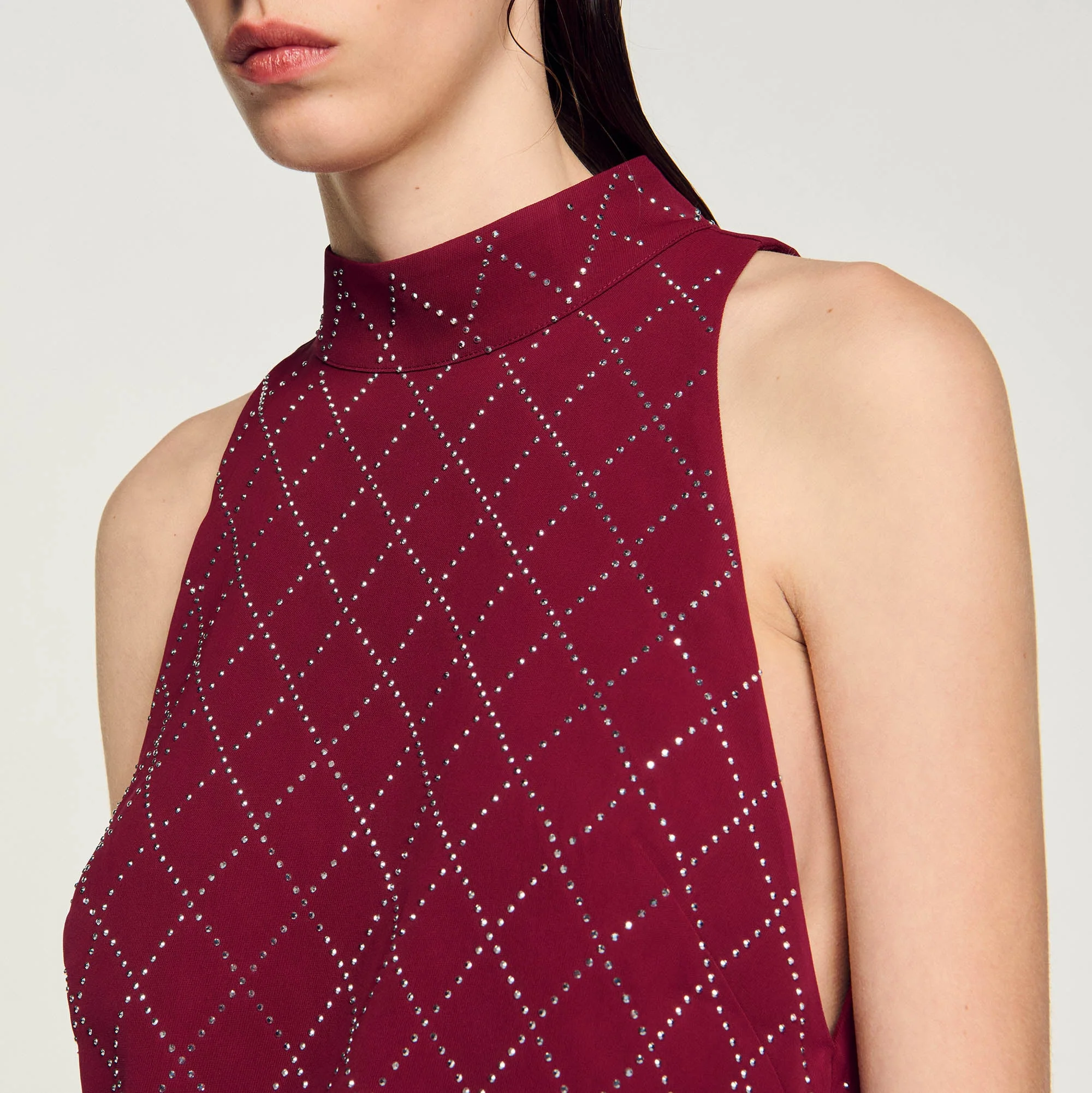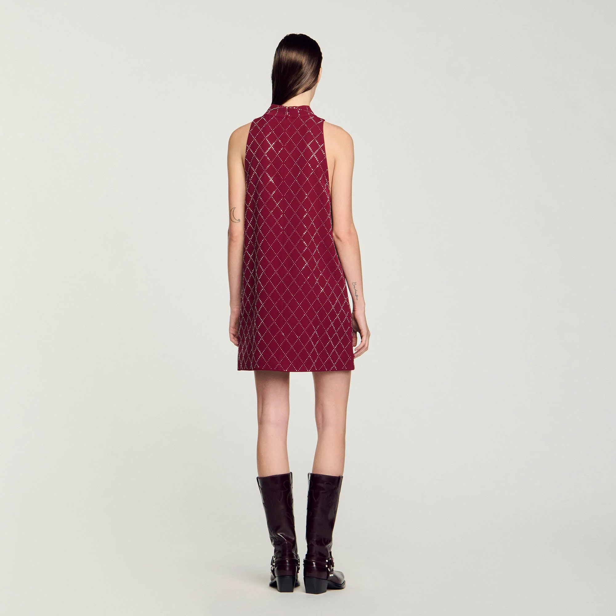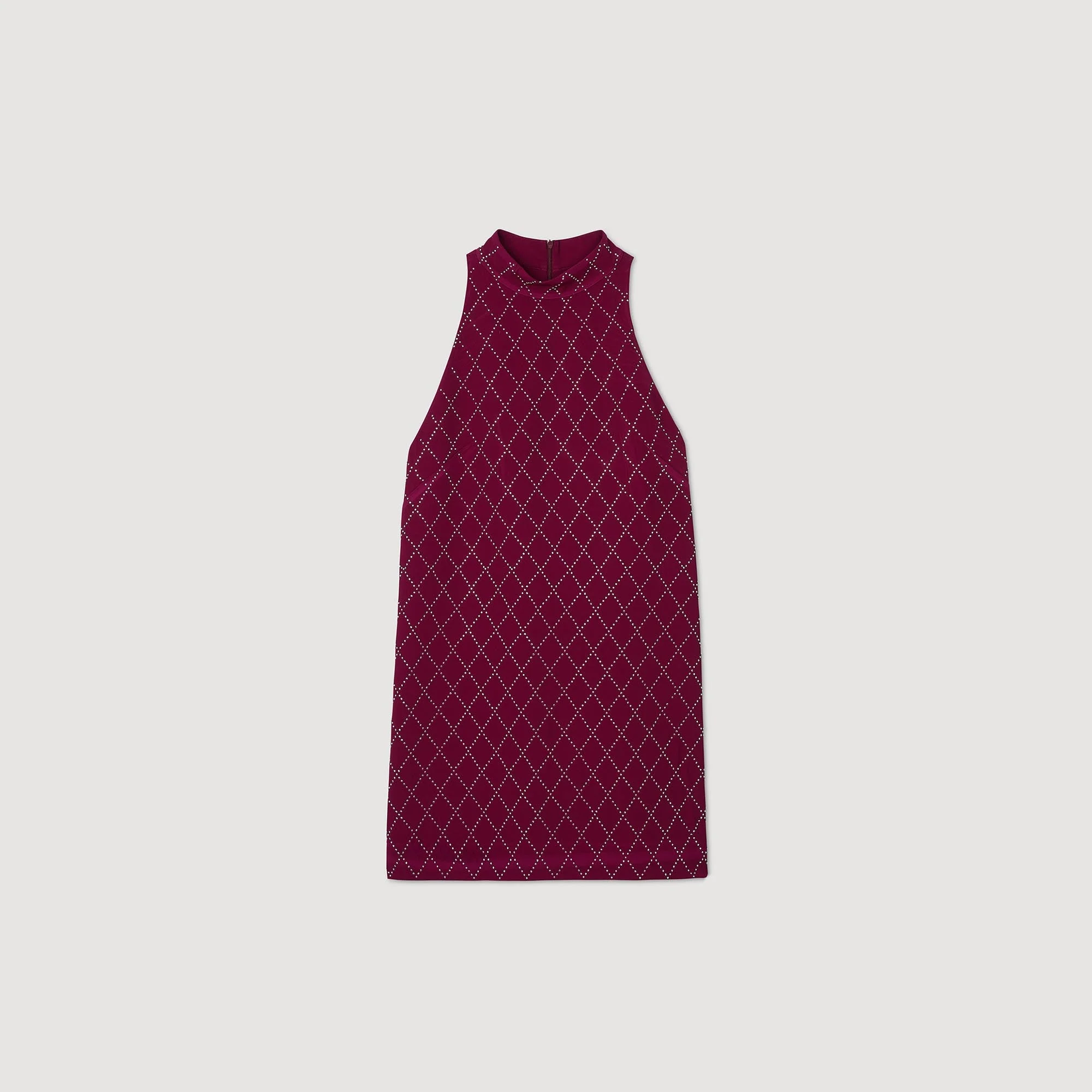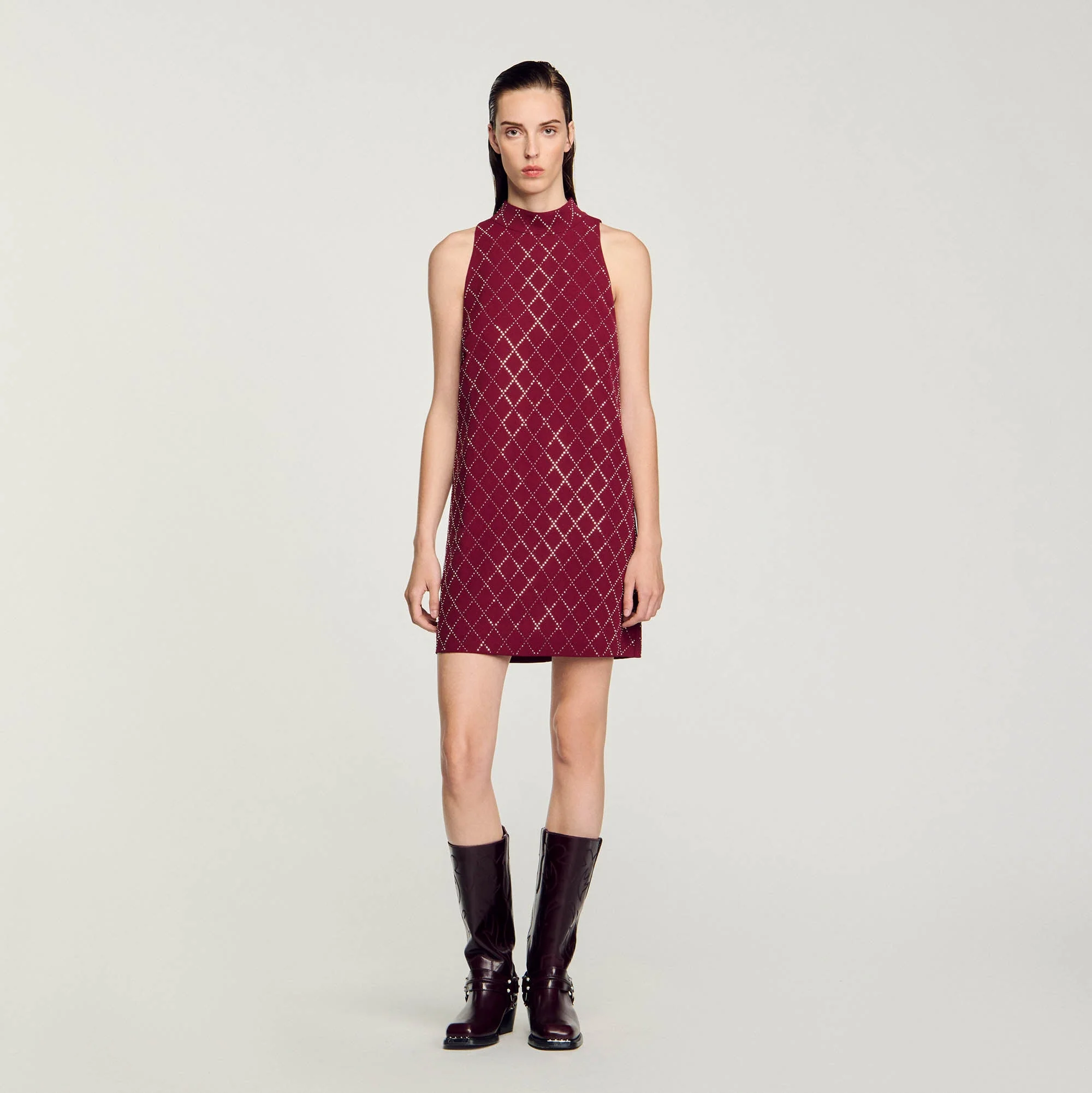Vestido corto sin mangas ligeramente acampanado con cuello alto y pequeñas tachuelas metálicas brillantes all over.