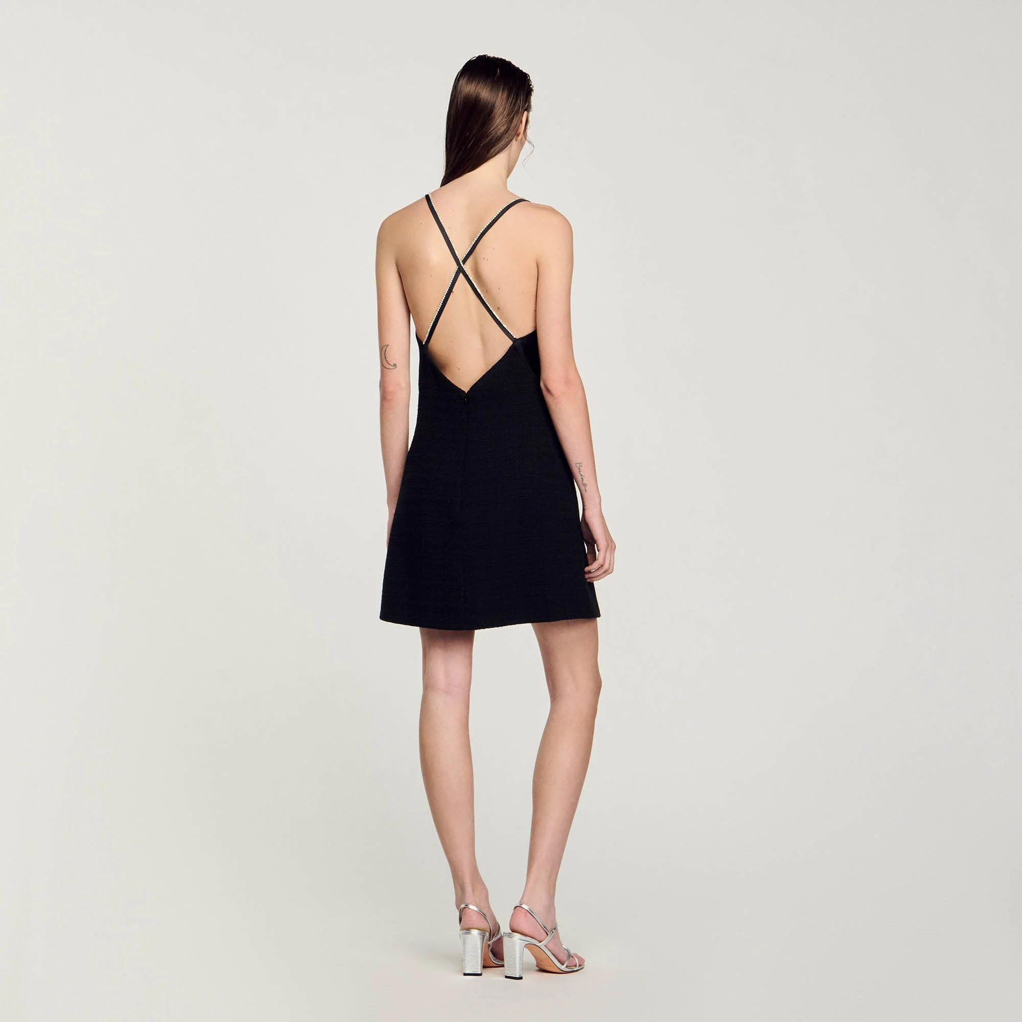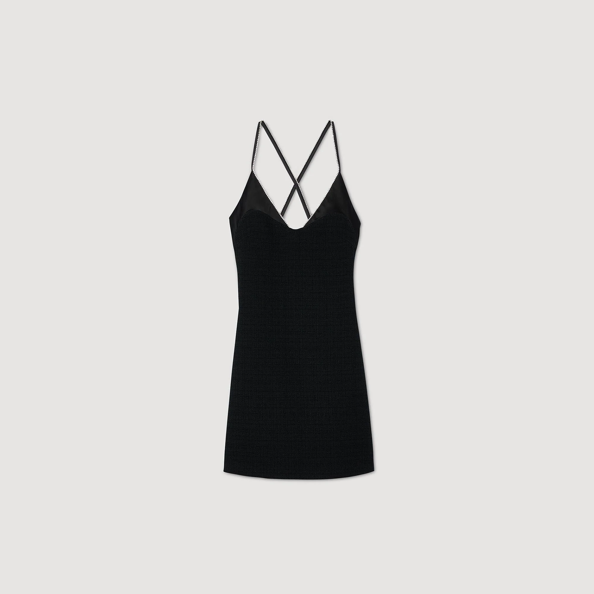 Vestido corto de tweed con escote de pico satinado y tirantes con strass por delante y cruzados en la espalda.