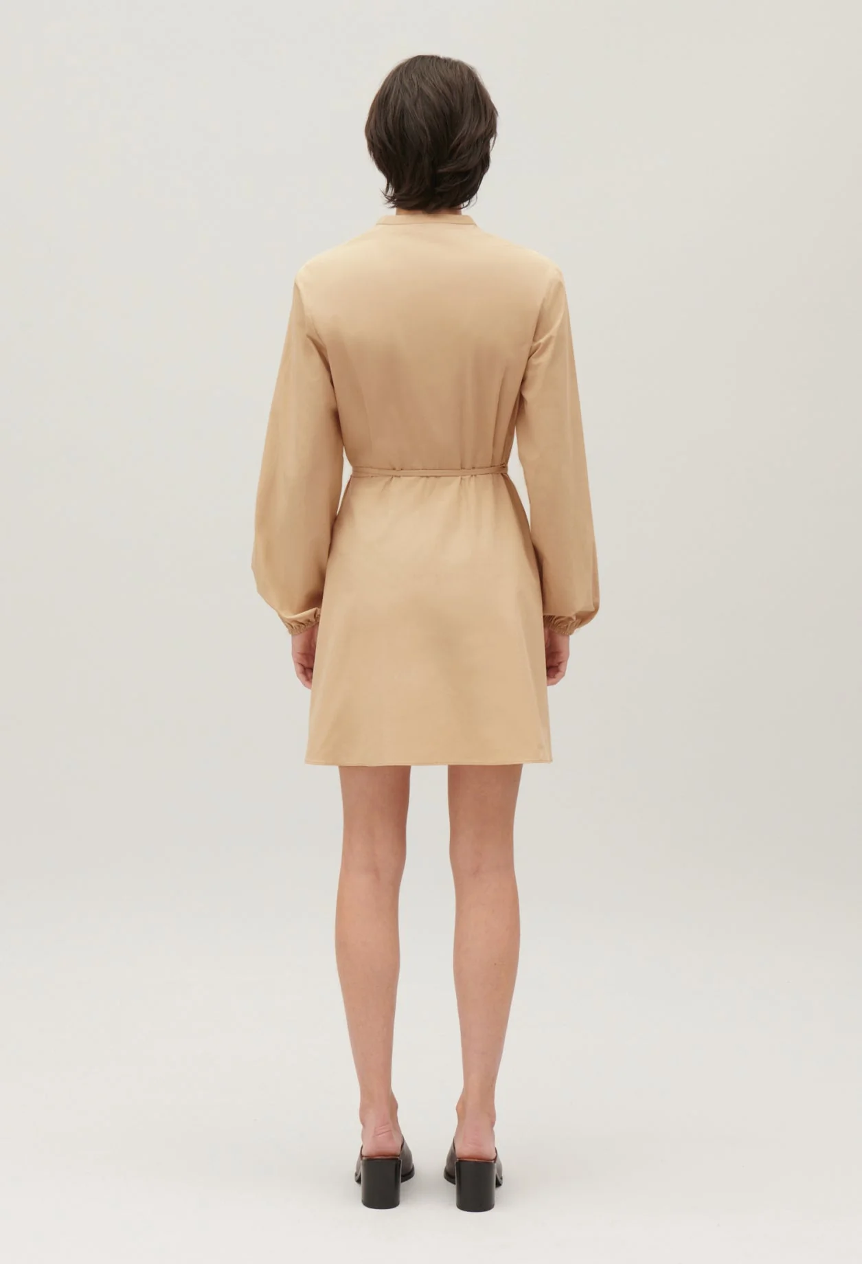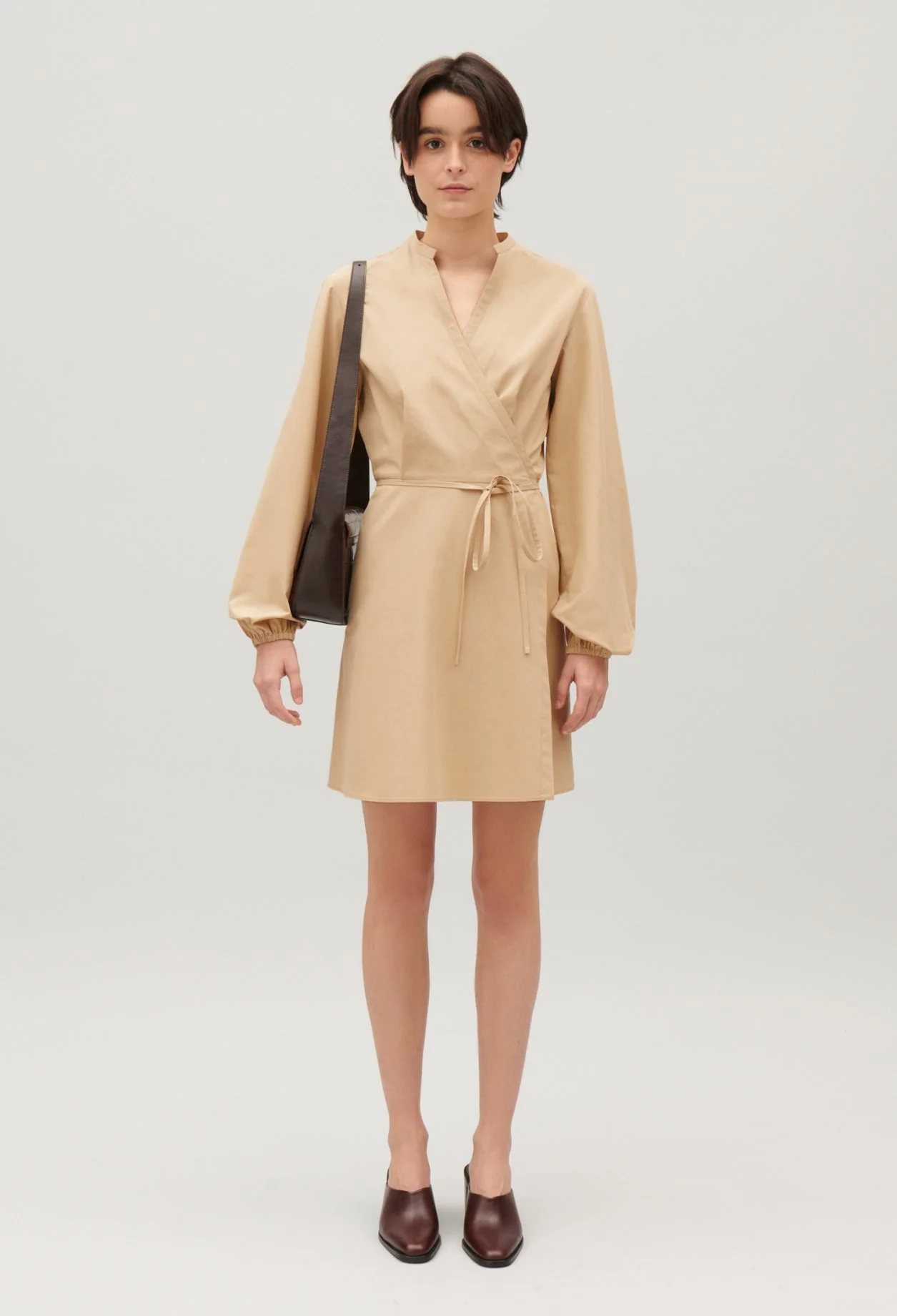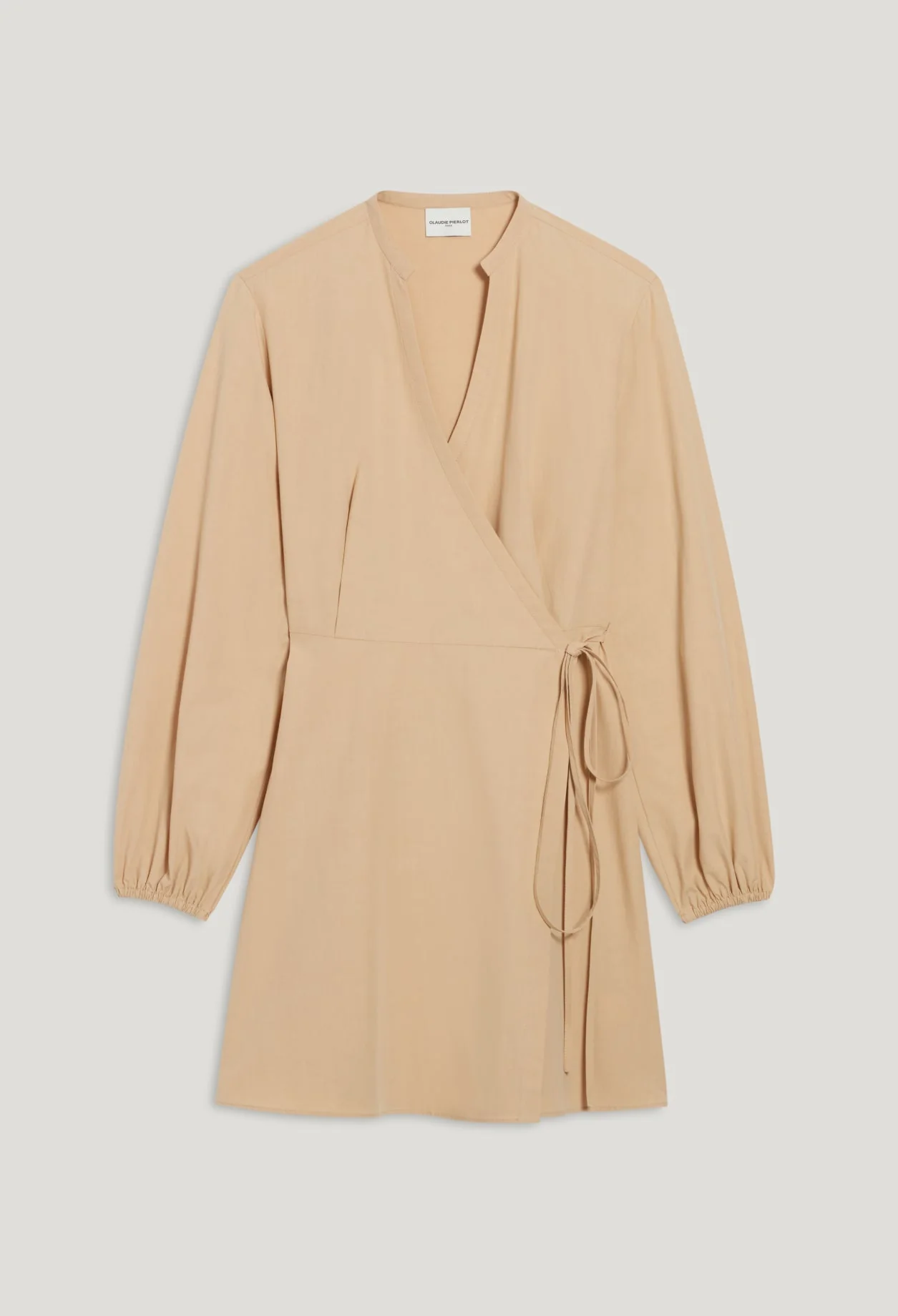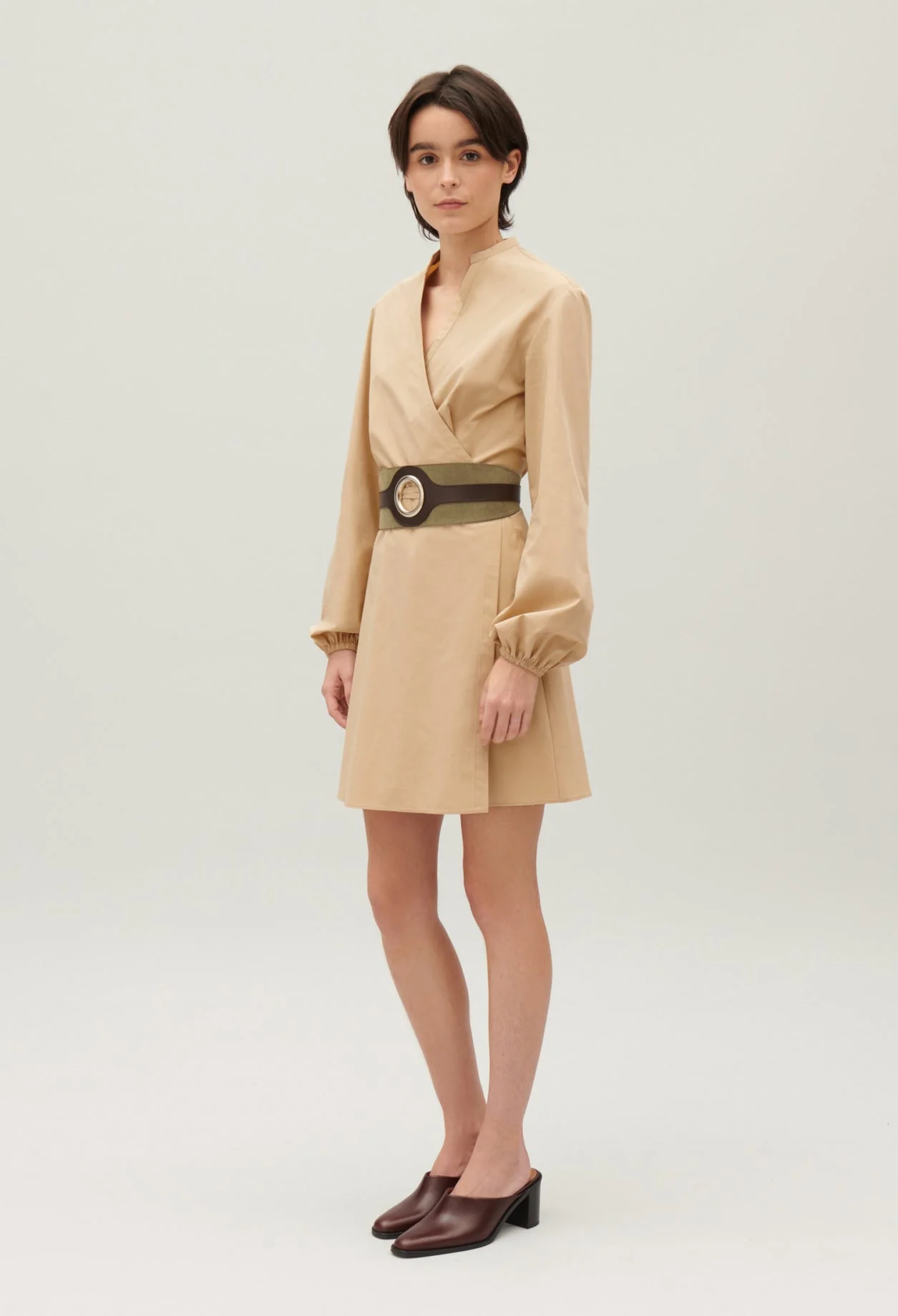 Cuello mao abierto, manga larga ligeramente abullonada con puños elásticos y cierre cruzado con cordón de ajuste