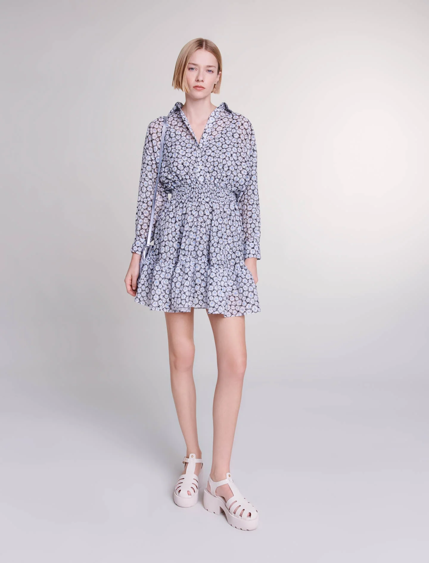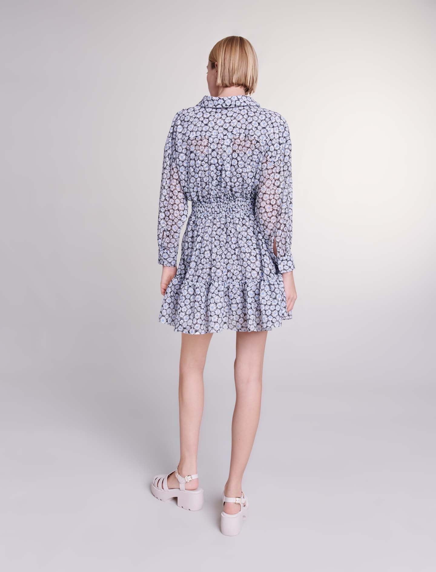 Para la nueva colección, el estudio mezcla materiales ligeros, juegos de contrastes y detalles femeninos para crear siluetas irresistibles.Un viento de ligereza sopla a través de este vestido de camisa corto y semitransparente, decorado con un estampado devoré de margaritas. Con un picardías interior satinado, tono sobre tono y ajustable, revela un cuello de camisa, mangas largas, un cierre y puños abotonados, así como dos bolsillos.Fruncido en la cintura, su falda acampanada crea una silueta con vuelo y perfectamente entallada.Ref.: MFPRO03474