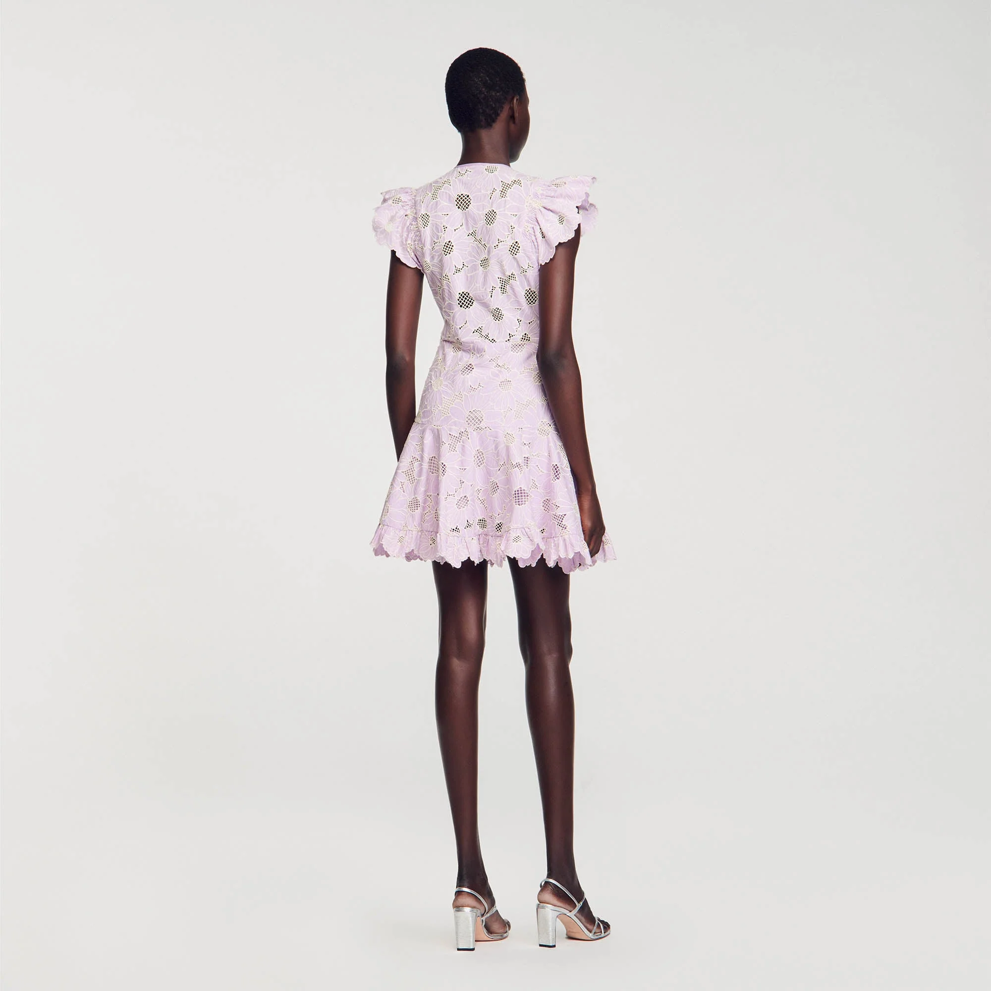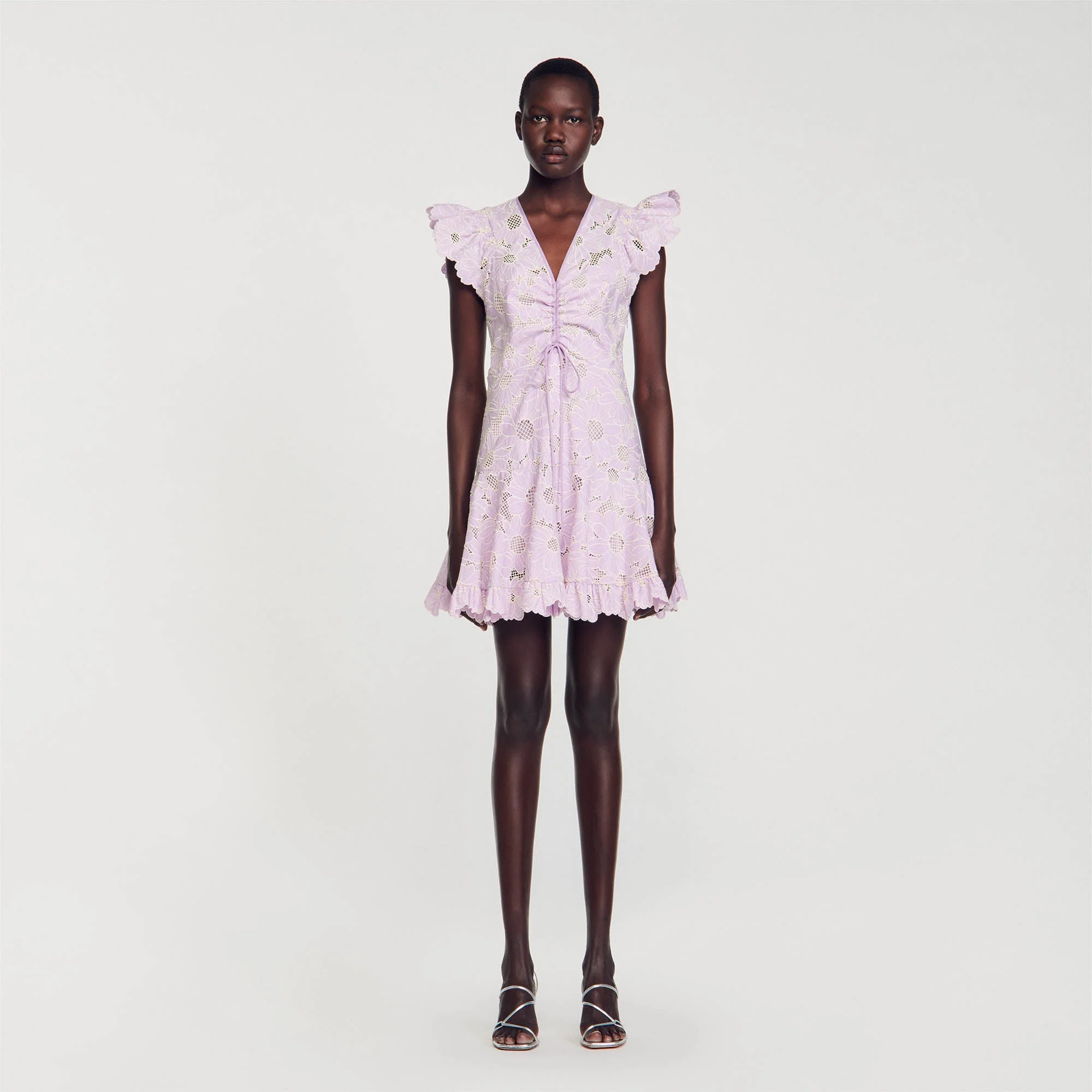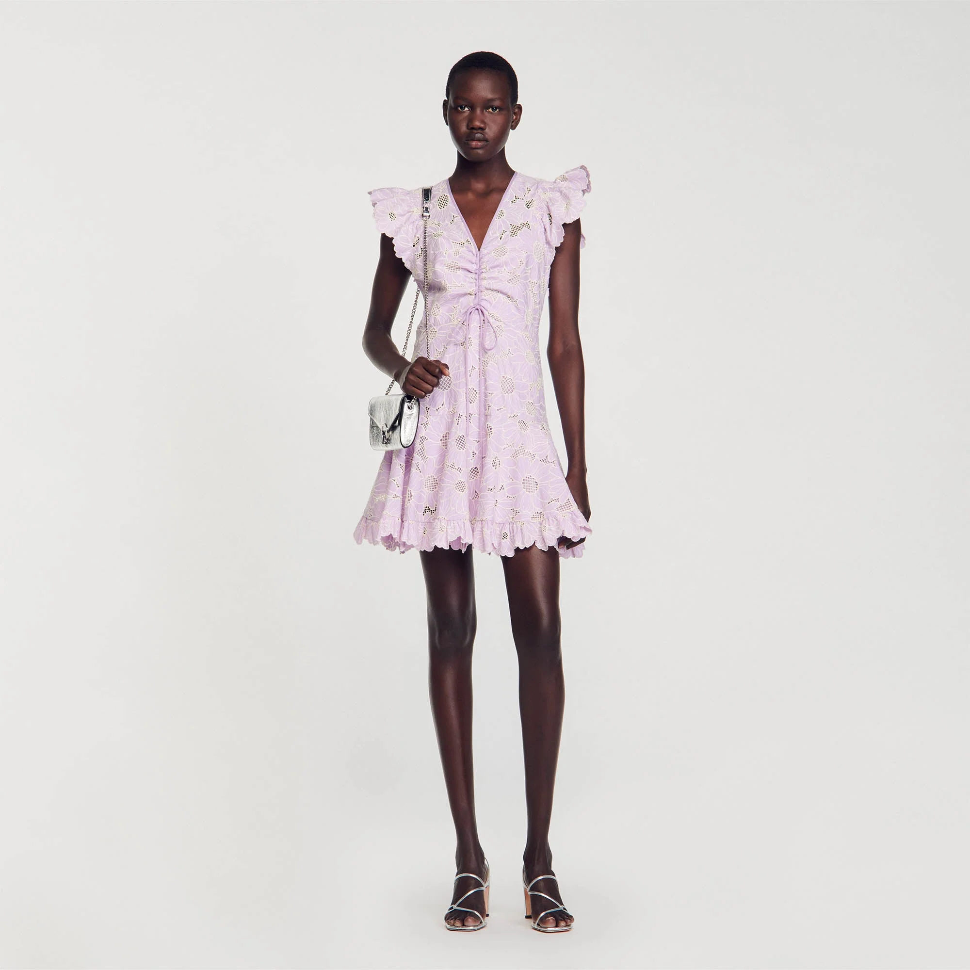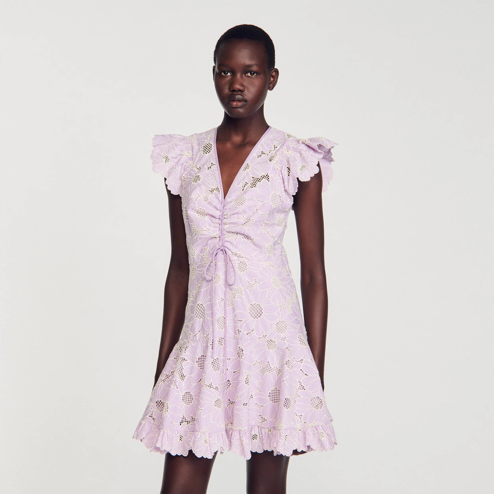 Vestido corto de guipur con margaritas, cuello de pico con cintas ajustables, manga corta y bajo acampanado y festoneado con volantes.