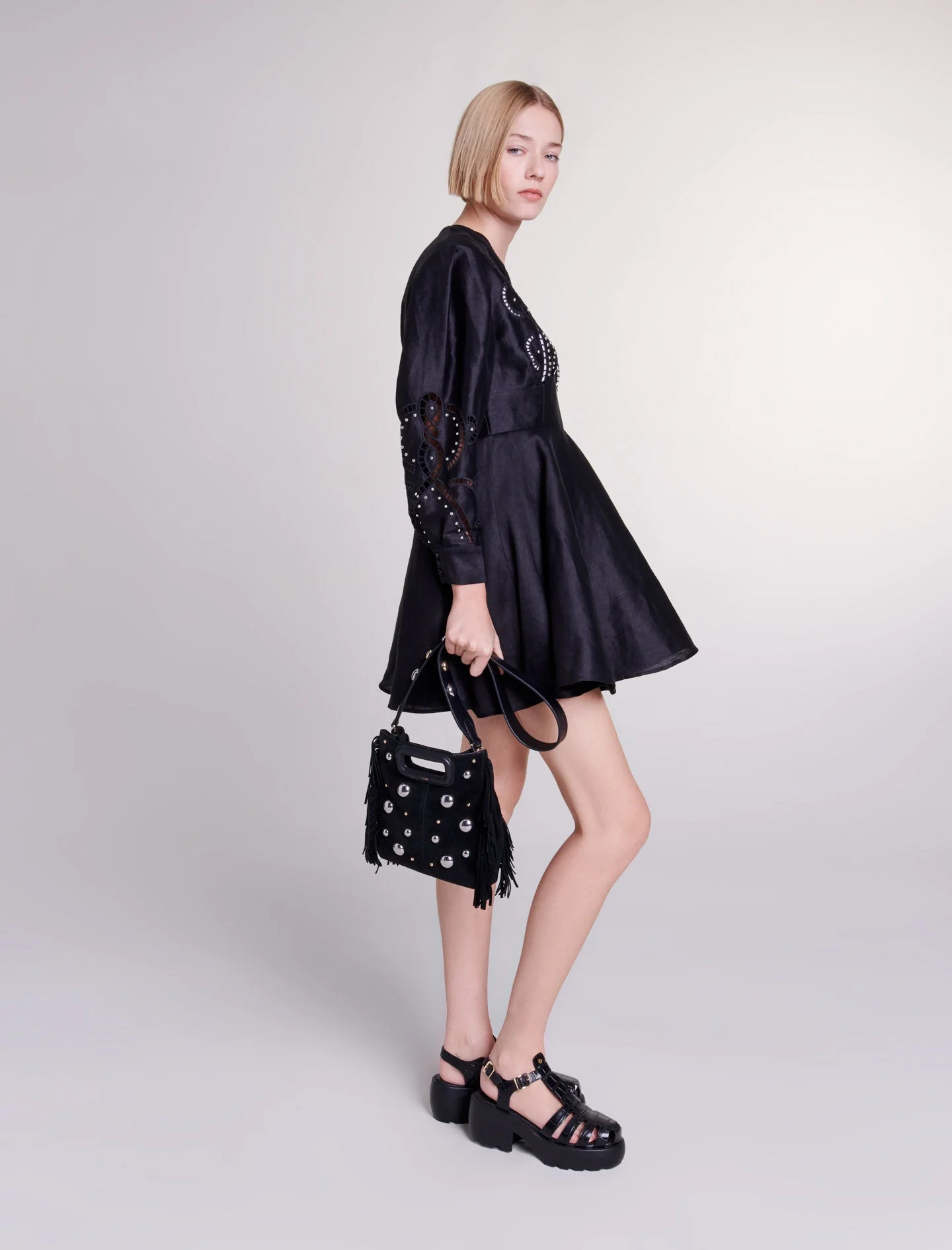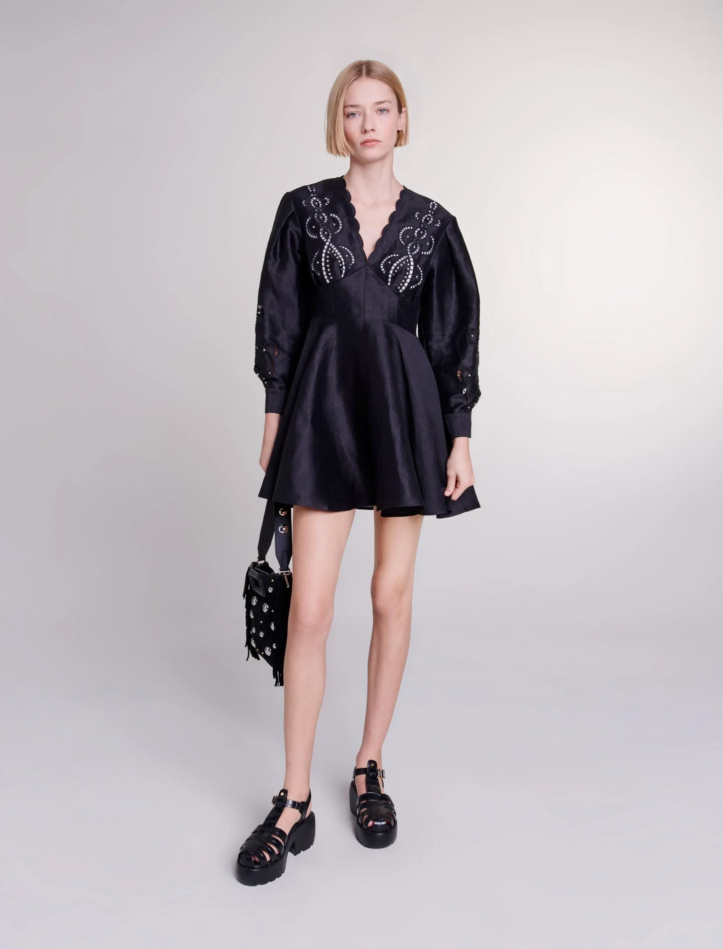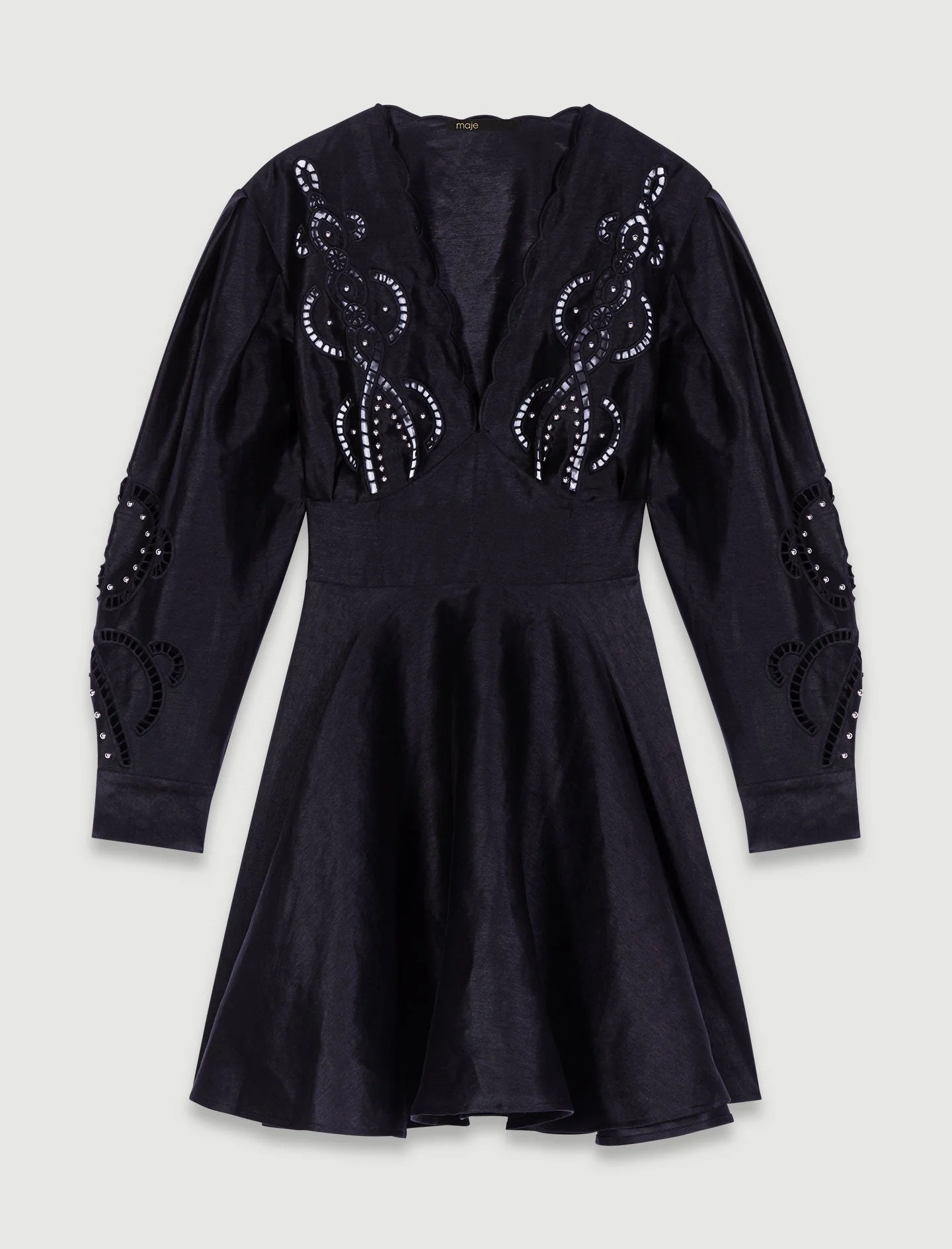 La nueva colección Maje celebra la elegancia atemporal a través de prendas icónicas, combinando materiales ligeros y detalles femeninos para crear un vestuario esencial.Este vestido corto de lino, impregnado de elegancia y ligereza, ofrece un juego de volúmenes. Está dotado de manga larga y puños abotonados, y luce un escote en pico ondulado y una falda acampanada con volantes. Esta prenda, ligeramente entallada en la cintura y fruncida en la espalda, resulta atractiva por sus bordados calados y aderezados con ribetes plateados, el detalle atrevido para darle el toque final a un estilo elegante.Ref.: MFPRO03330