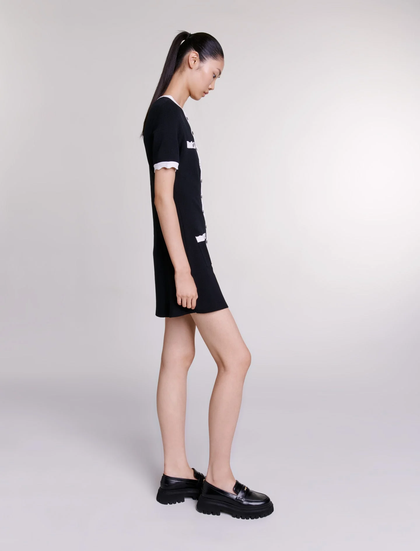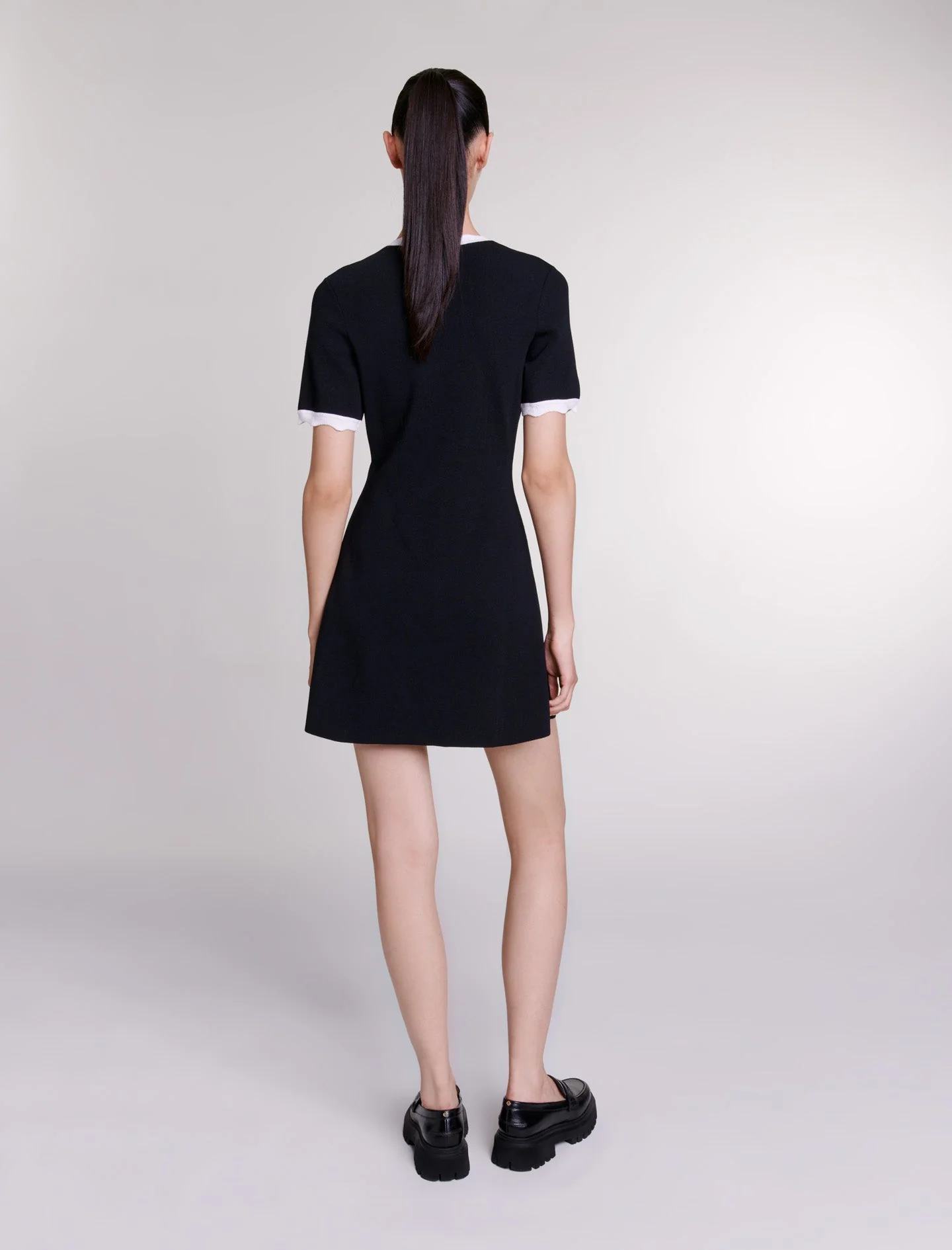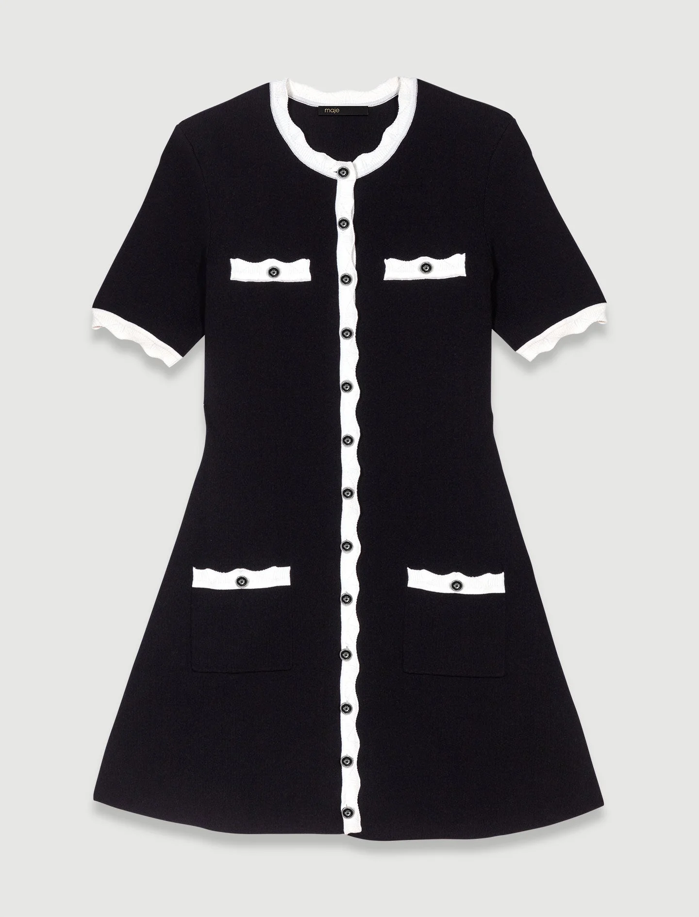 Descubra nuestra nueva colección, una atrevida reinterpretación del armario de Maje. Con su juego de materiales y sus detalles trabajados, estas piezas icónicas se transforman para dar una vuelta de tuerca a sus conjuntos.De punto bloqueado, este vestido corto y ligeramente acampanado encarna la elegancia intemporal y presenta una silueta estructurada.Con un cuello redondo y mangas cortas, revela un cierre, dos bolsillos de parche y dos falsos bolsillos en el pecho decorados con botones del trébol. Ofreciendo un sutil juego de contrastes, sus bordes están acentuados con ribetes dentados y festoneados de punto.Ref.: MFPRO03412