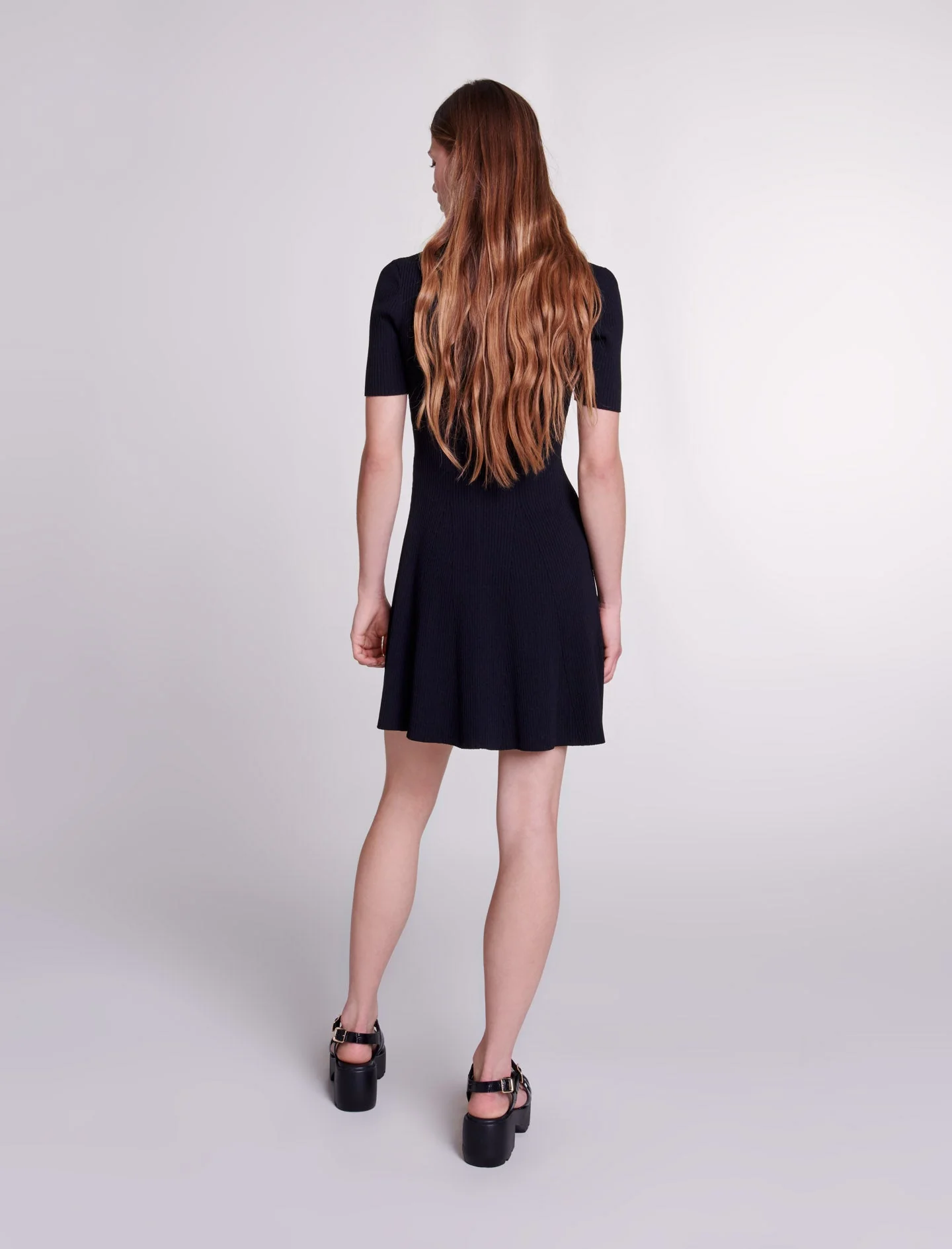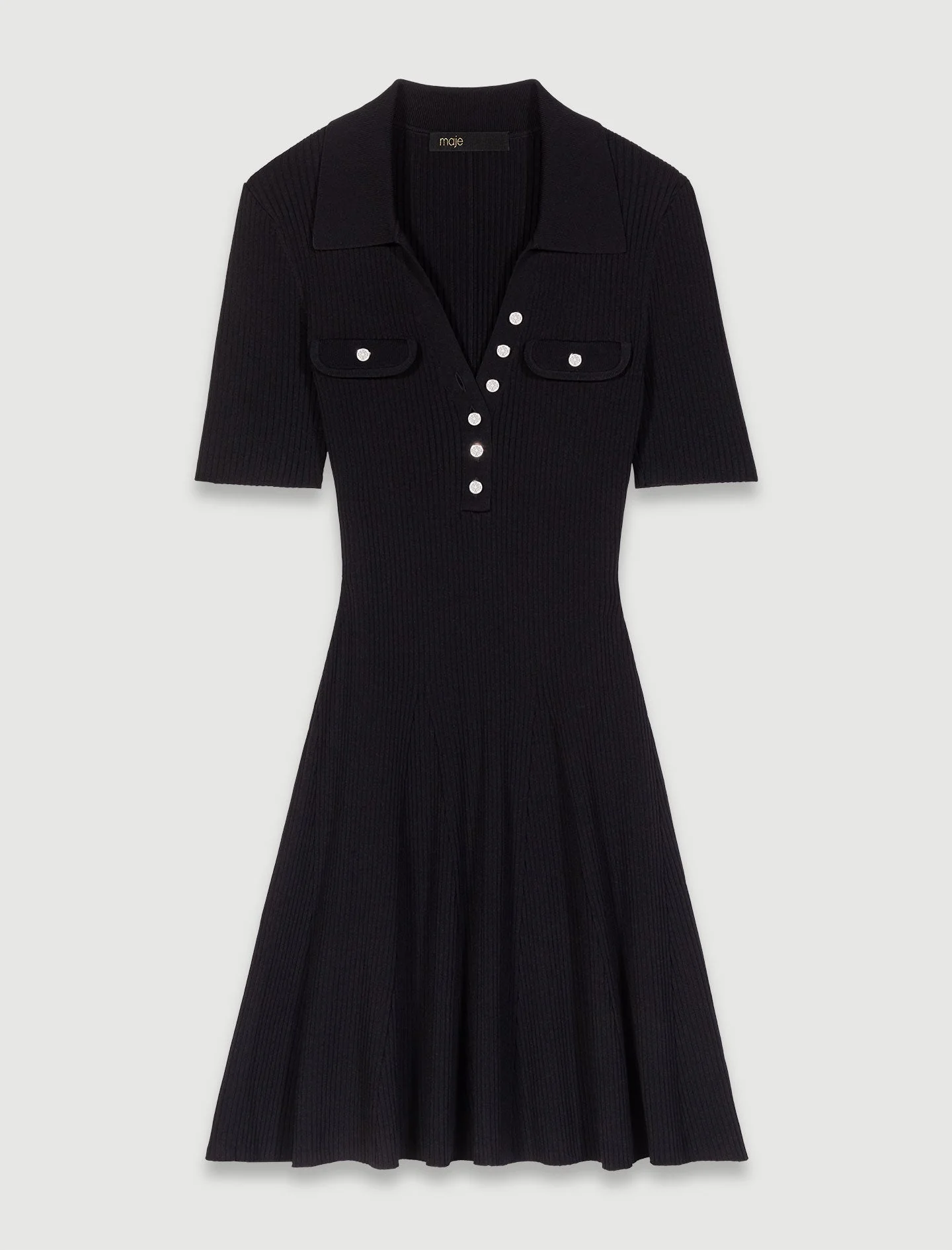 La nueva colección Maje celebra la elegancia atemporal a través de prendas icónicas, combinando materiales ligeros y detalles femeninos para crear un vestuario esencial.Un punto suave y de canalé para este vestido corto y ajustado. Con manga corta, cuello camisero abierto y dos bolsillos con solapas y botones. Su falda acampanada estructura la silueta con elegancia.Ref.: MFPRO03436