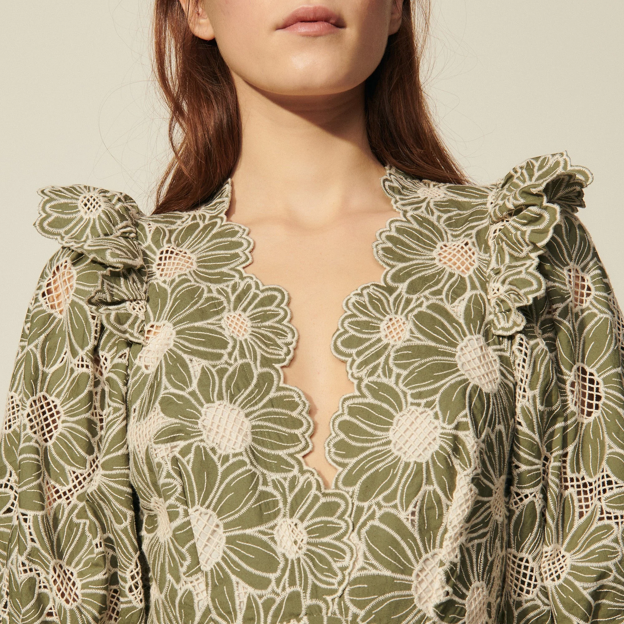 • Escote en V con acabado festoneado