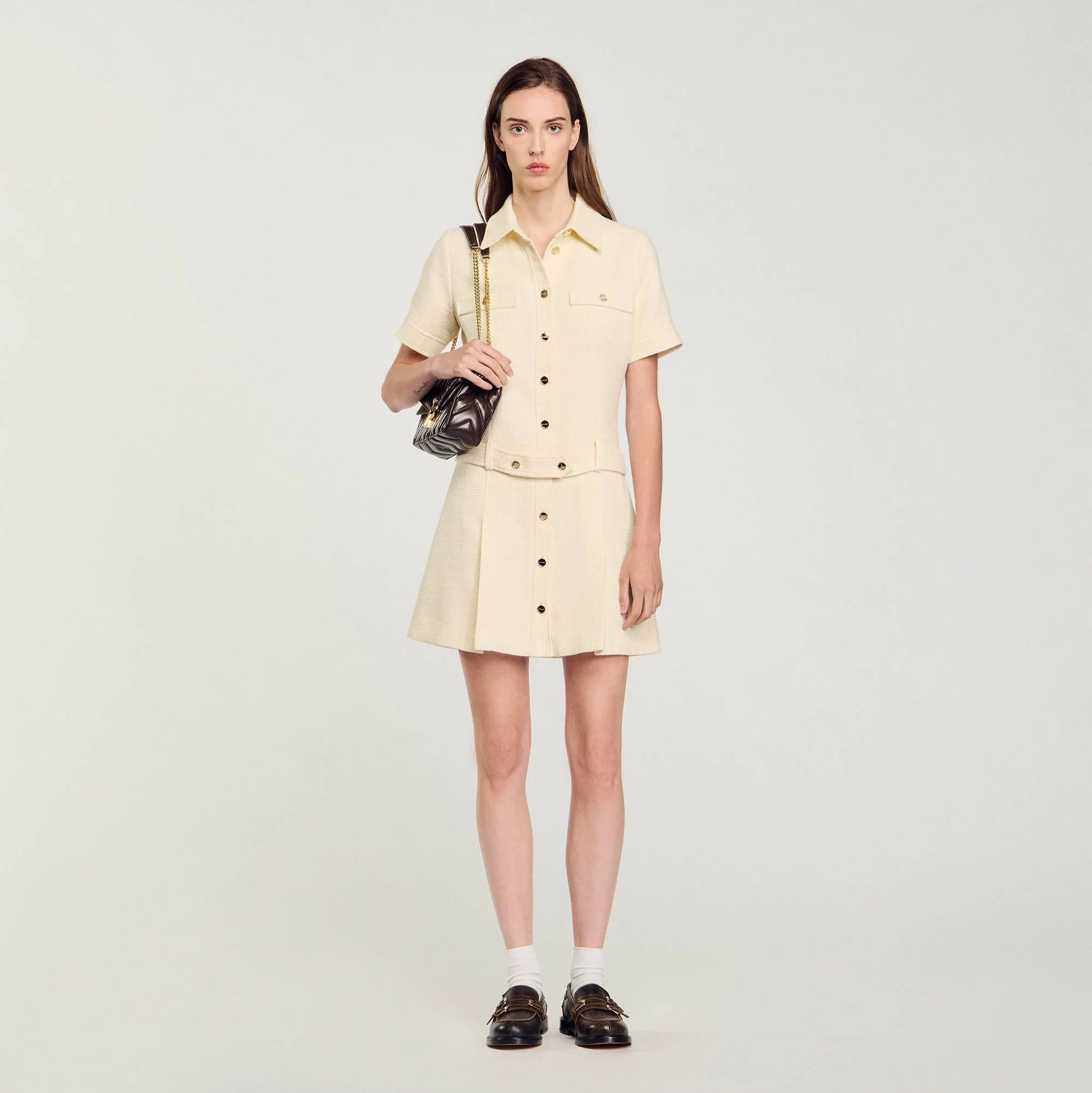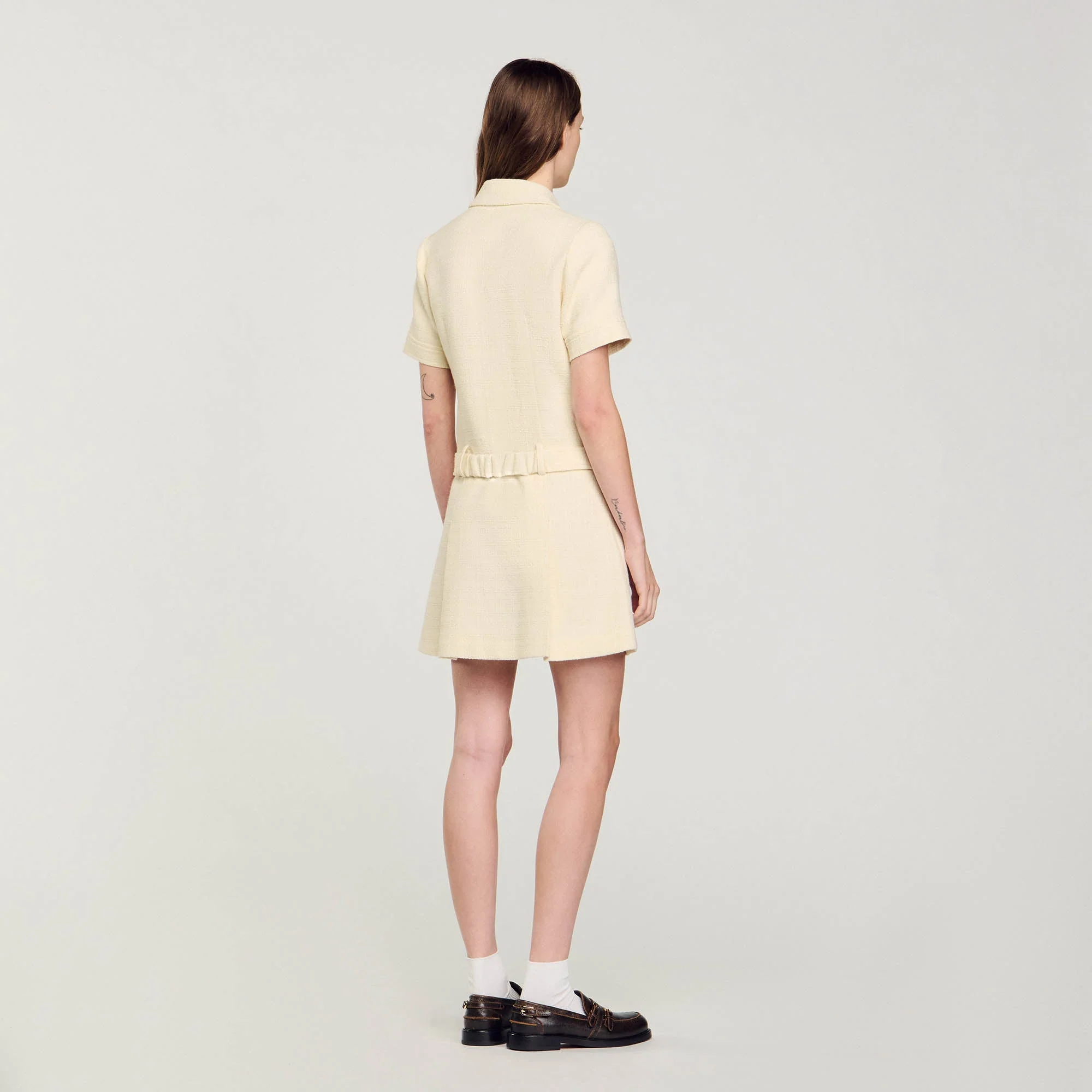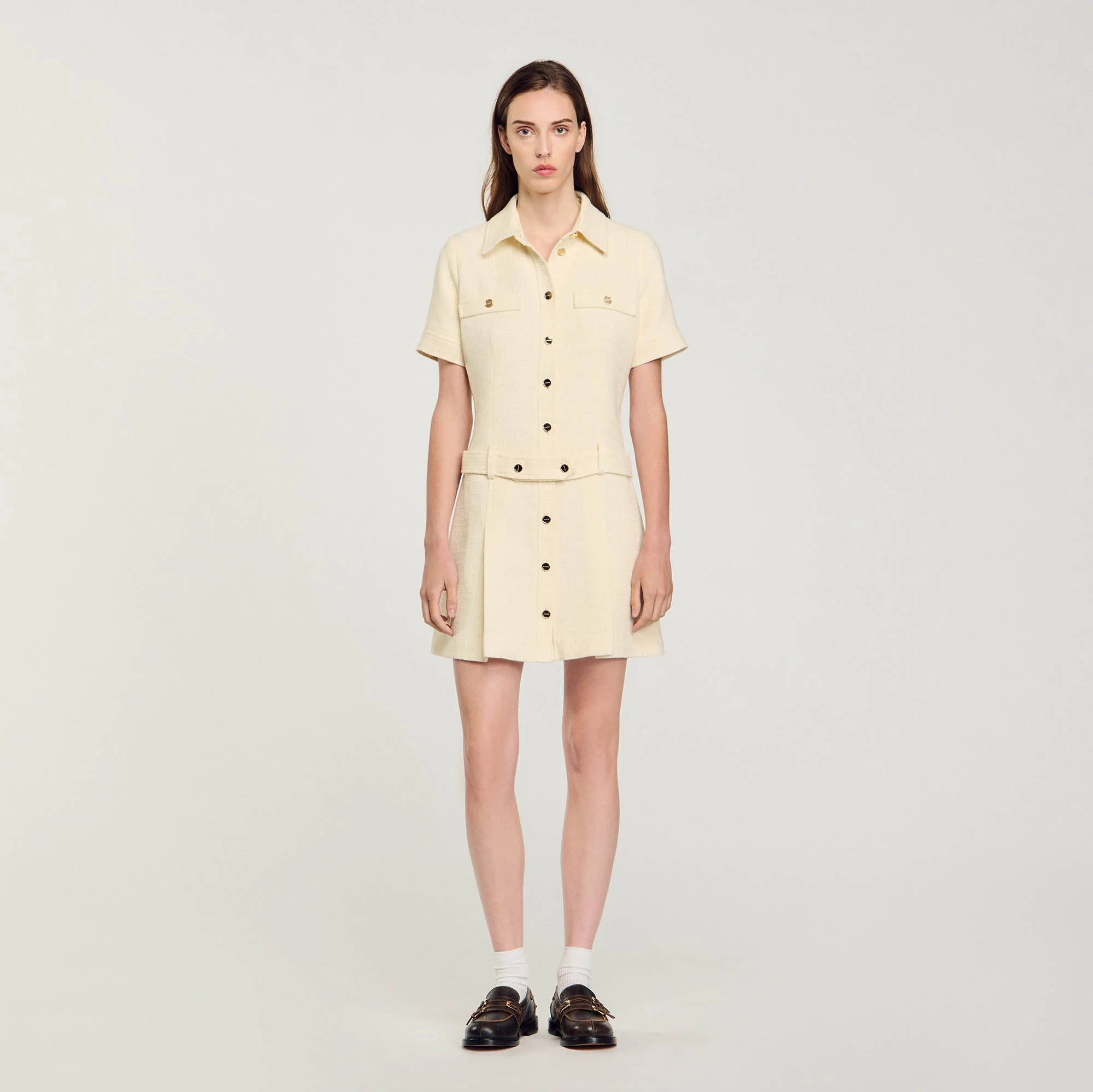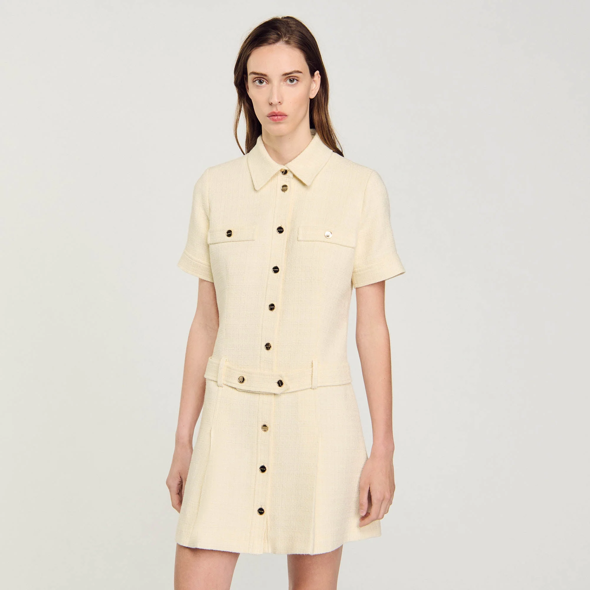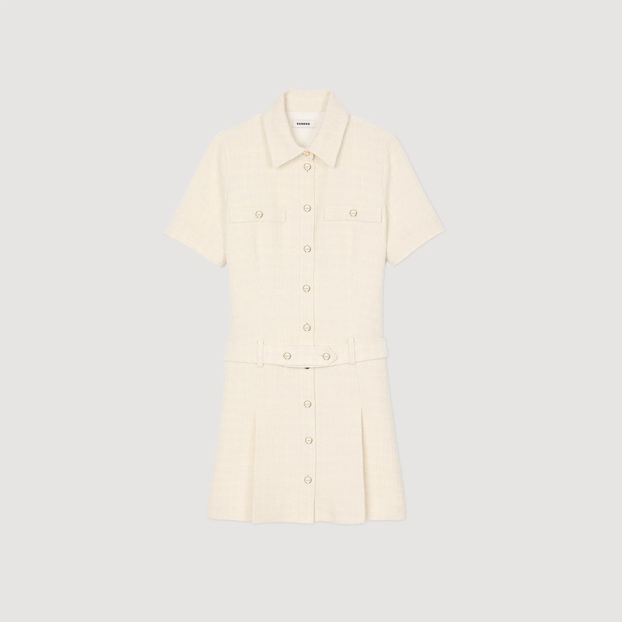 Vestido corto de tweed con manga corta, cuello de camisa, cierre de botones SANDRO, falda con pinzas y cinturón elástico desmontable.