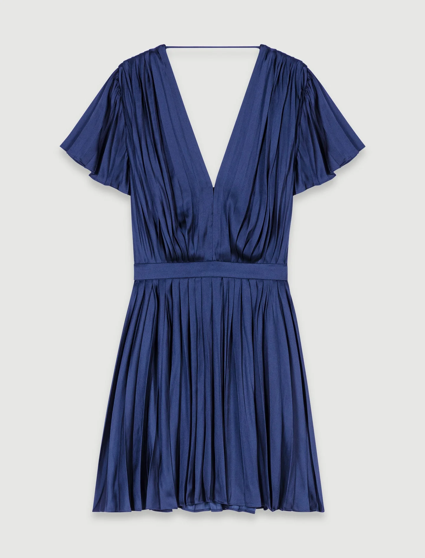 Este vestido corto, delicadamente plisado y satinado, aporta elegancia y ligereza al look. Cuenta con manga corta, escote de pico con corchete para ajustarlo a su gusto y falda ligeramente acampanada.