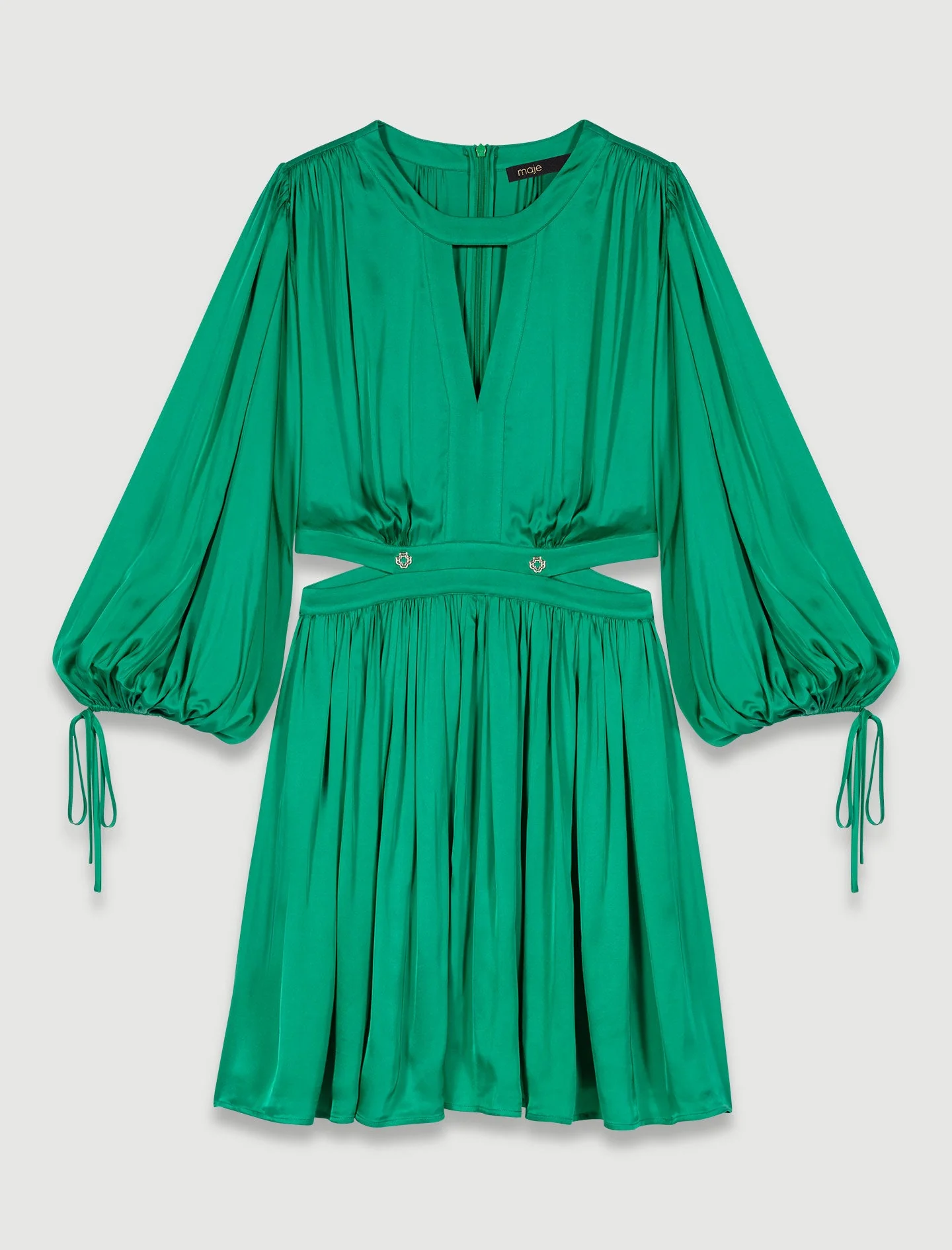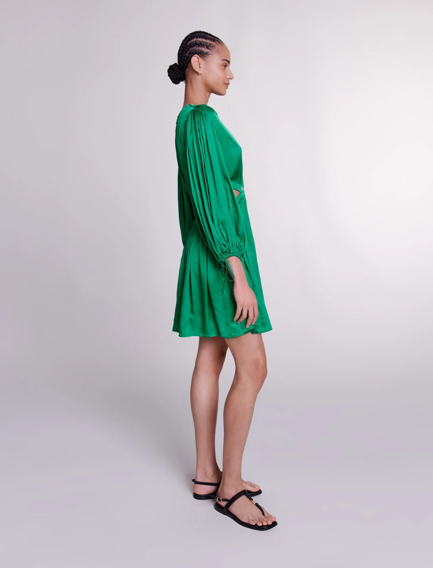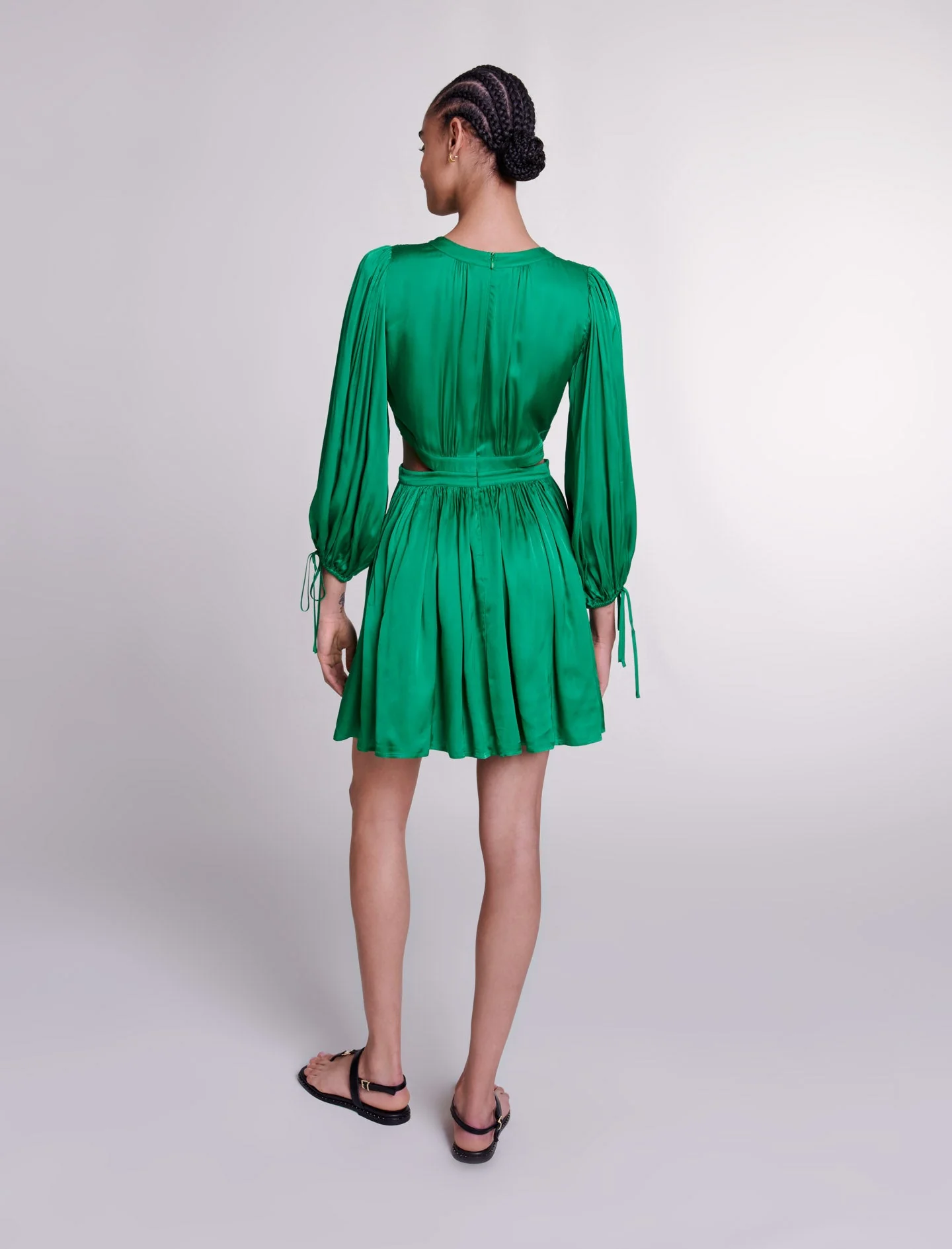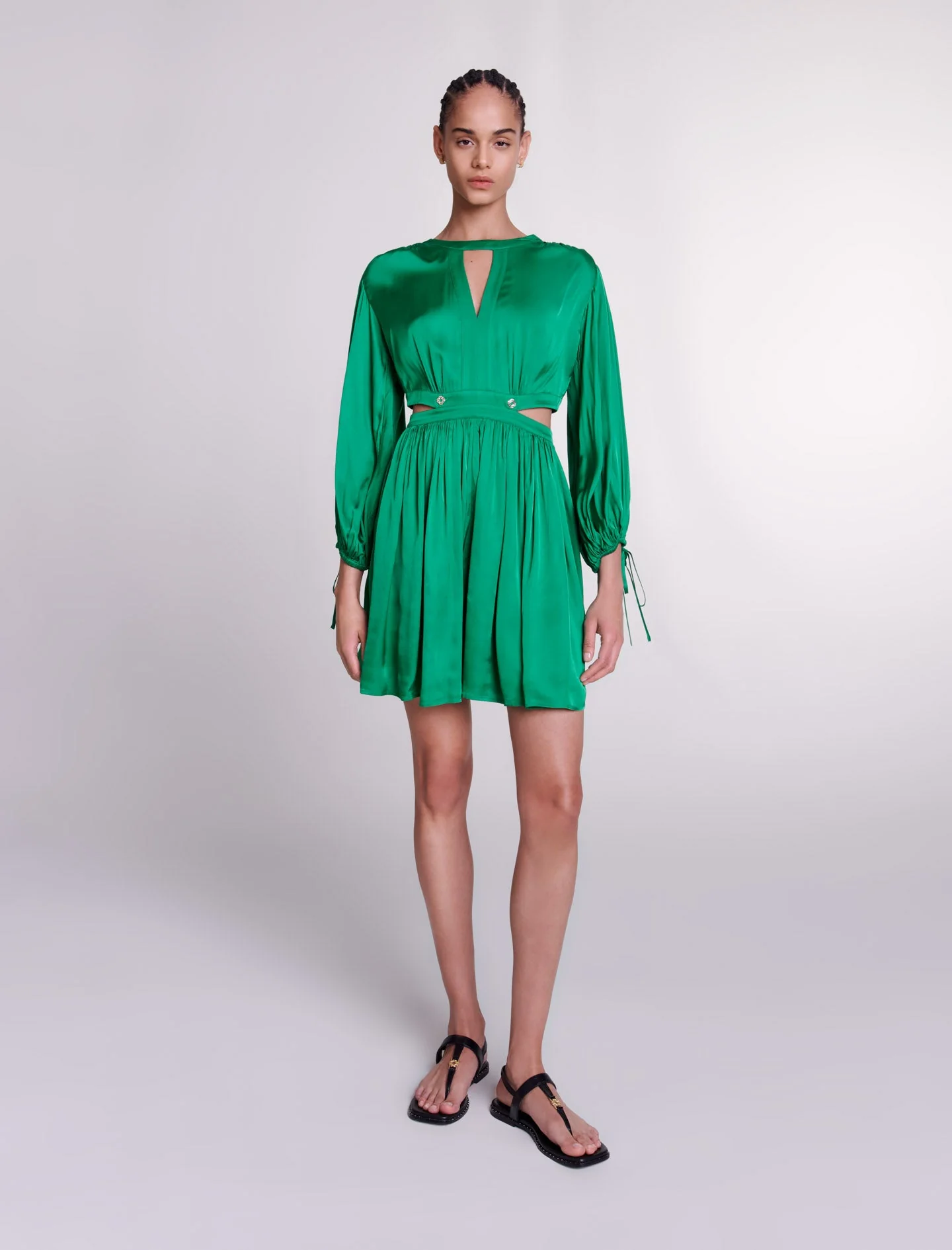 El estudio Maje celebra un vestuario de prendas atemporales con cortes atrevidos y detalles femeninos para realzar sus siluetas, de día y de noche.Este vestido satinado corto y recto, aderezado con el color estrella de la temporada, ofrece una silueta llena de estilo, ligera y vaporosa.Dotado de un cierre de cremallera en la espalda y de manga larga con puños ajustados con lazos, luce una parte de arriba con efecto fruncido y una falda plisada y voluminosa. Decorado con pequeños remaches Clover en el cuello y la cintura, sus cortes a los lados y su cuello redondo con canesú en V calados revelan sutilmente la piel.Ref.: MFPRO03626
