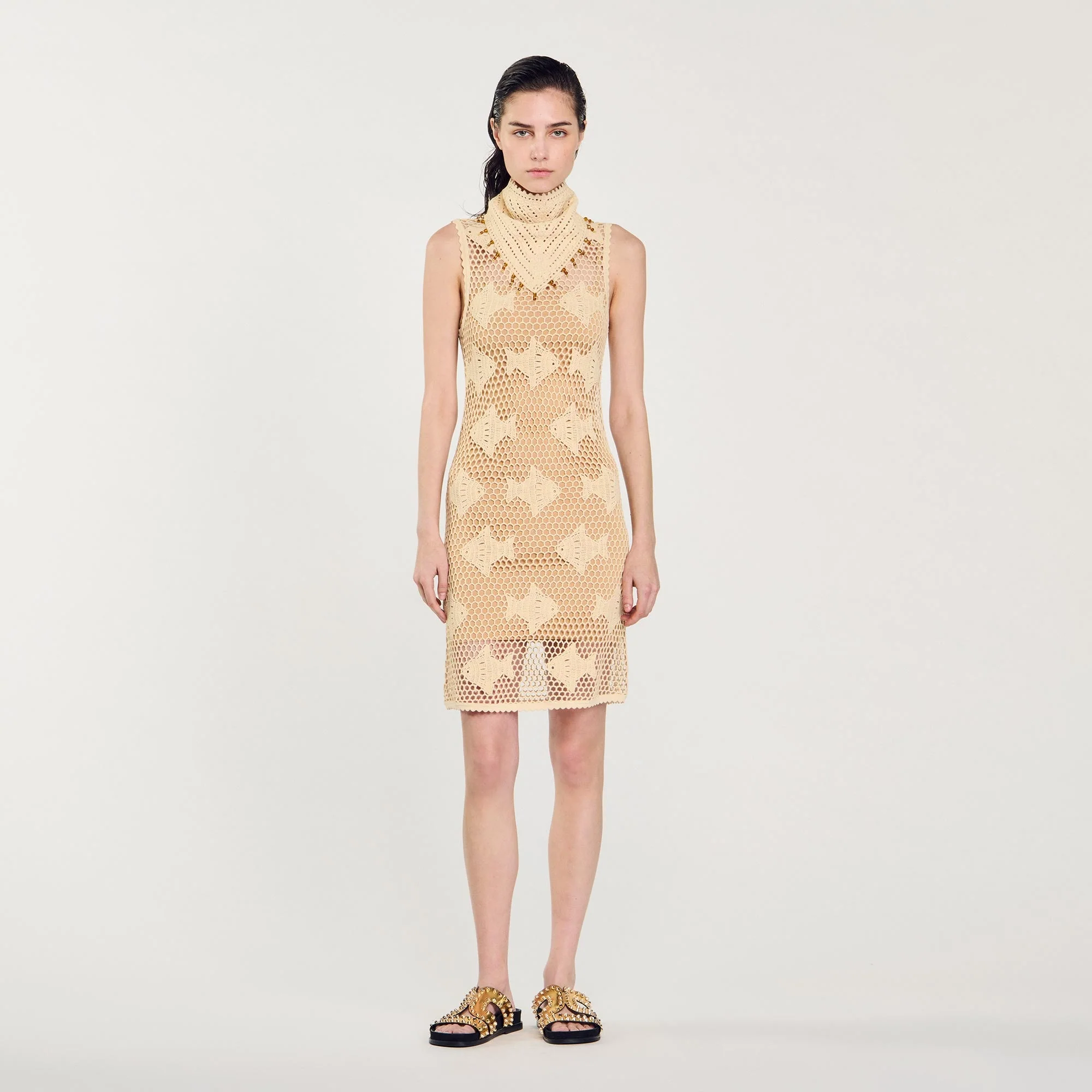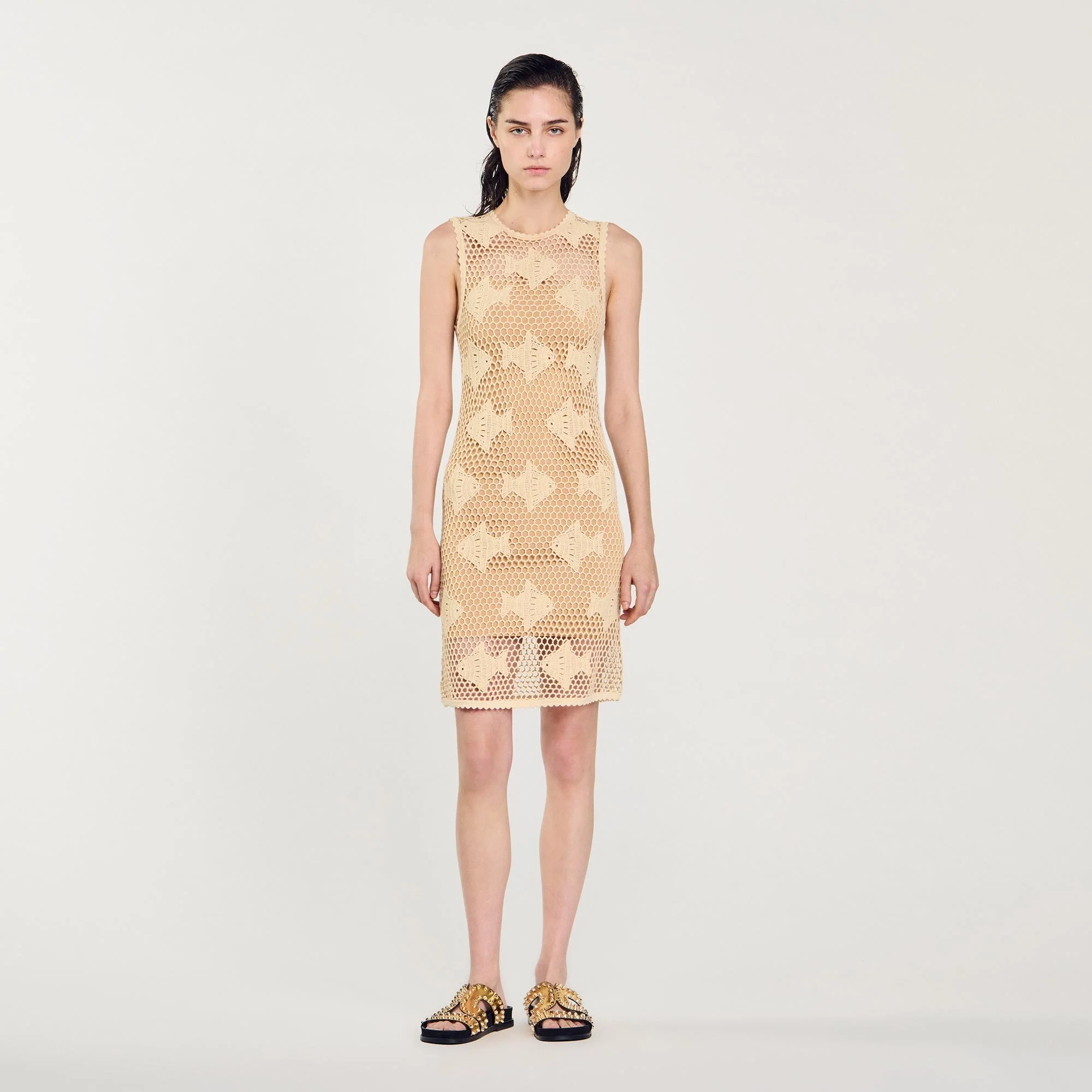 Vestido corto sin mangas de punto bordado con efecto de ganchillo con motivo de peces, cuello redondo y un forro con tirantes finos.