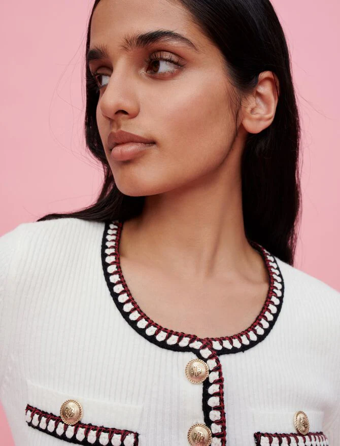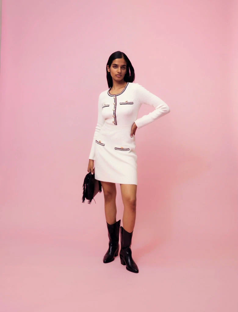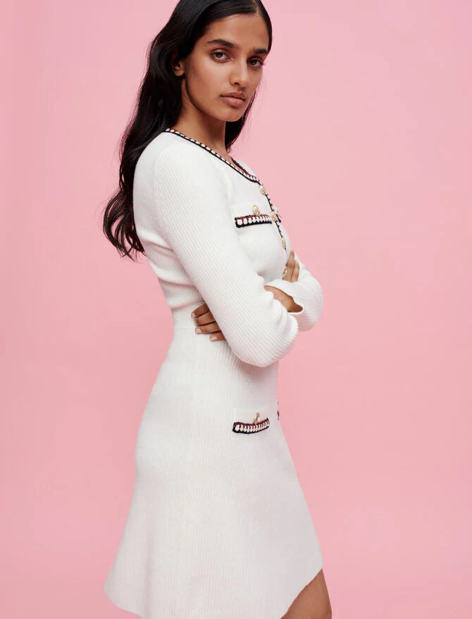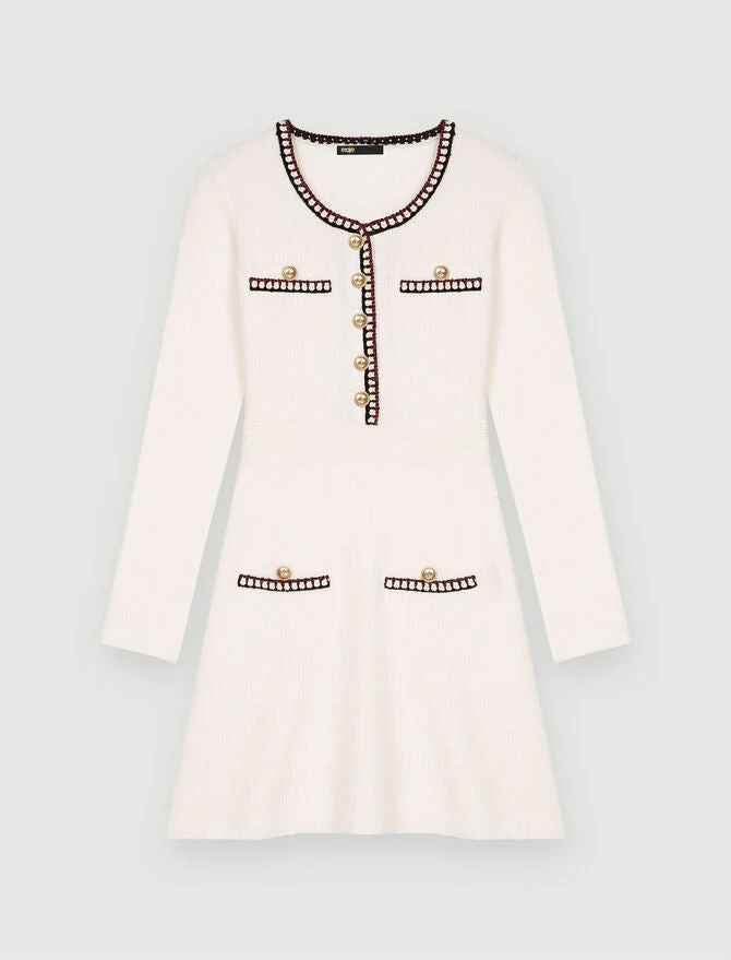 Vestido corto ceñido, entallado y ligeramente acampanado en la parte inferior. De punto de canalé. Mangas largas y ajustadas. Cuello redondo. Botones metálicos con Clover de Maje. Galones de fantasía trenzados en contraste. Banda en la cinturilla. Abertura en la parte superior. Bolsillos ribeteados en la parte delantera. Ideal para el día en la oficina.Ref.: MFPRO02705