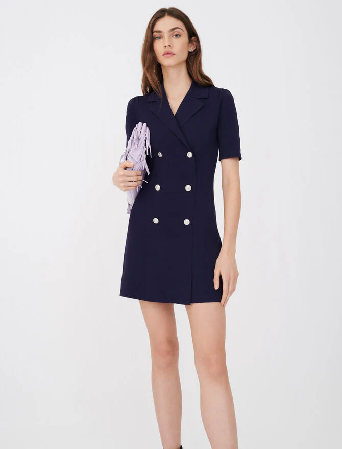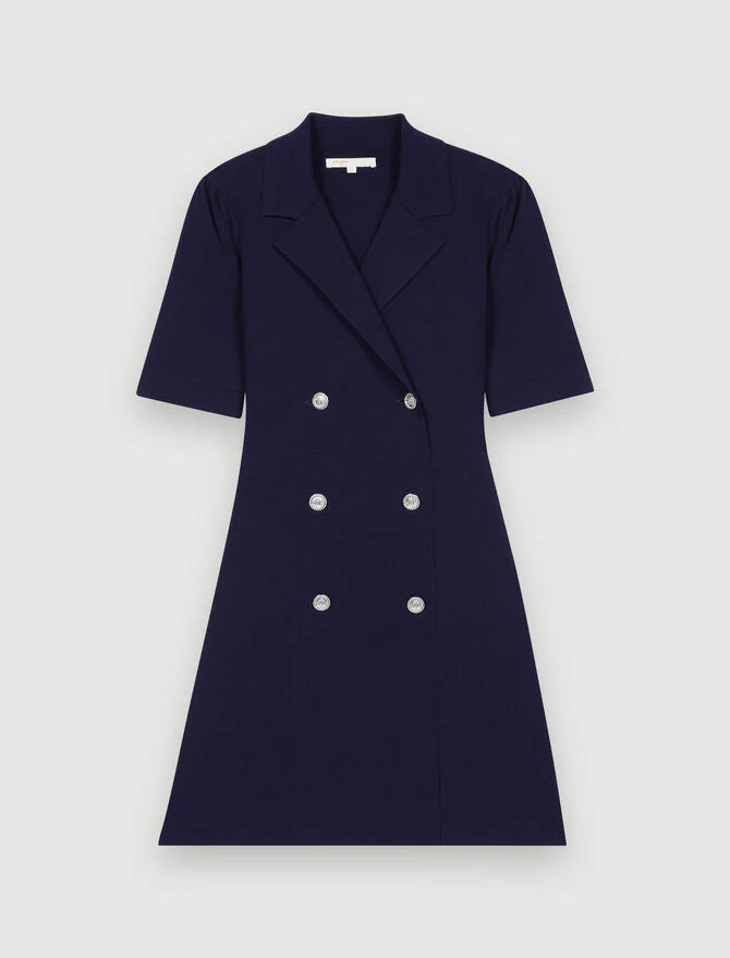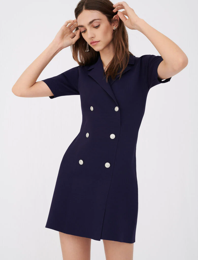 Vestido corto y recto de punto en bloque, ajustado a la cintura. Mangas cortas y rectas. Cuello estilo blazer. Doble botonadura en la parte central delantera del vestido, estilo blazer. 6 botones metálicos dorados. Un botón fantasía dorado en cada puño. Vestido sin cierre.