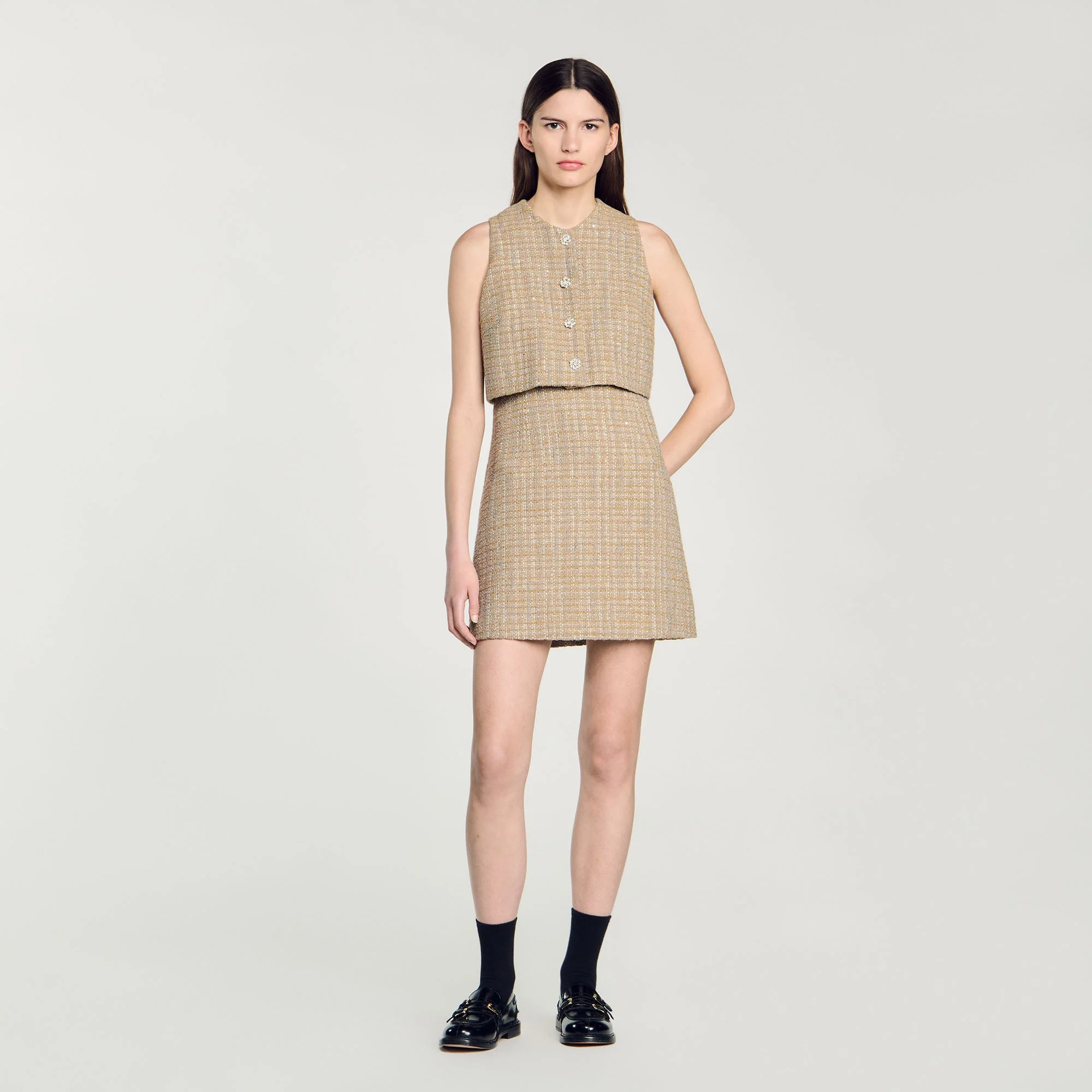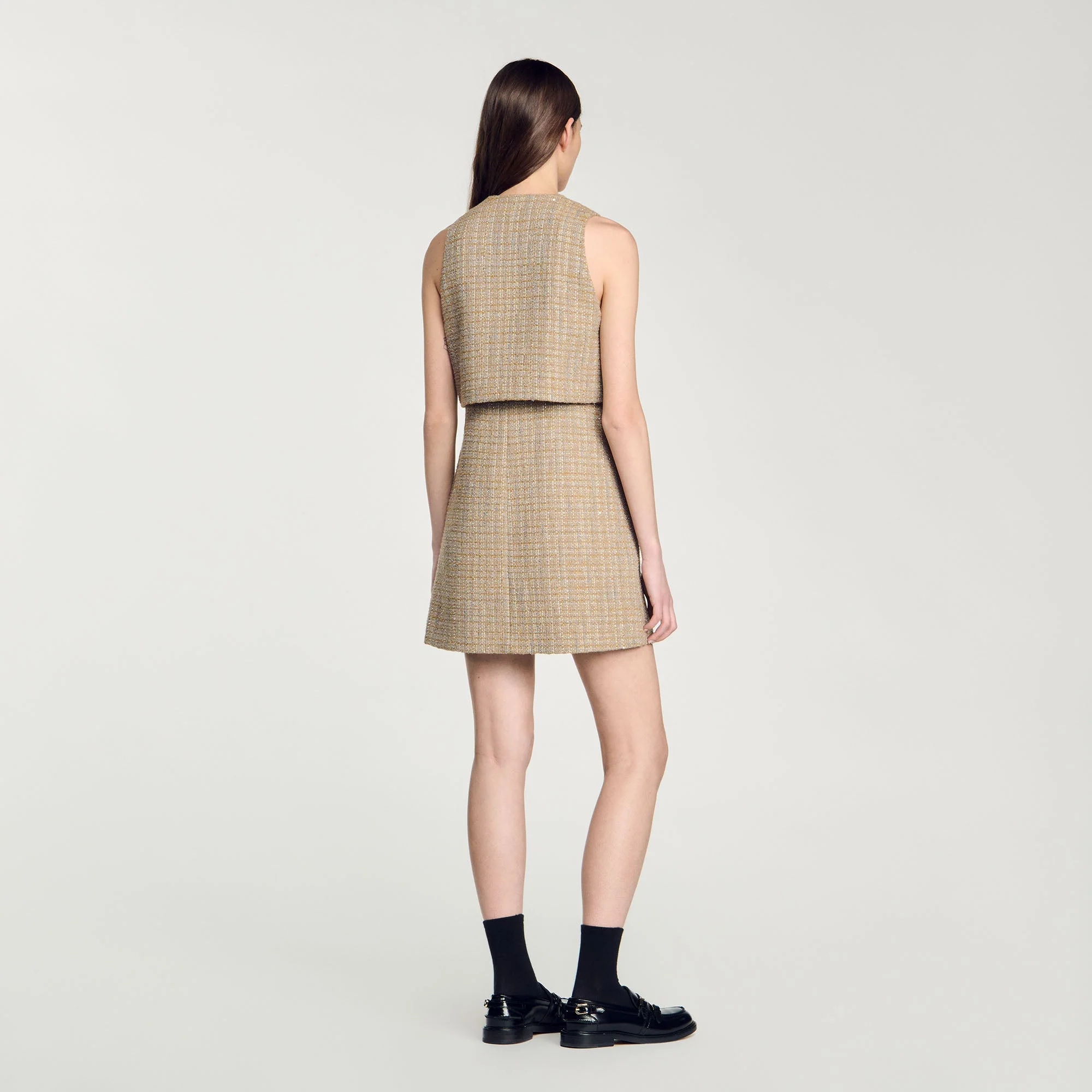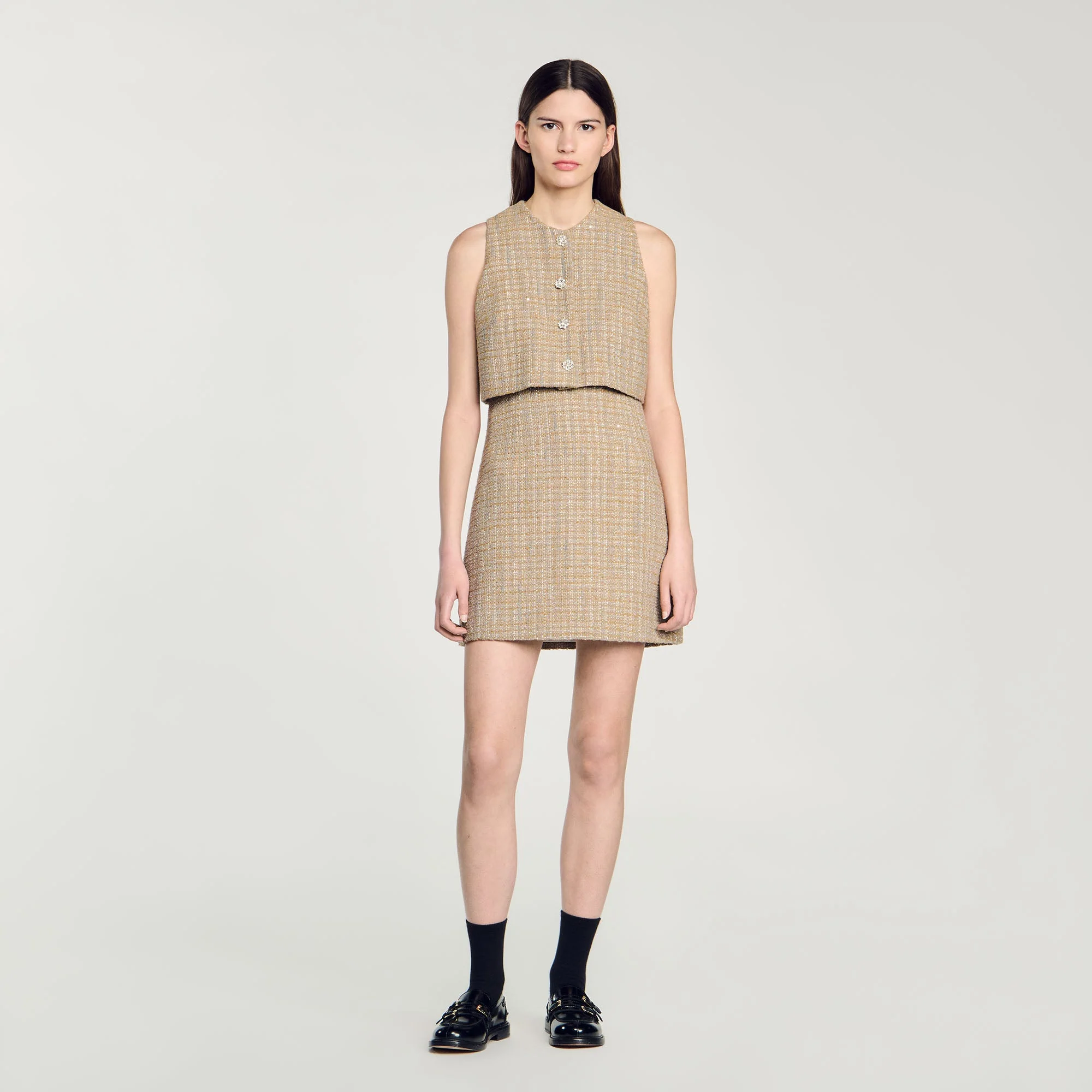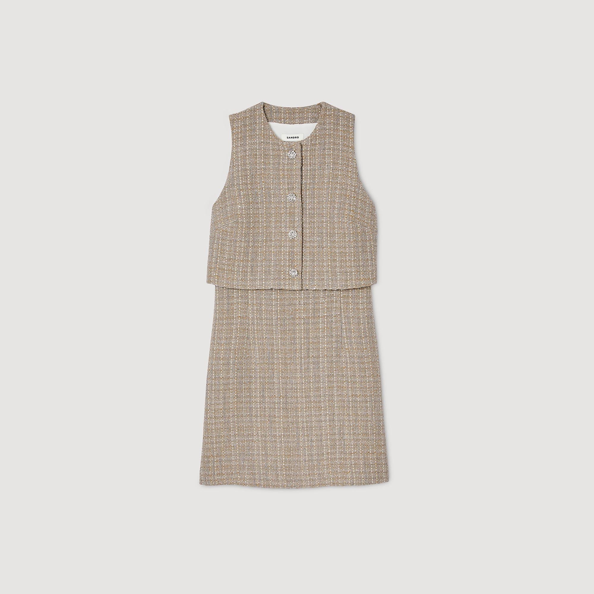 Vestido de tweed sin mangas efecto 2 en 1, con cuello redondo, parte superior tipo top con botones joya y falda corta y recta.
