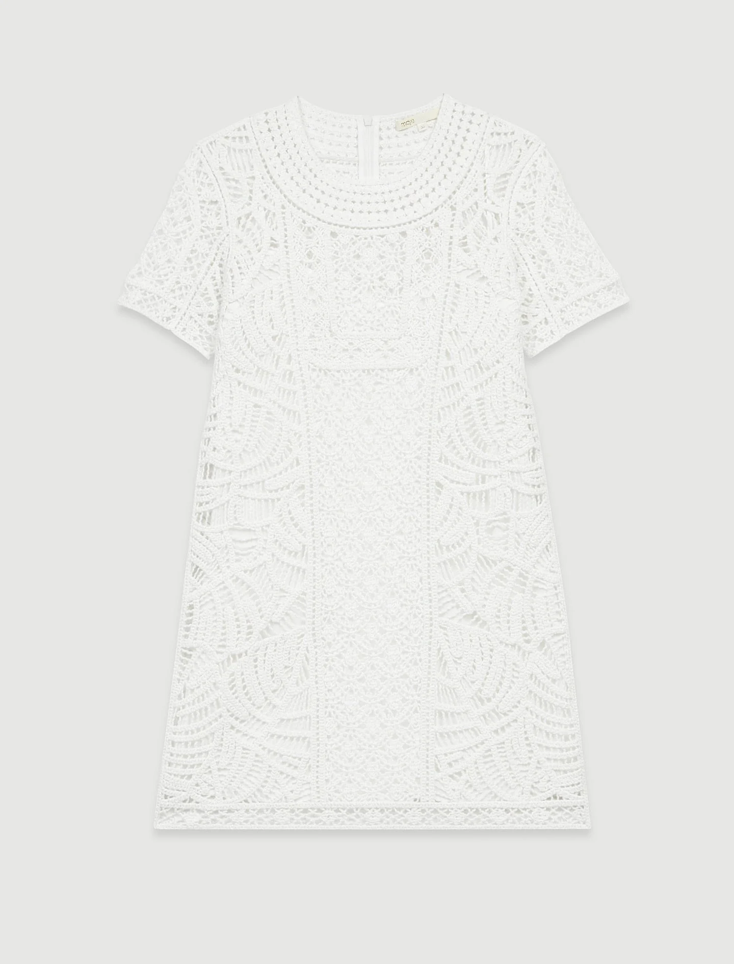 Vestido de corte recto y manga corta. Confeccionado íntegramente en algodón bordado estilo macramé blanco, le dará a tus looks un irresistible encanto de los 70.• 100% algodón