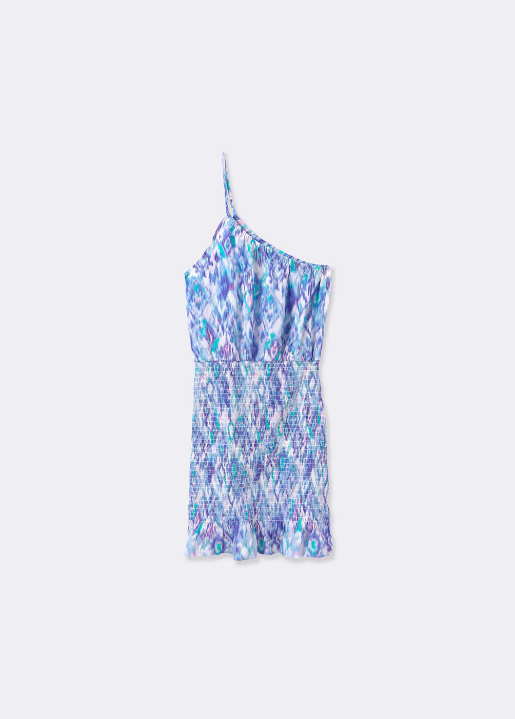 Vestido corto estampado asimétrico con un tirante, smock en la parte inferior y volantes.