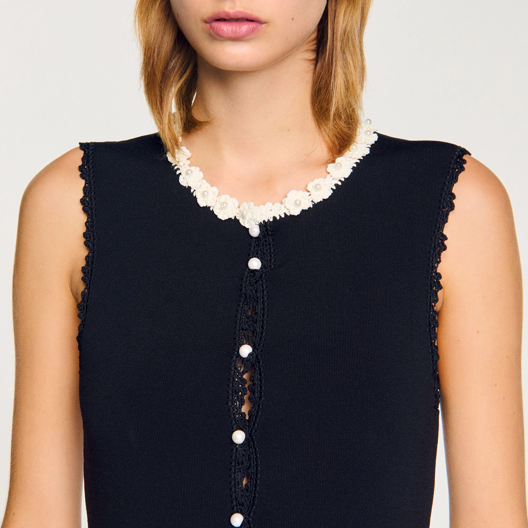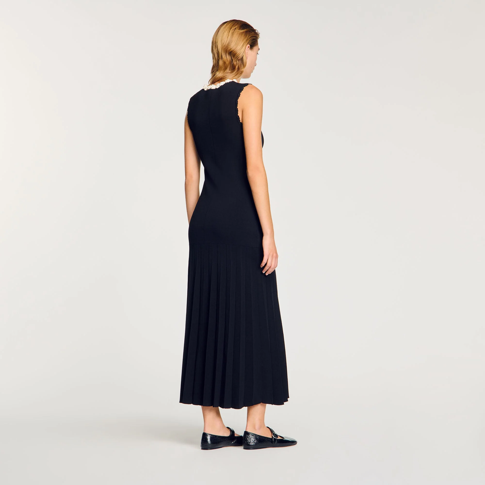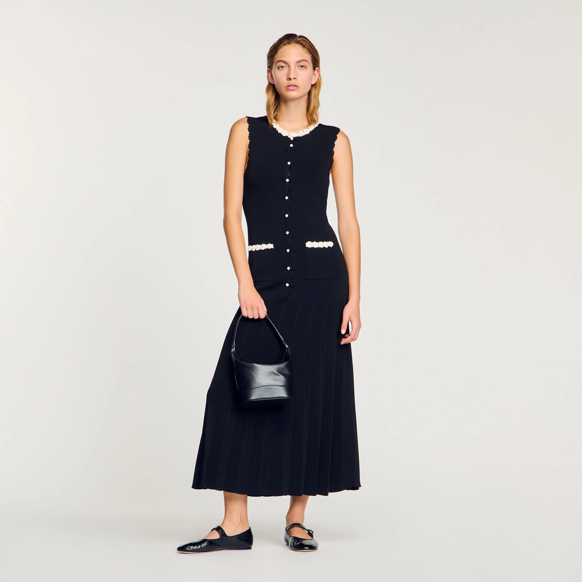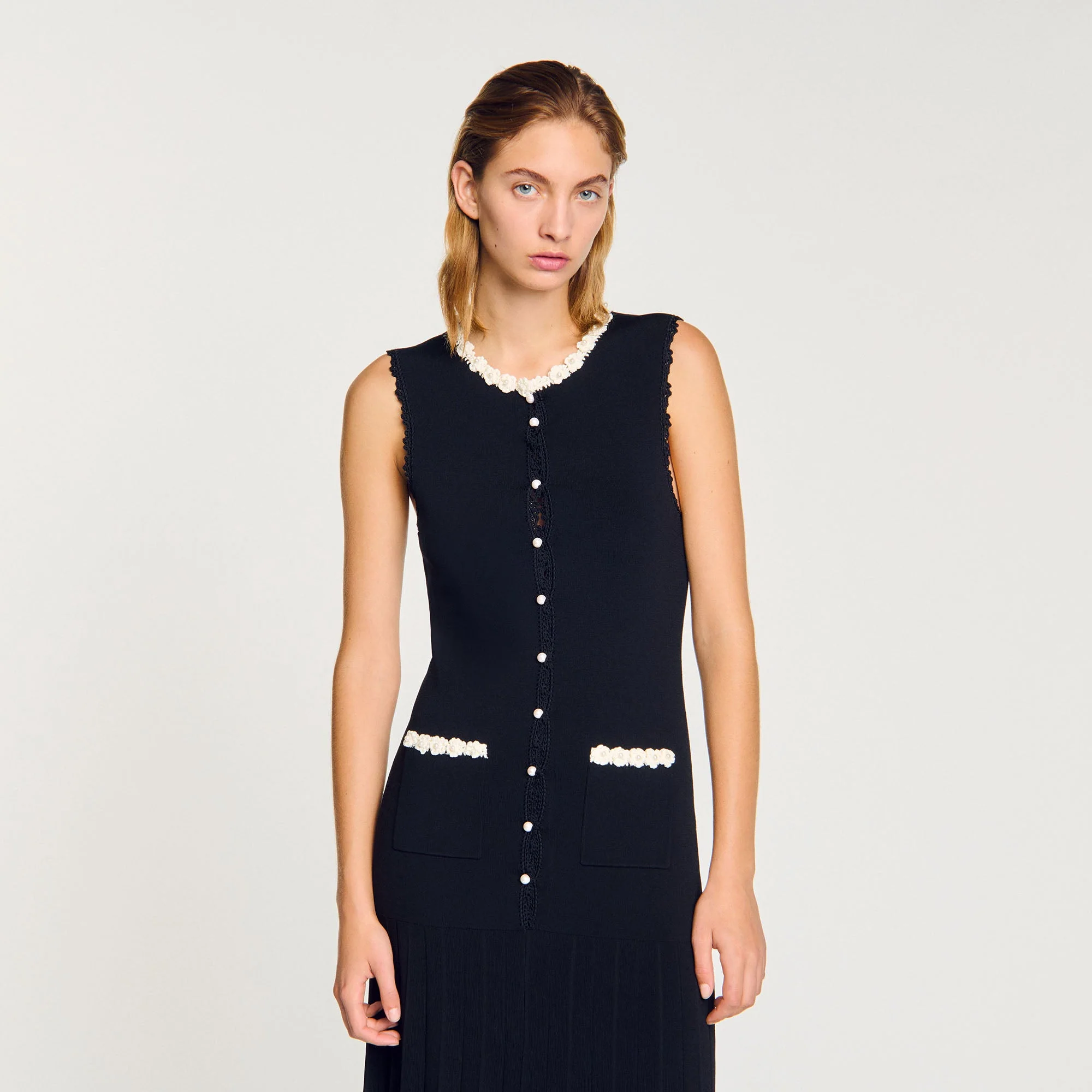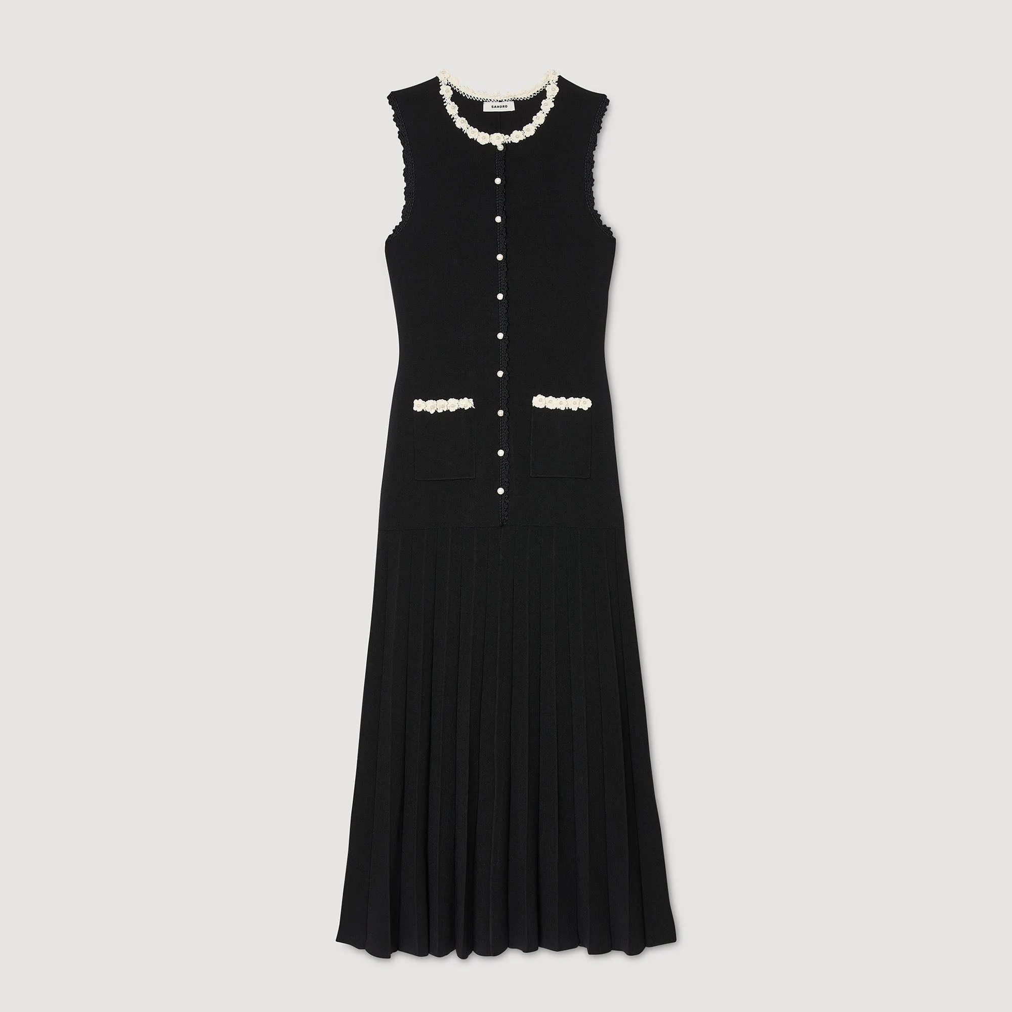 Vestido largo sin mangas de punto elástico con cuello redondo, tapeta de botones, falda plisada, bolsillos de parche y detalles de ganchillo en contraste en los bordes y los bolsillos
