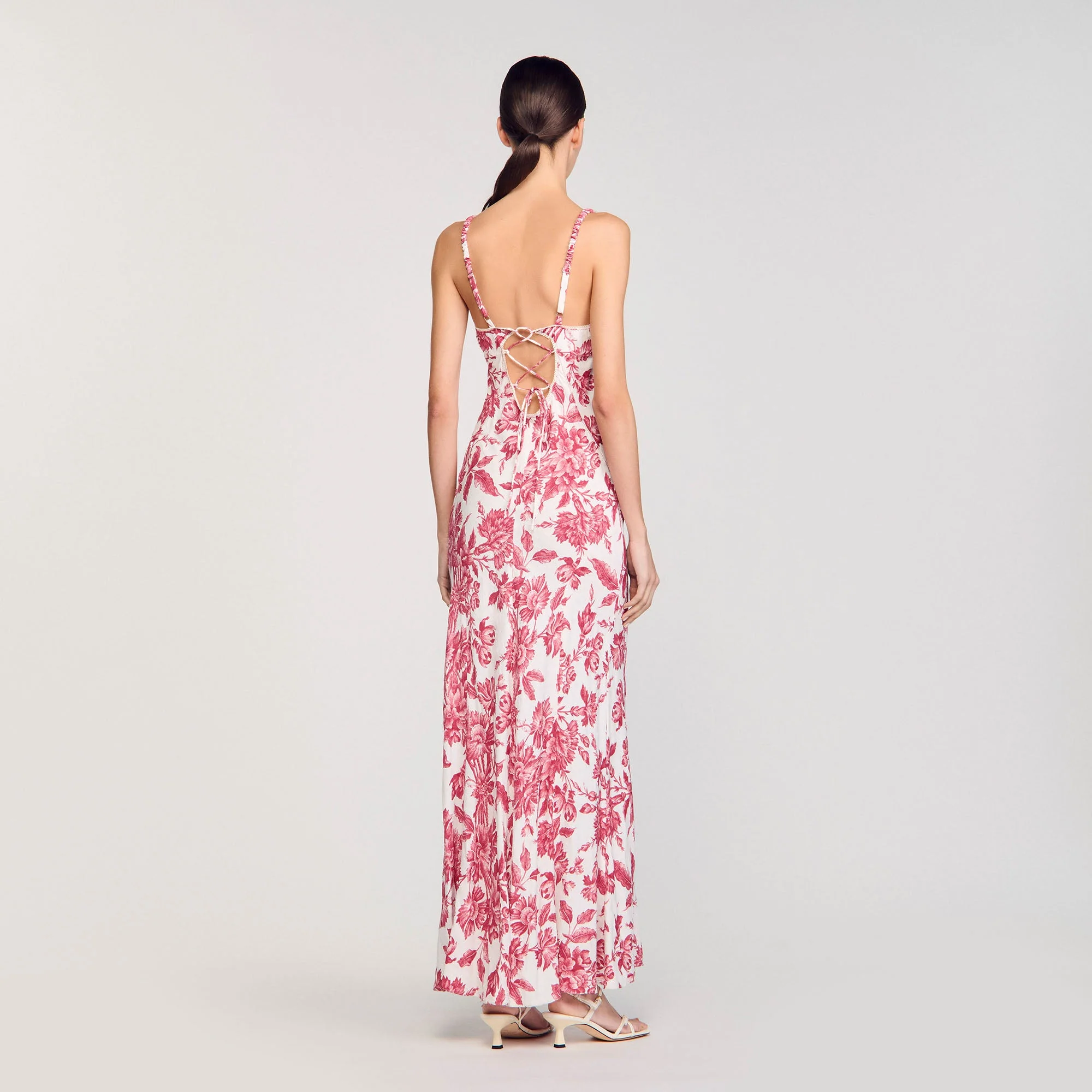 Vestido largo de estilo lencero con tirantes finos, escote estilo corsé y cordones en la espalda adornada con un estampado de flores.