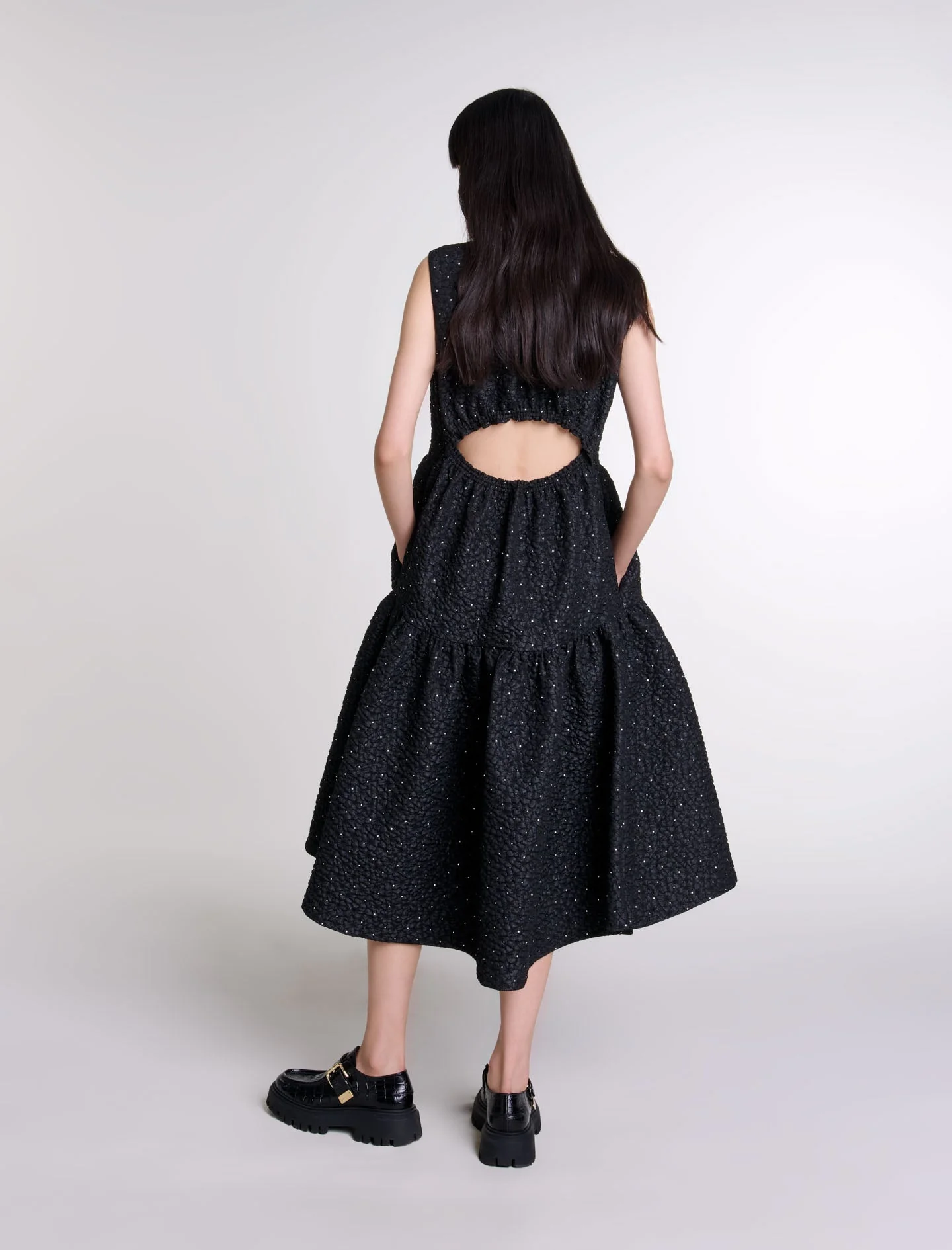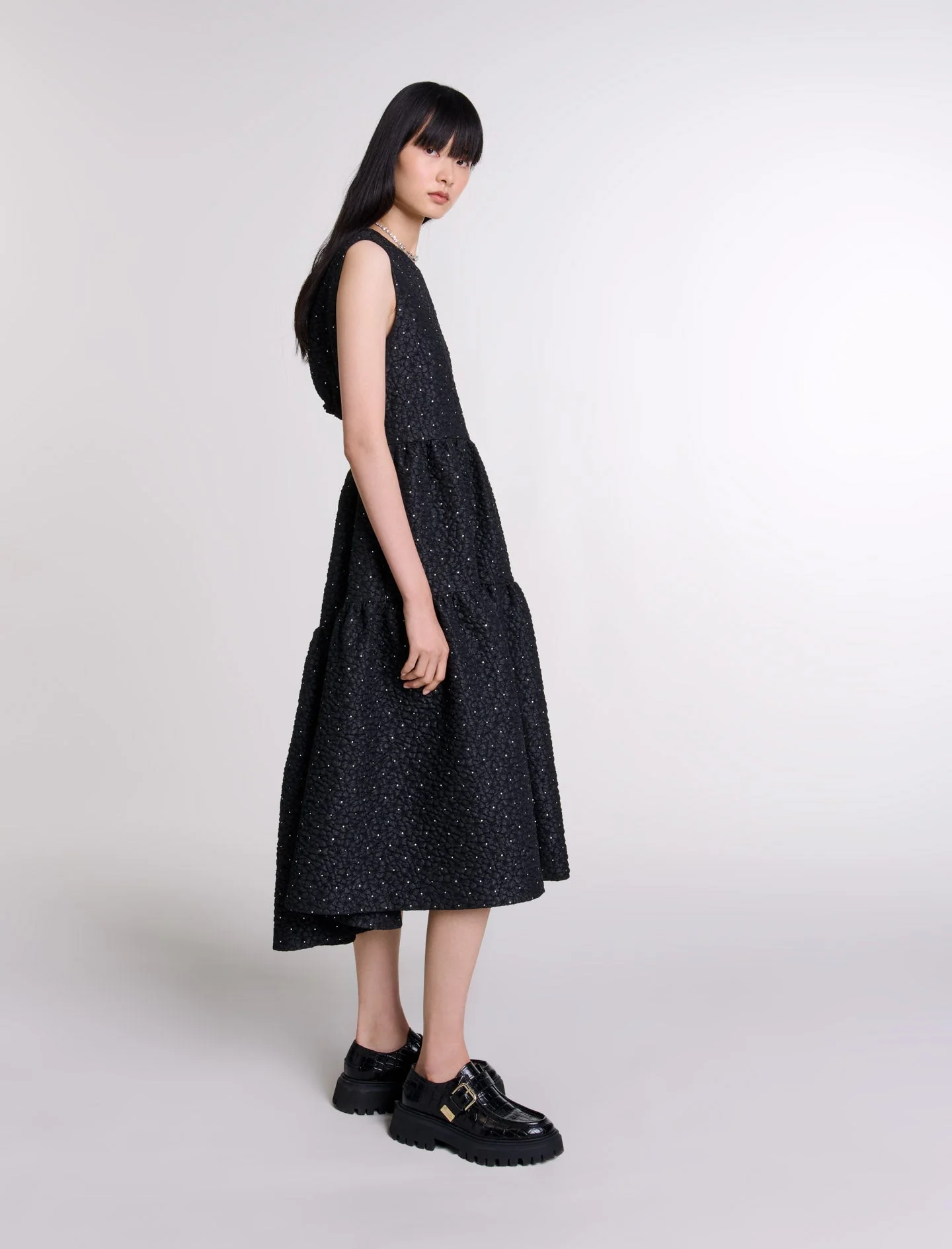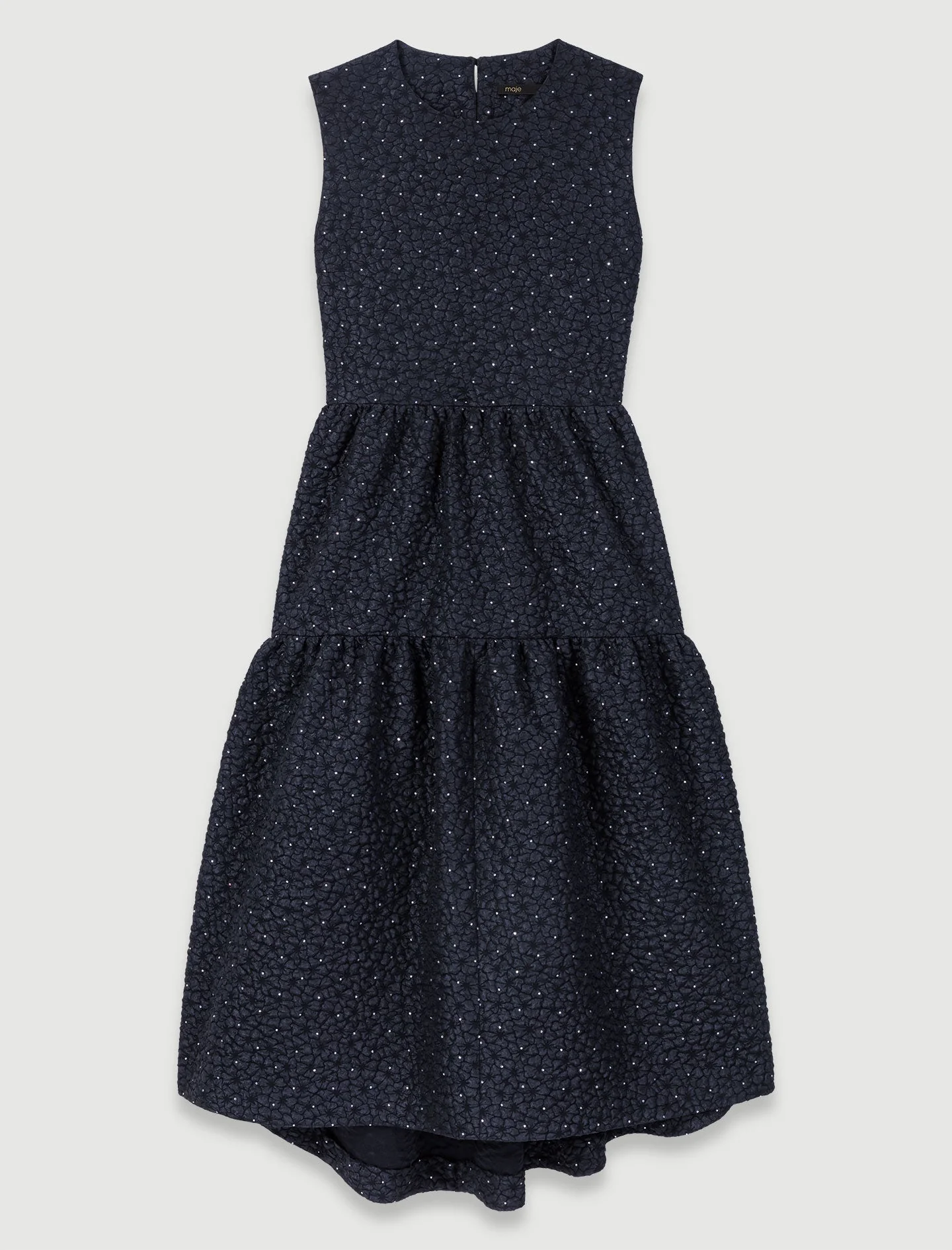 Este vestido largo sin mangas, adornado con flores texturizadas y piezas de strass plateadas, seduce con su falda acampanada con volumen.