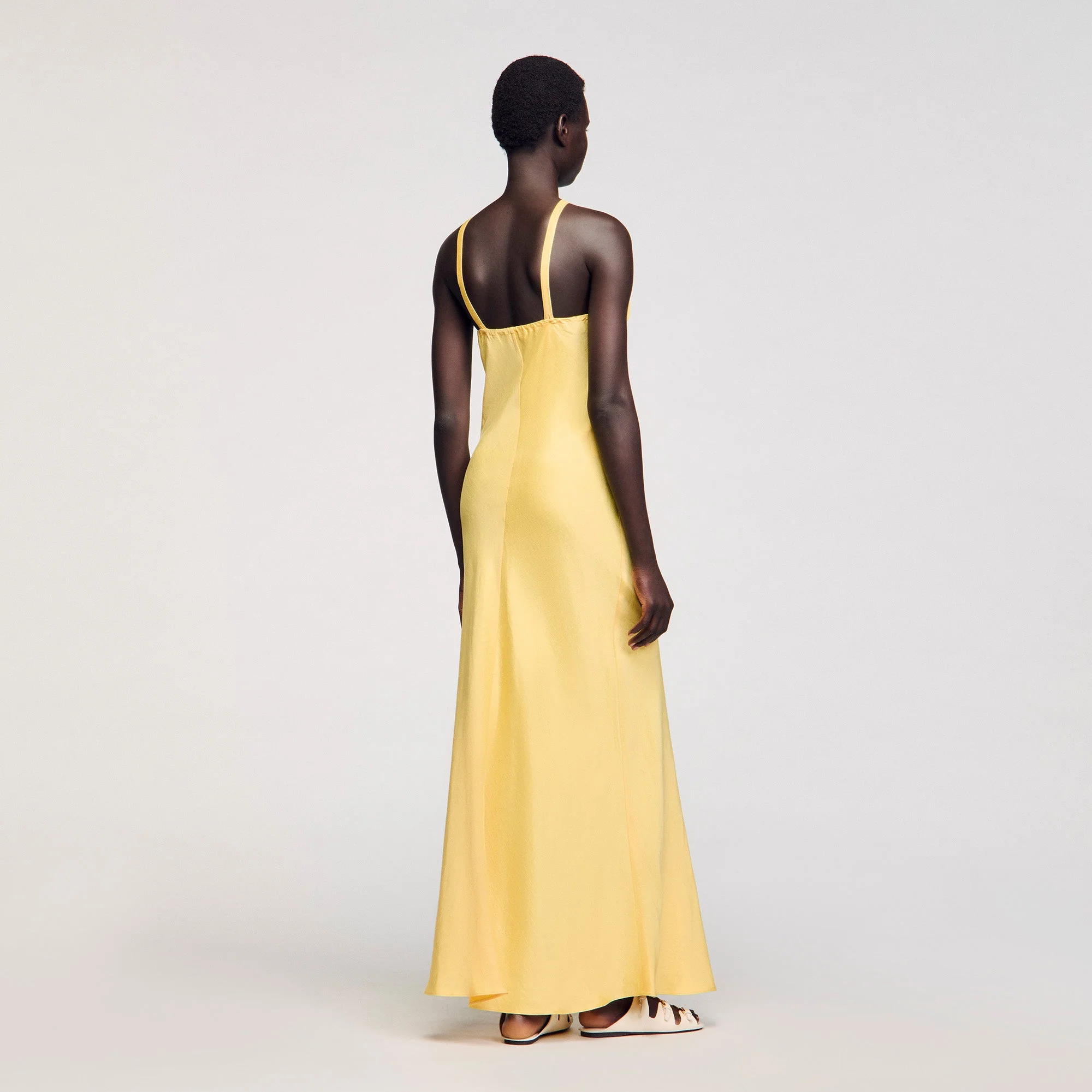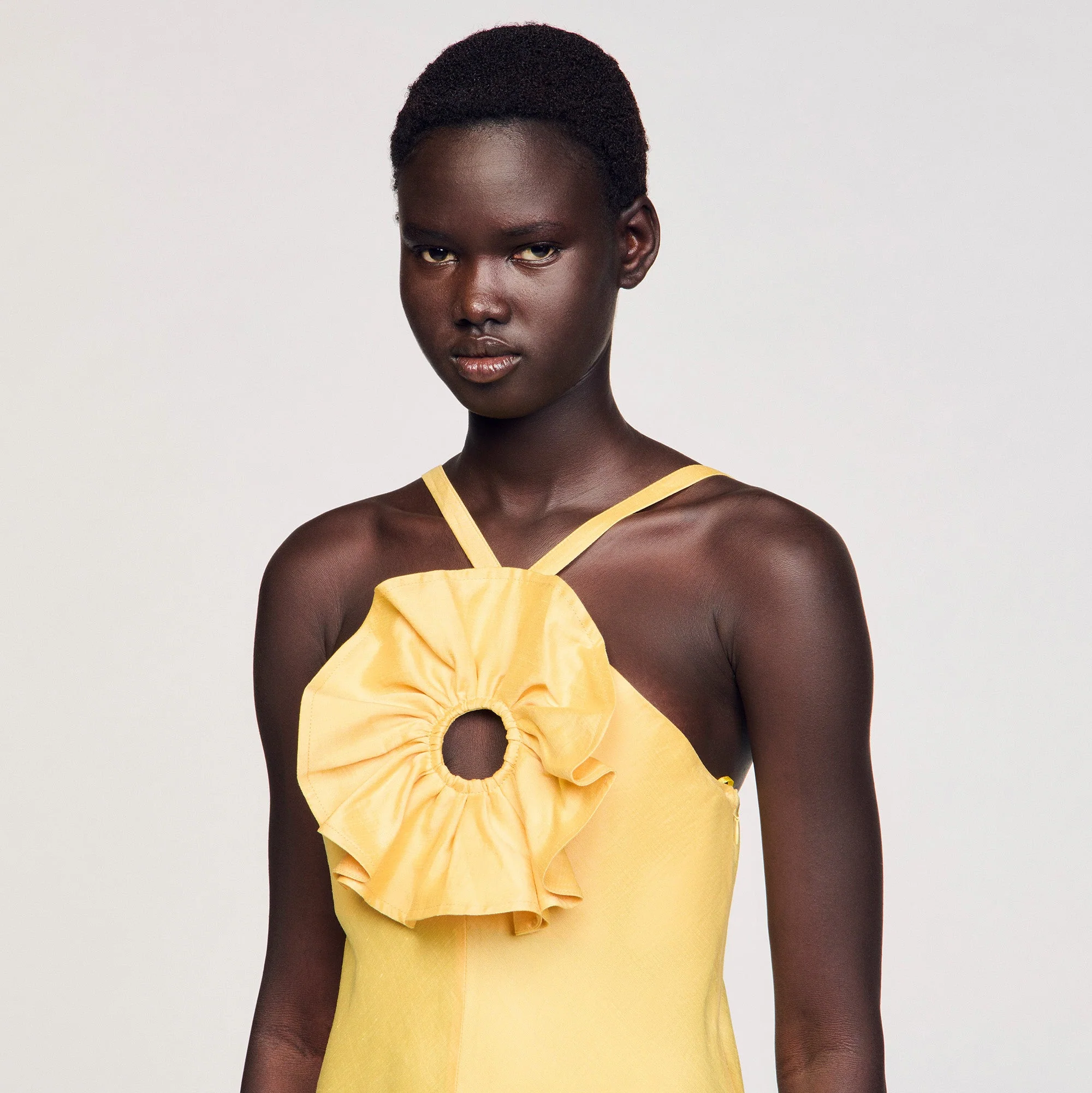 Vestido largo con lino, volante en el escote, bajo acampanado y tirantes ajustables.